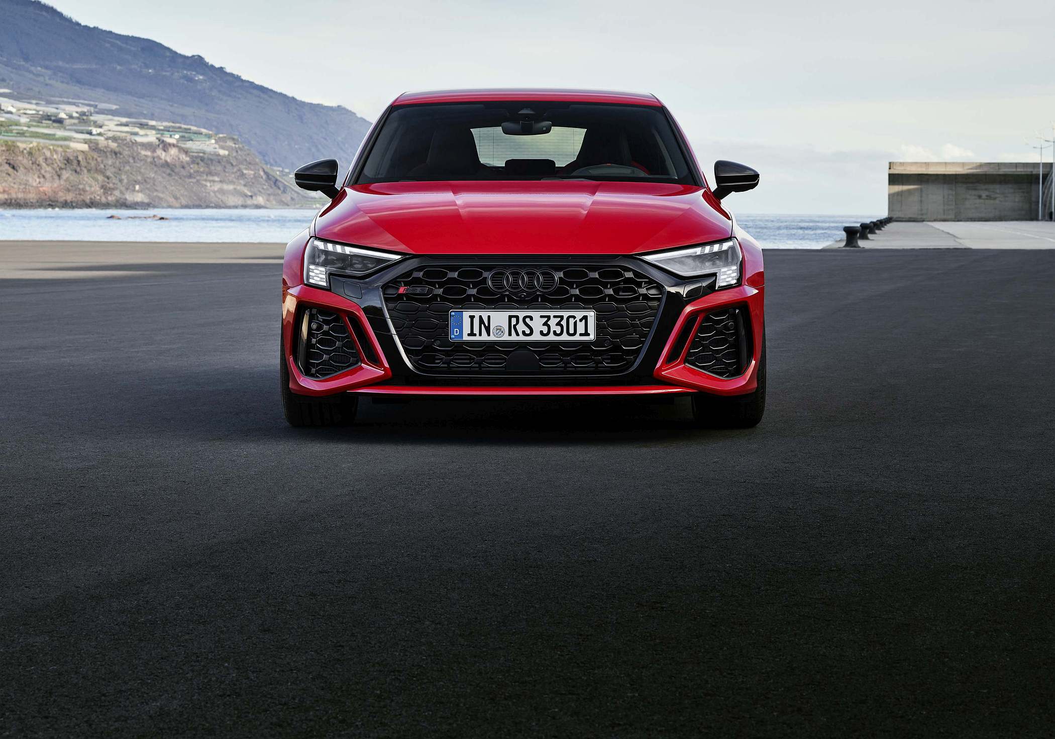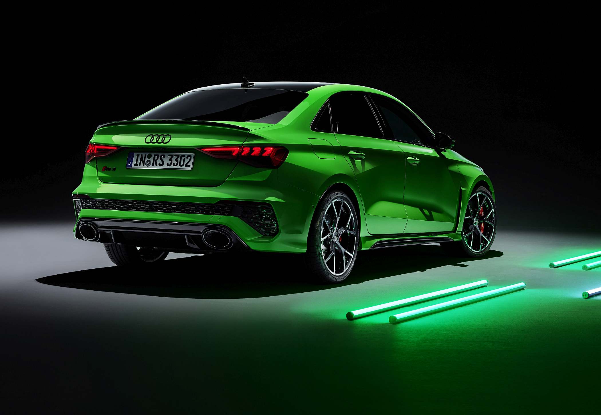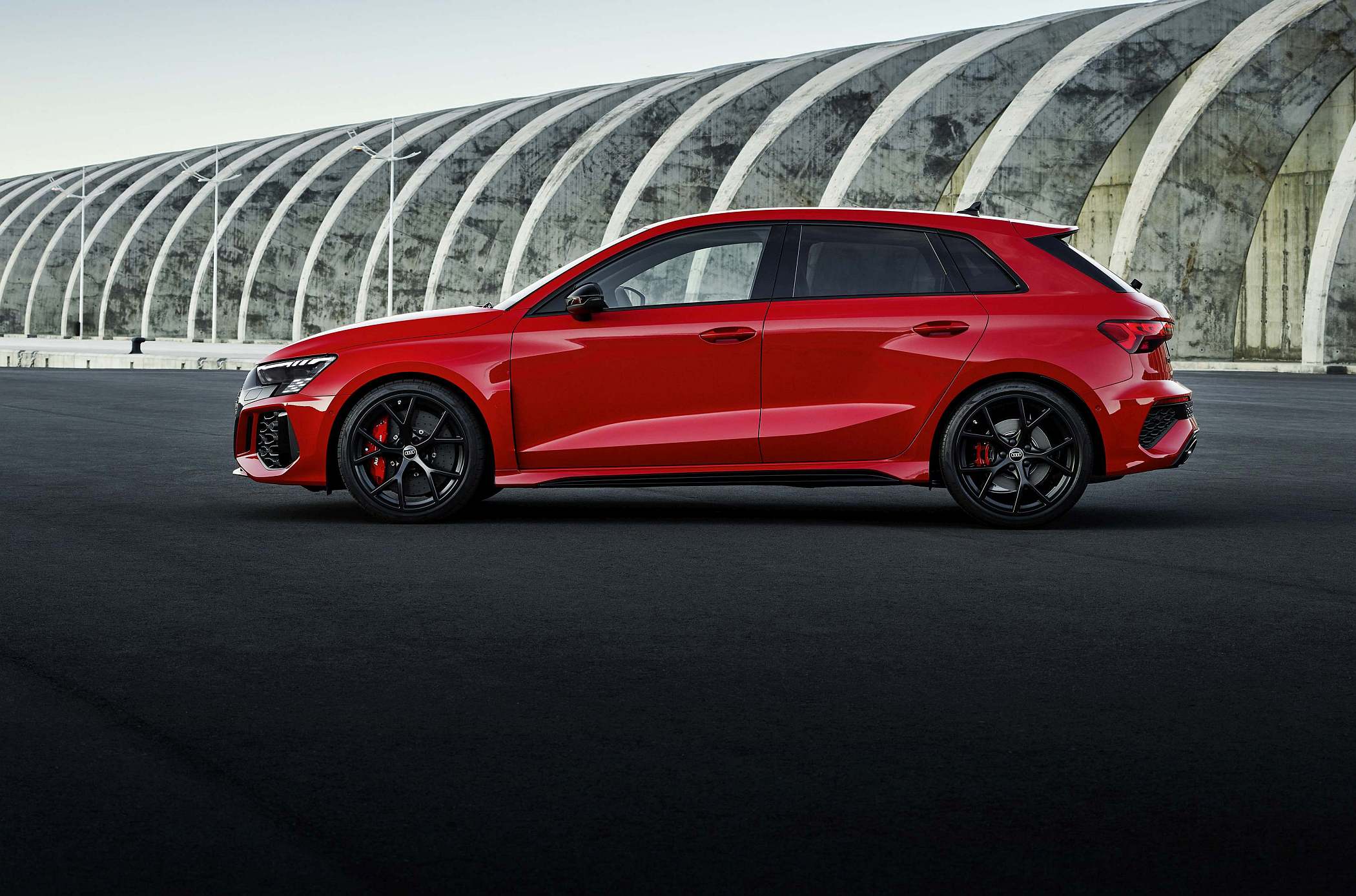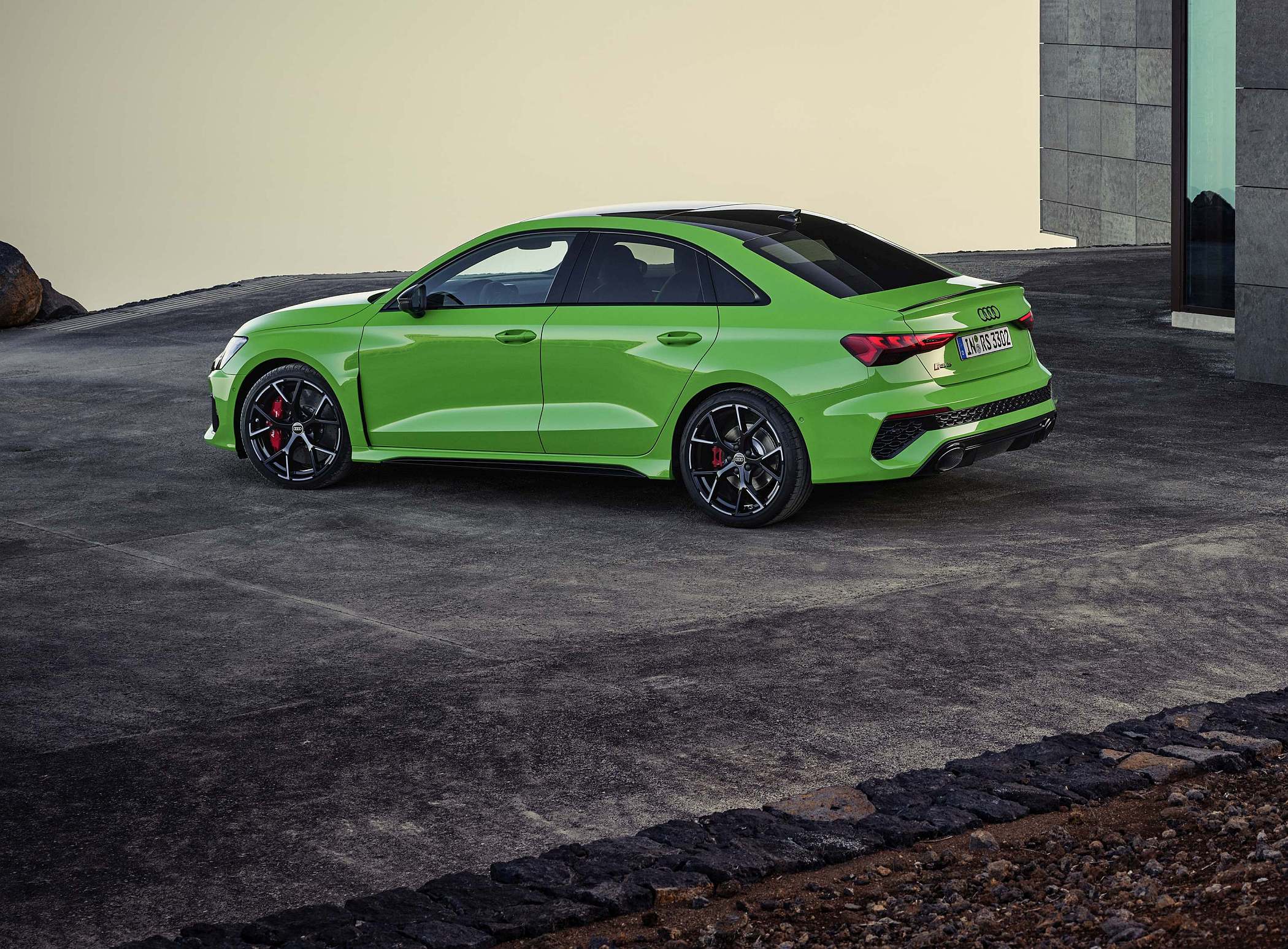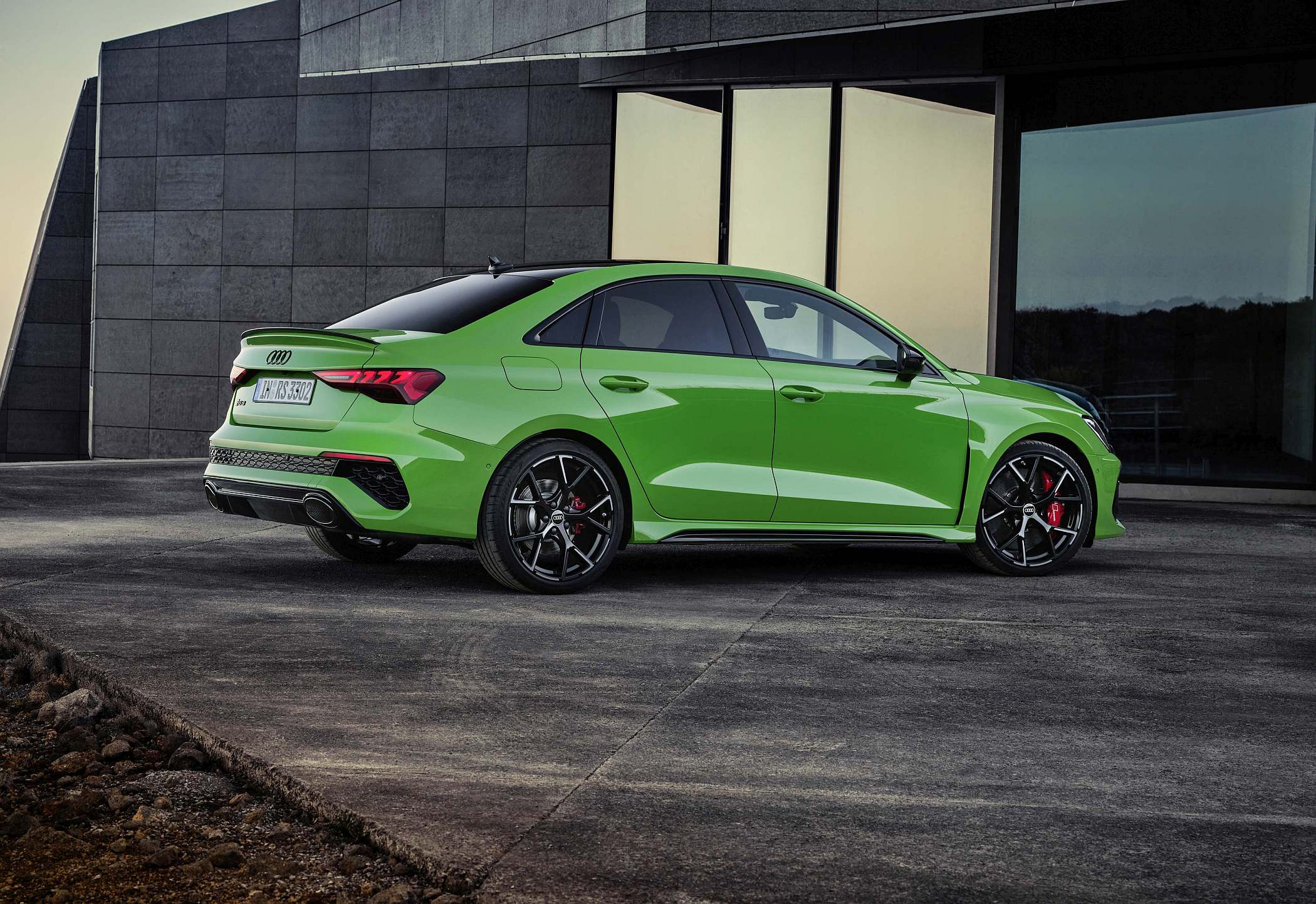 As jantes de 19 polegadas são igualmente específicas deste modelo, havendo logo após a cava da roda dianteira uma saída de ar derivada daquelas que são usadas no desporto automóvel. A saia lateral compõe o visual mais ‘racing’. Já na secção traseira, o destaque vai para o grande spoiler superior e para o para-choques específico com difusor integrado e uma grelha também única, em ambos os casos com coloração preto brilhante. As duas saídas de escape revelam o foco dinâmico do novo RS 3, que beneficia ainda de vias mais largas face ao antecessor – 33 mm no eixo dianteiro e 10 mm no traseiro.