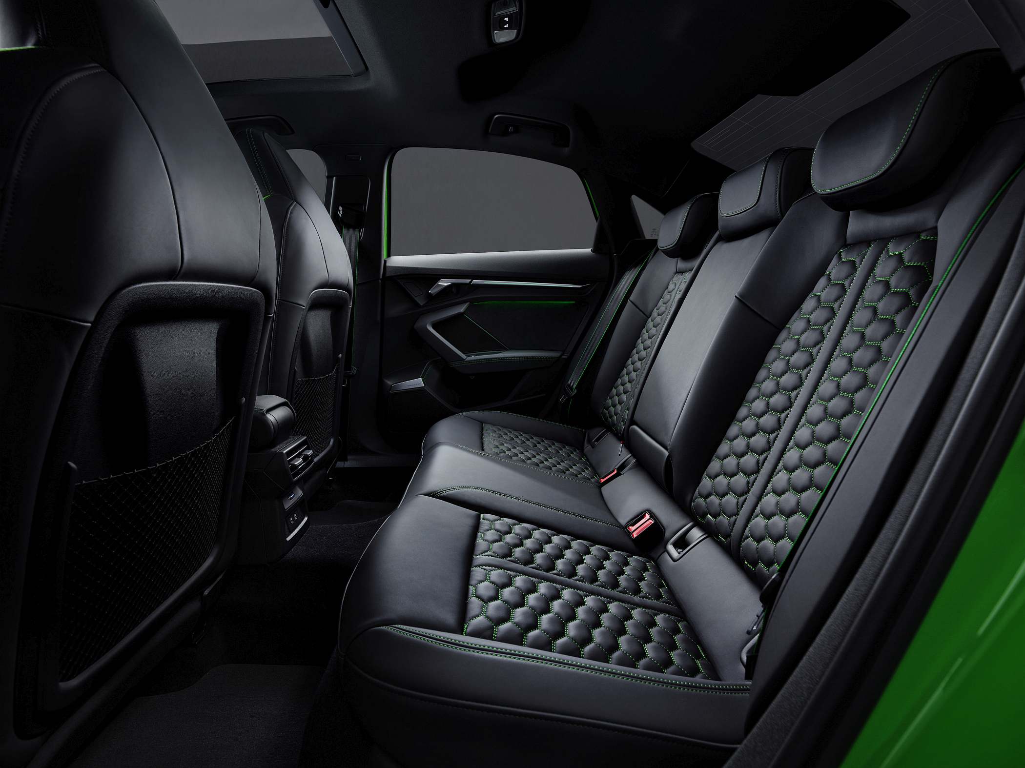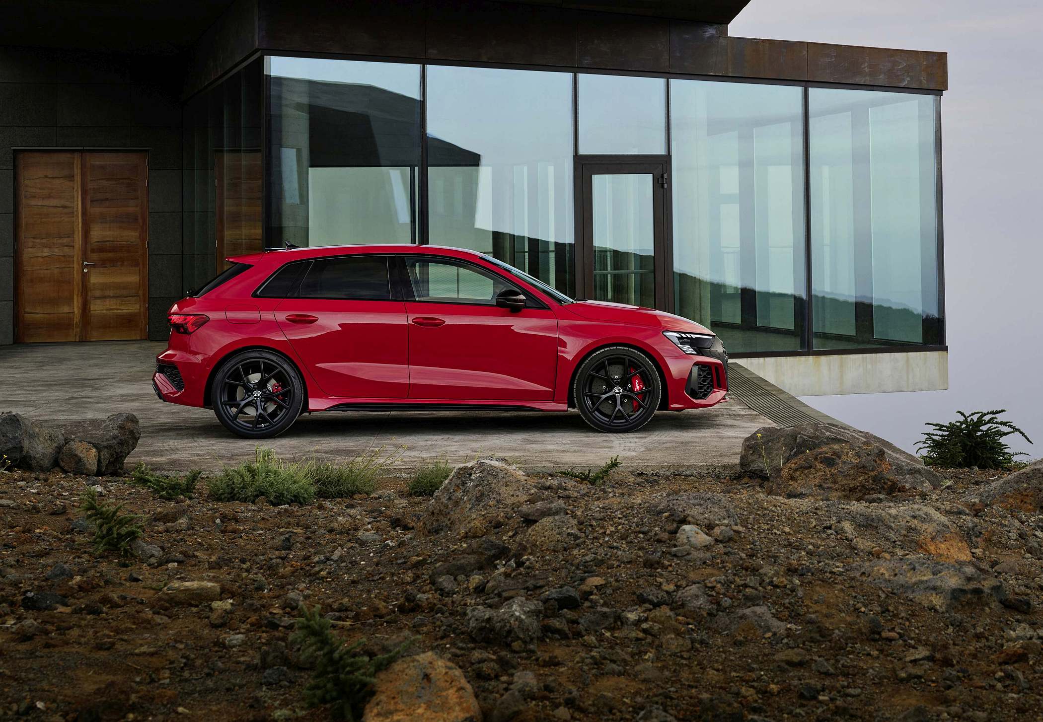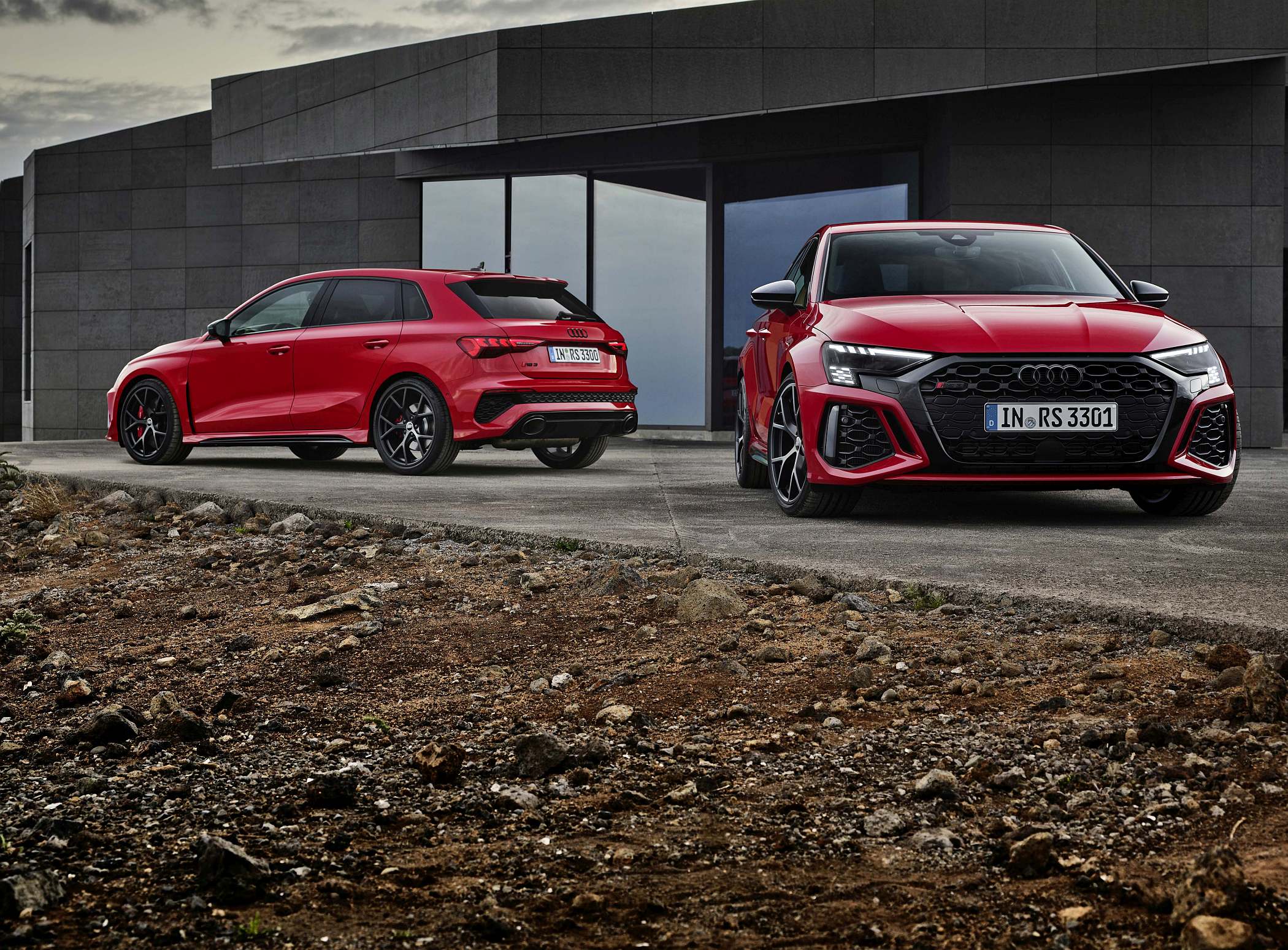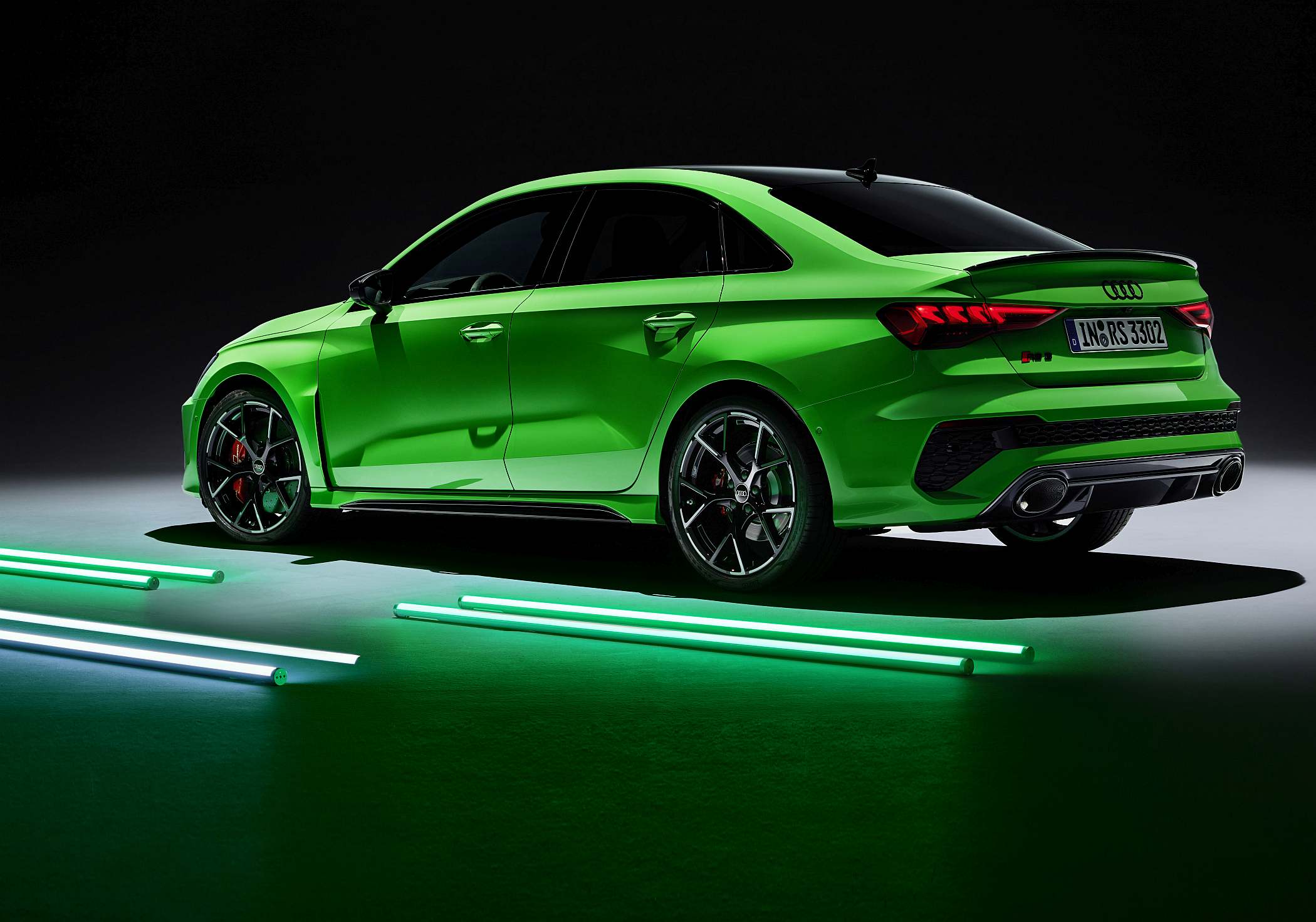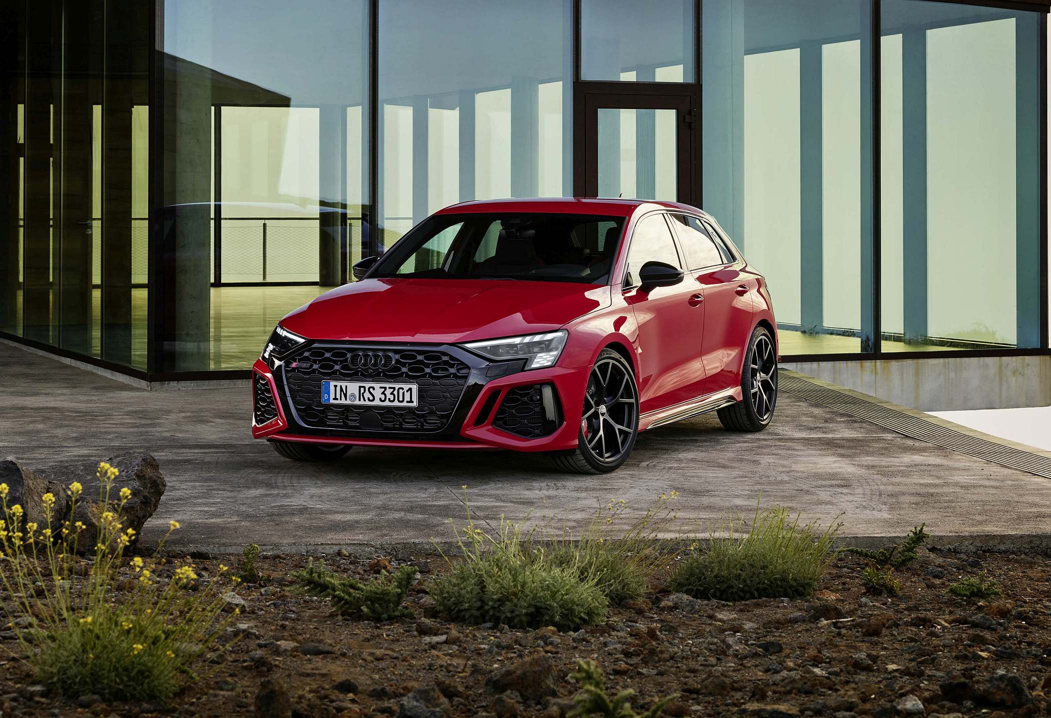 As jantes de 19 polegadas são igualmente específicas deste modelo, havendo logo após a cava da roda dianteira uma saída de ar derivada daquelas que são usadas no desporto automóvel. A saia lateral compõe o visual mais ‘racing’. Já na secção traseira, o destaque vai para o grande spoiler superior e para o para-choques específico com difusor integrado e uma grelha também única, em ambos os casos com coloração preto brilhante. As duas saídas de escape revelam o foco dinâmico do novo RS 3, que beneficia ainda de vias mais largas face ao antecessor – 33 mm no eixo dianteiro e 10 mm no traseiro.