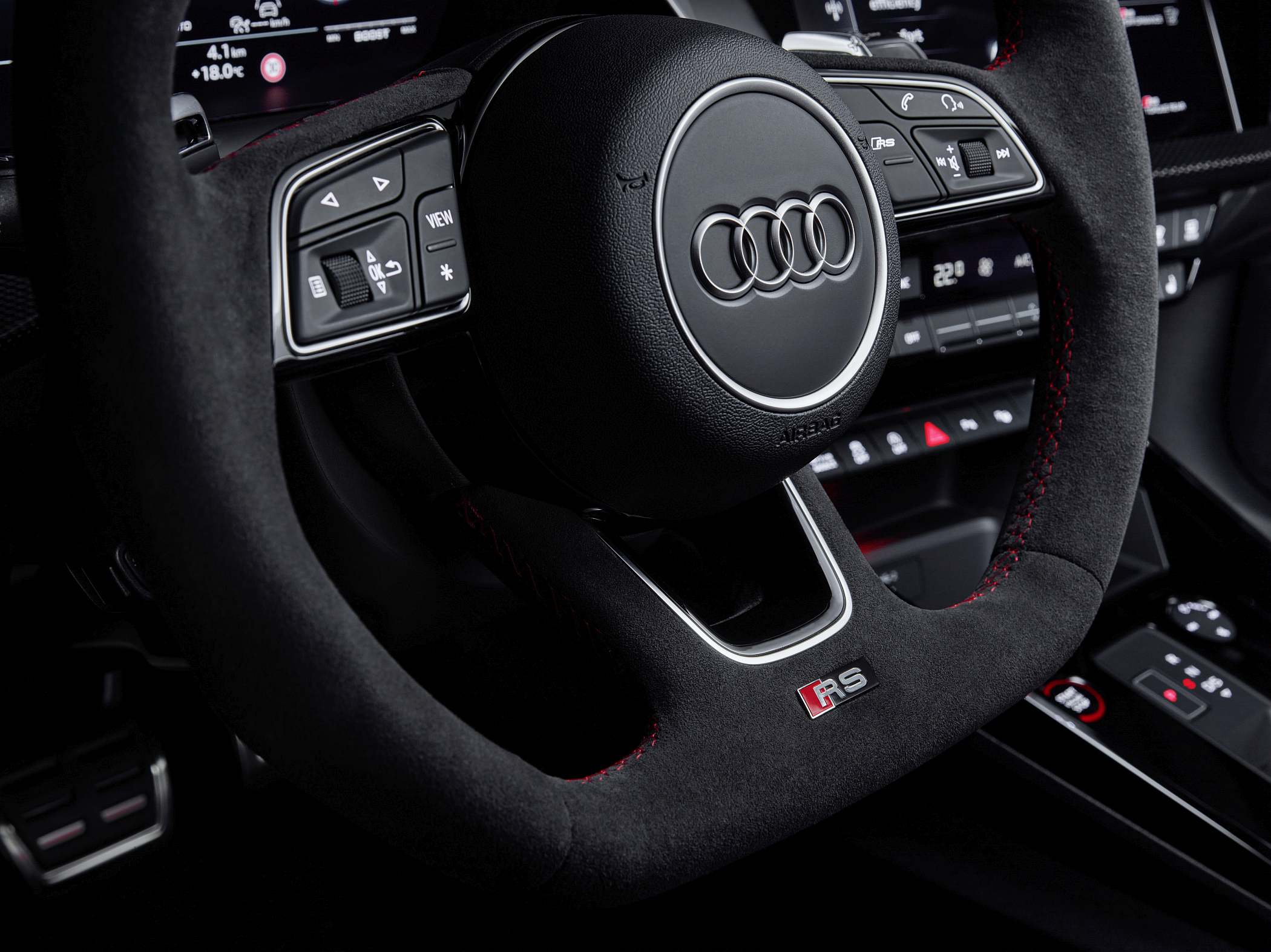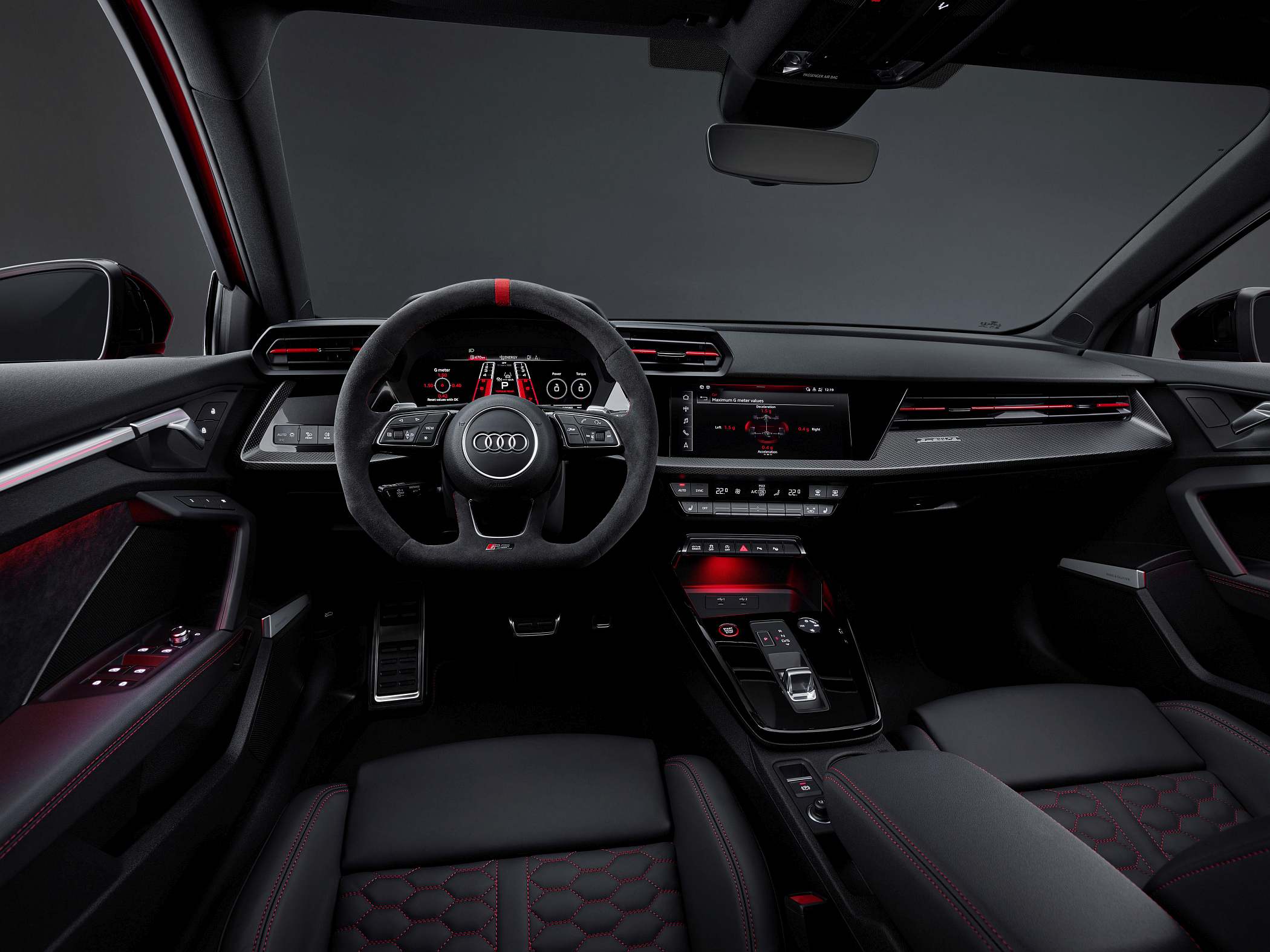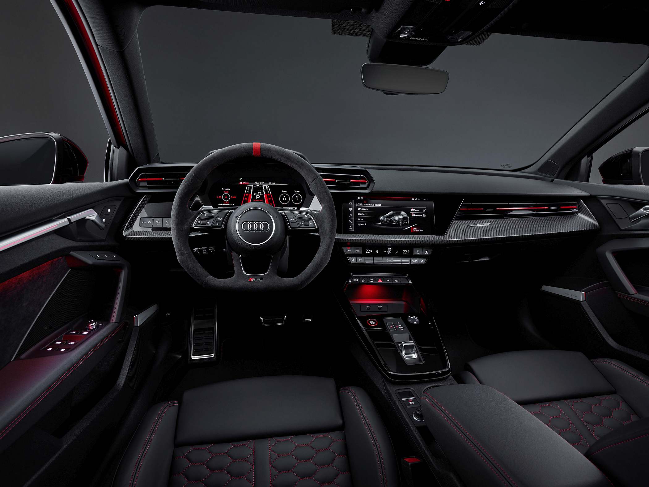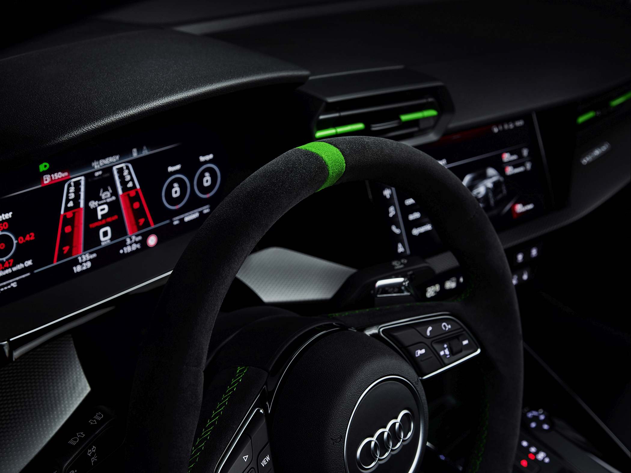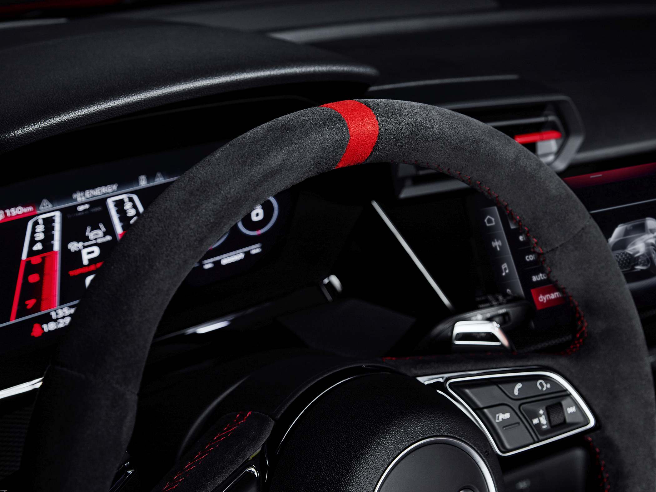 A bordo, a ideia foi oferecer um ambiente mais ligado às pistas, com muitos elementos próprios da linha RS. O condutor tem à sua frente um painel digital de 12.3 polegadas (Audi virtual cockpit plus), que surge de série e que apresenta diferentes informações consoante o modo escolhido. Por exemplo, opcionalmente, o conta-rotações é apresentado como uma espécie de pista de descolagem (‘RS Runway’). O sistema Audi virtual cockpit plus oferece ainda visualizações de forças de gravidade, tempos por volta e aceleração dos zero aos 100 km/h e dos zero aos 200 km/h, entre outros dados. Há também uma luz indicadora para subida de mudança no caso de transmissão manual – de verde para amarelo até vermelho – como num modelo de competição. Uma vez mais, os dois mundos a darem mãos. Disponível está também o ‘head-up display’ para apresentação das informações diretamente à frente do condutor.