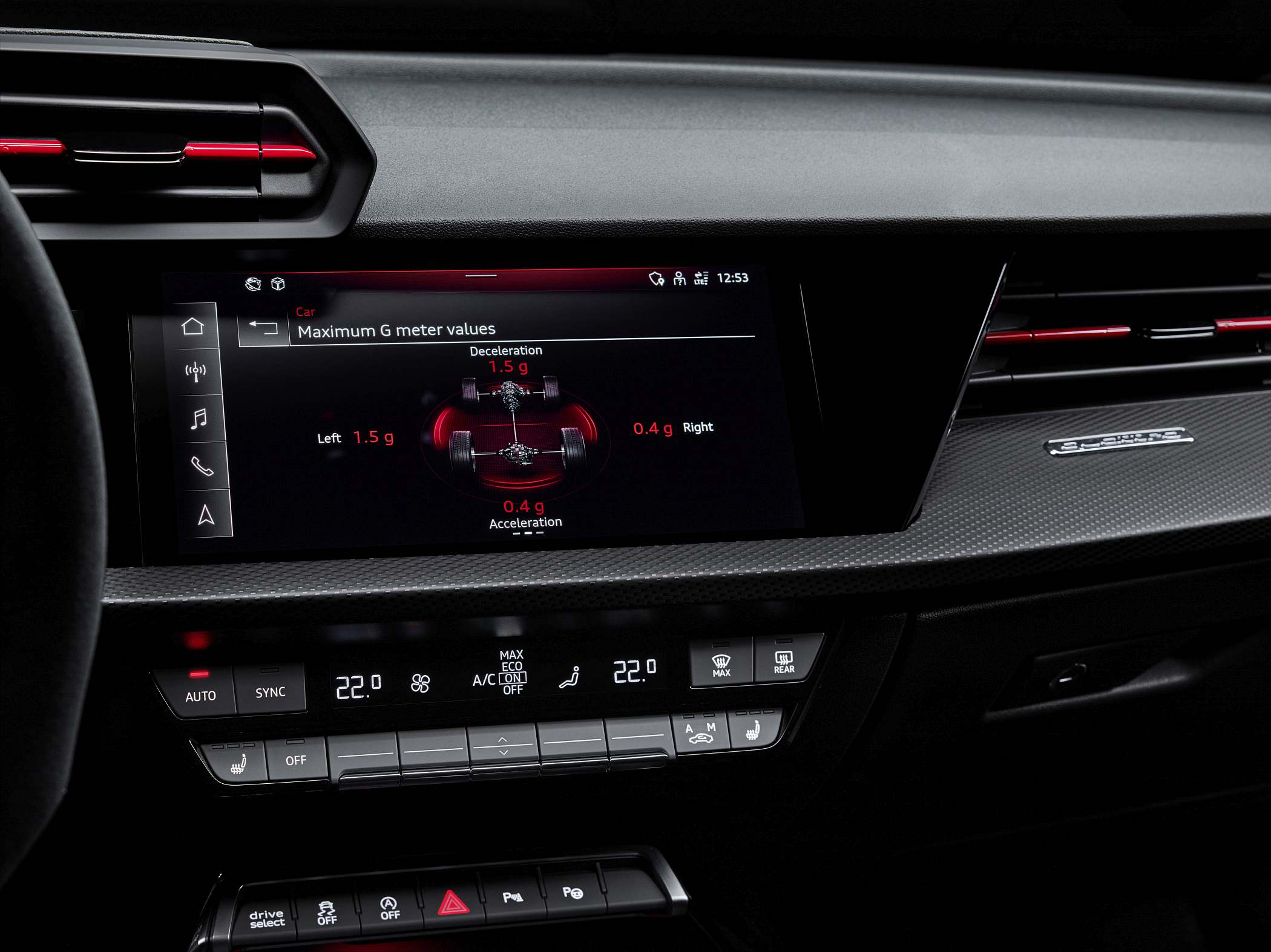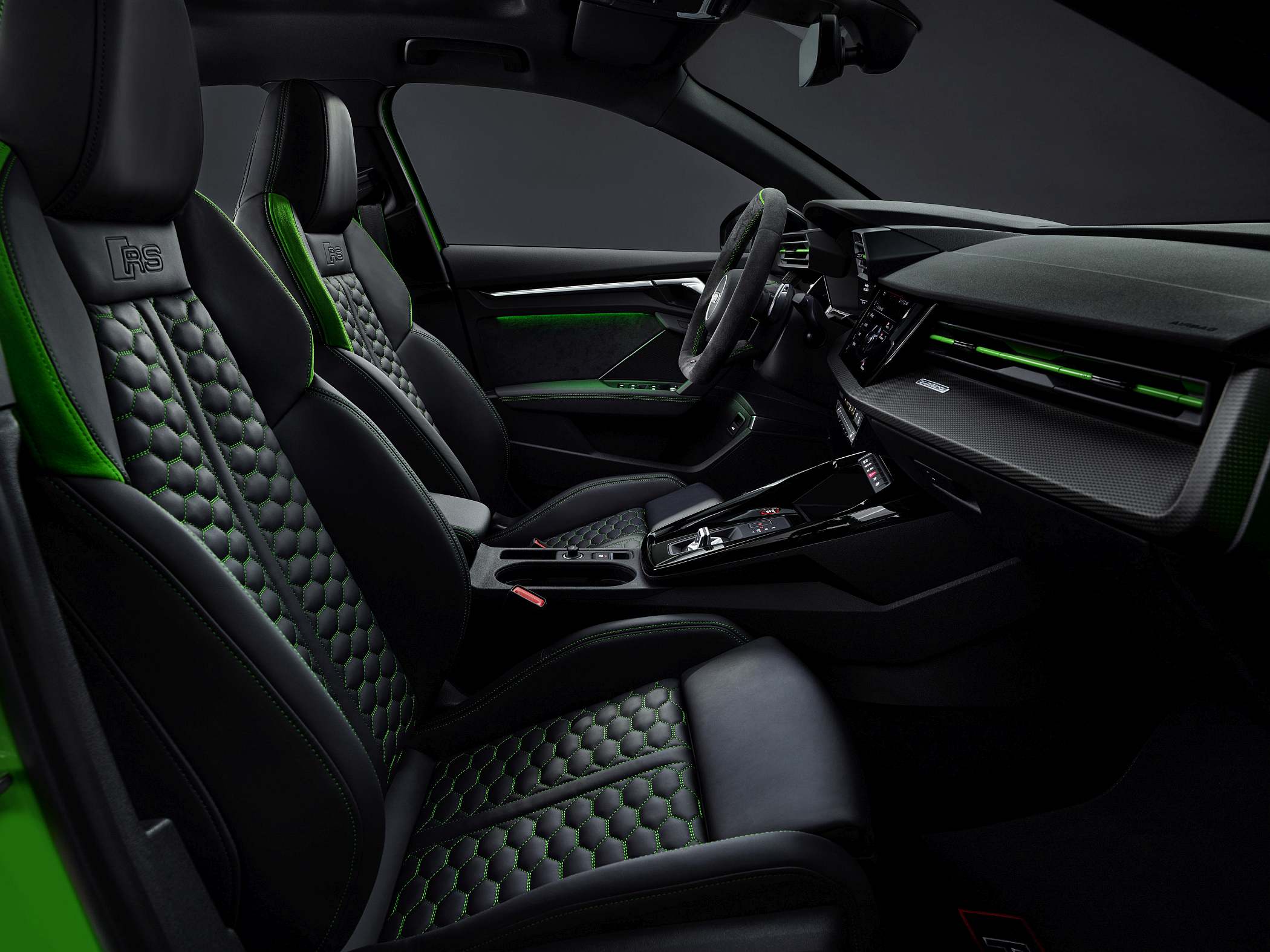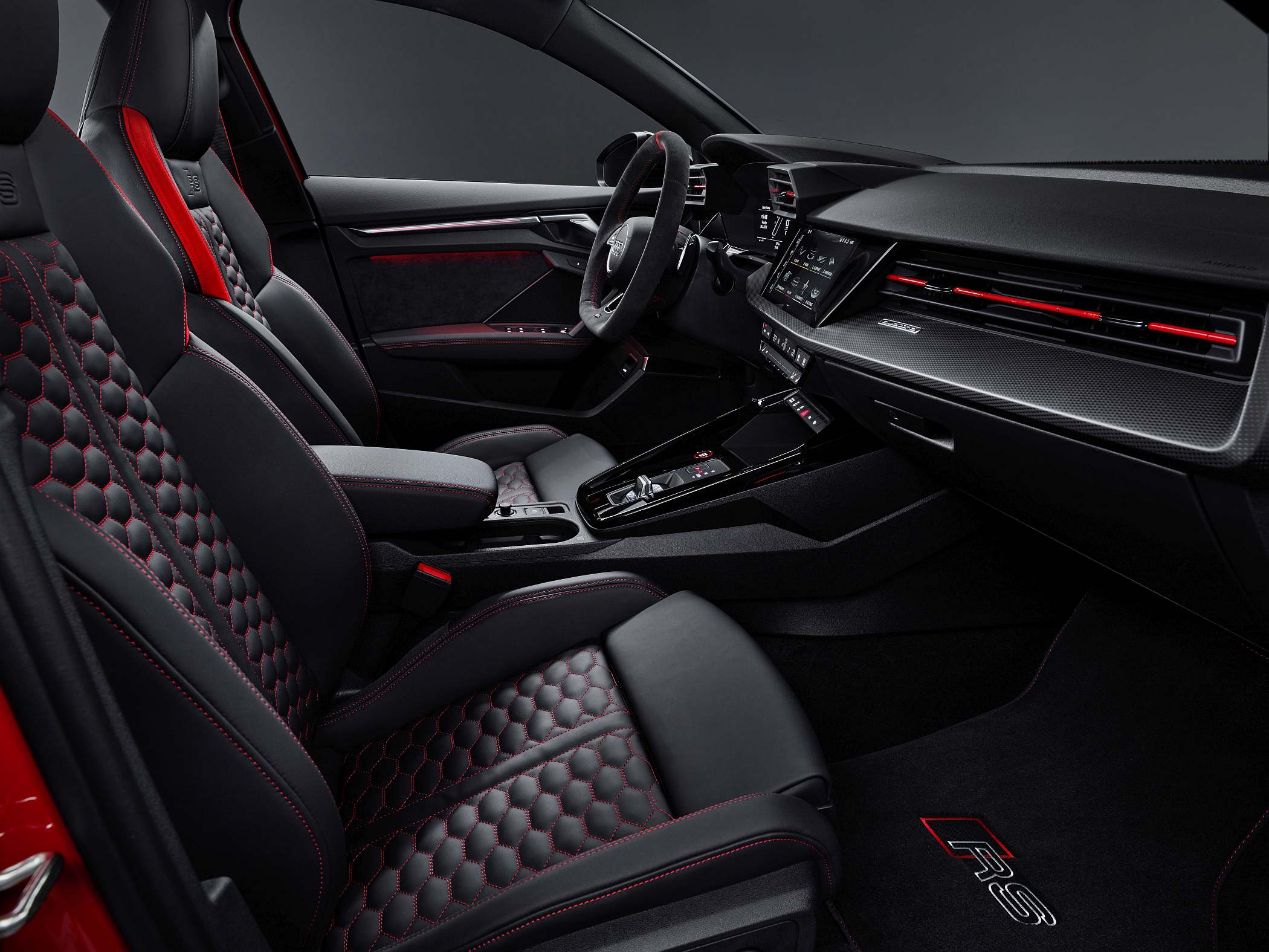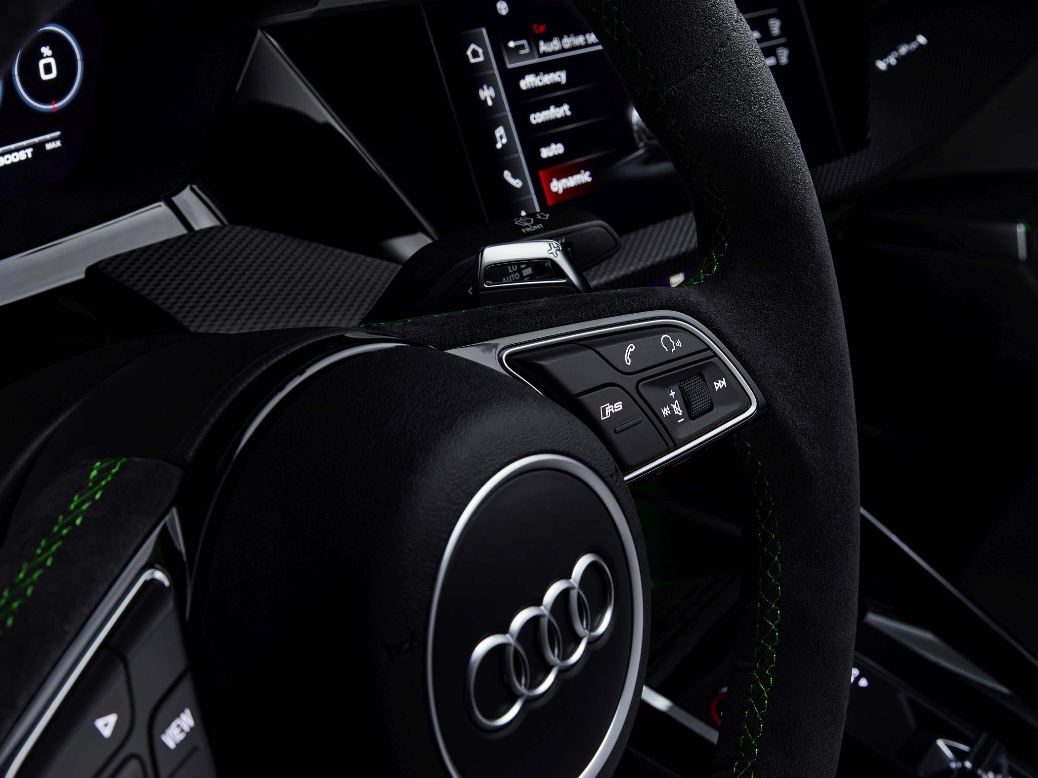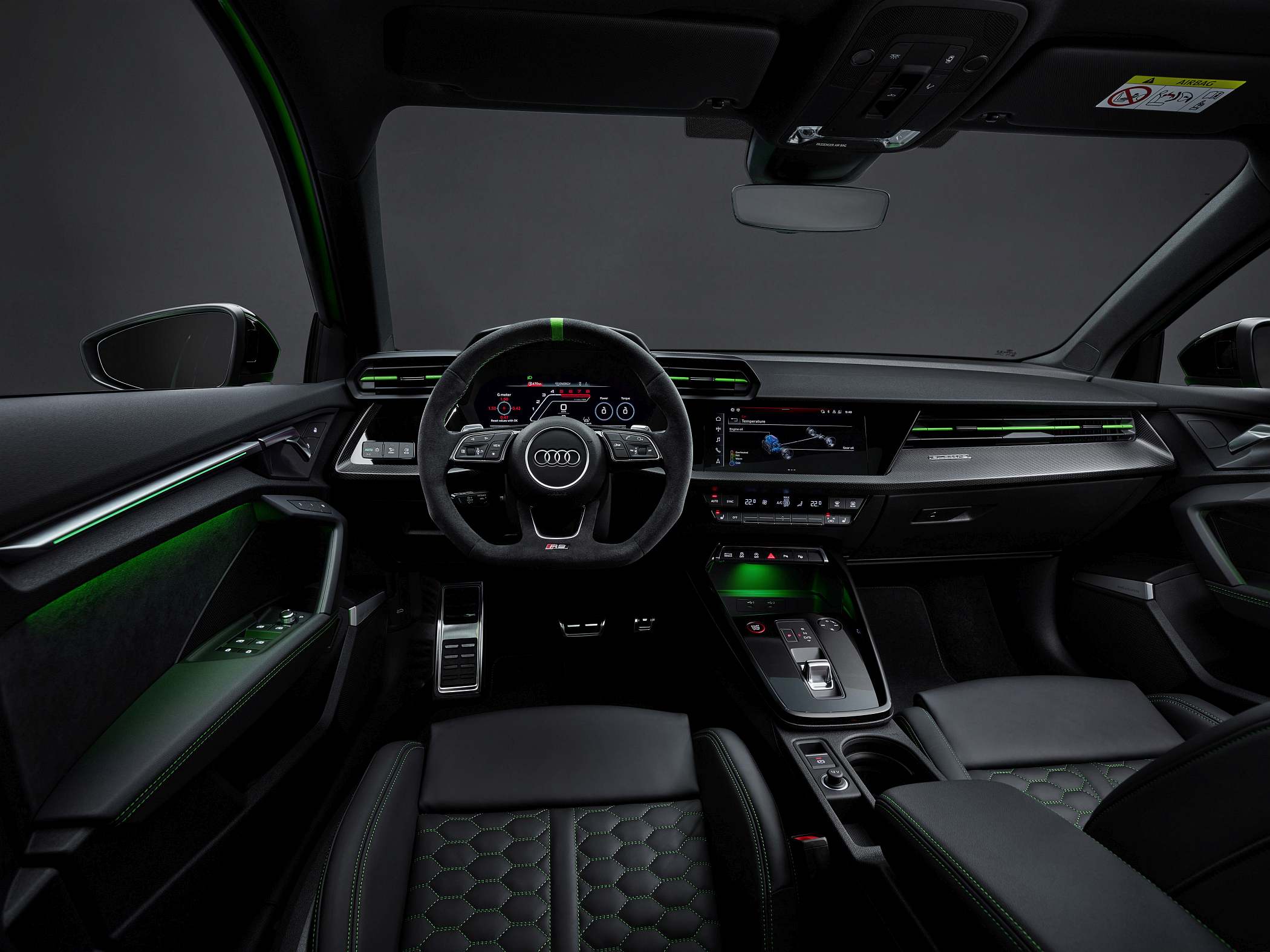 A bordo, a ideia foi oferecer um ambiente mais ligado às pistas, com muitos elementos próprios da linha RS. O condutor tem à sua frente um painel digital de 12.3 polegadas (Audi virtual cockpit plus), que surge de série e que apresenta diferentes informações consoante o modo escolhido. Por exemplo, opcionalmente, o conta-rotações é apresentado como uma espécie de pista de descolagem (‘RS Runway’). O sistema Audi virtual cockpit plus oferece ainda visualizações de forças de gravidade, tempos por volta e aceleração dos zero aos 100 km/h e dos zero aos 200 km/h, entre outros dados. Há também uma luz indicadora para subida de mudança no caso de transmissão manual – de verde para amarelo até vermelho – como num modelo de competição. Uma vez mais, os dois mundos a darem mãos. Disponível está também o ‘head-up display’ para apresentação das informações diretamente à frente do condutor.