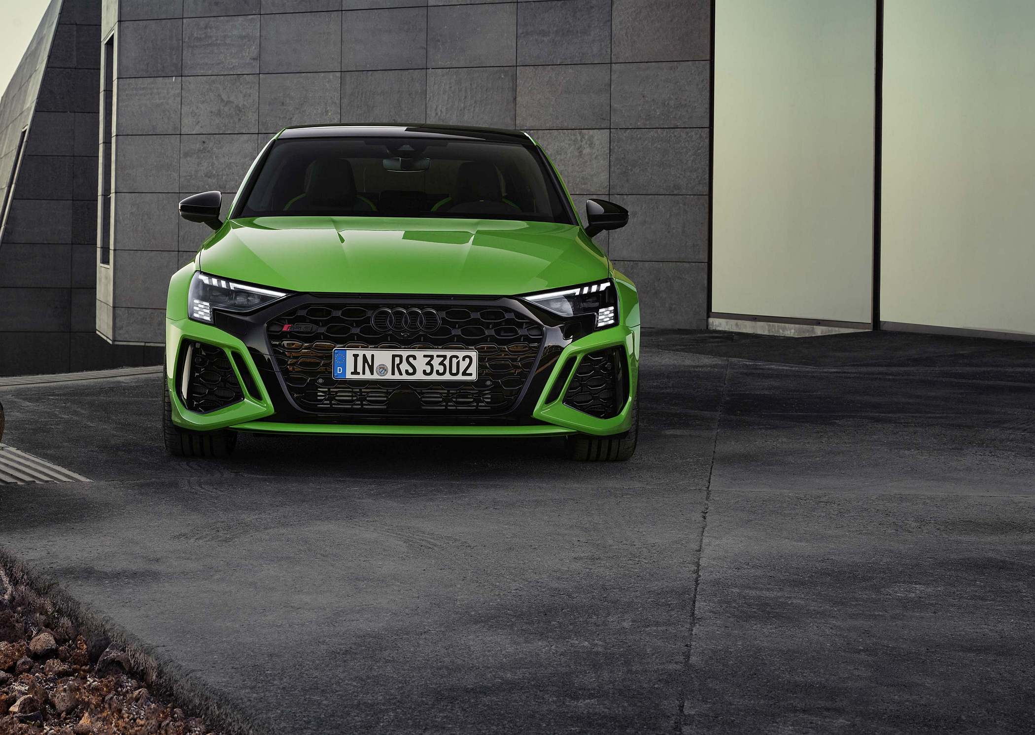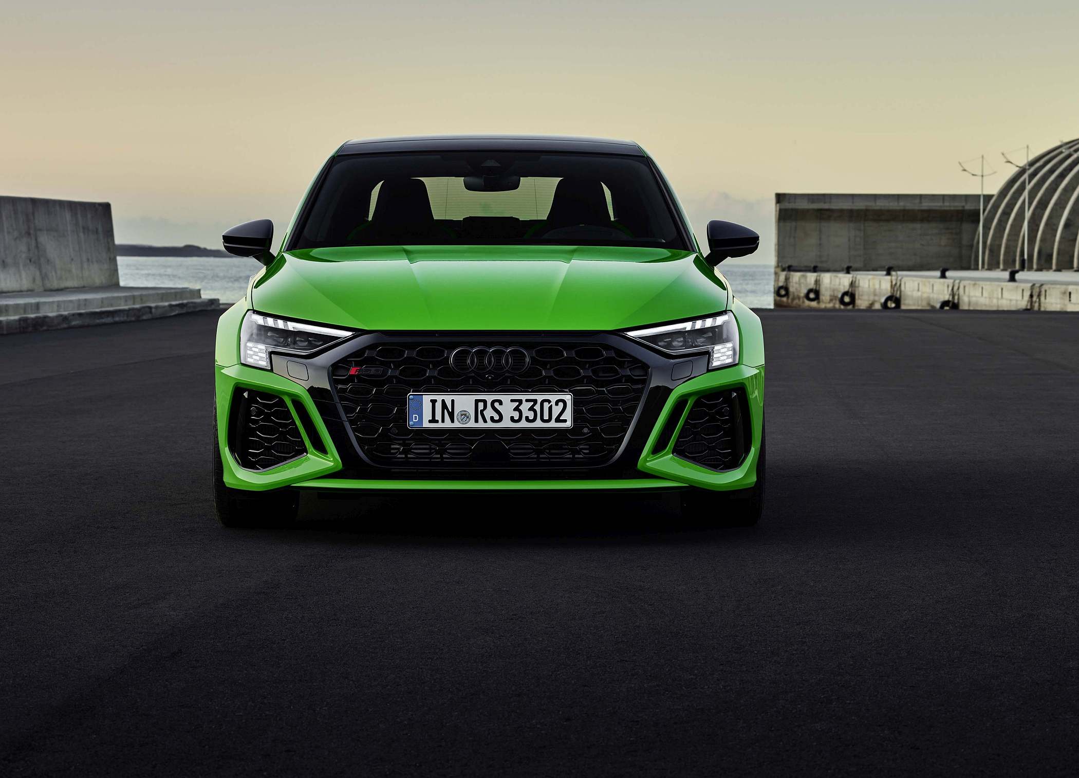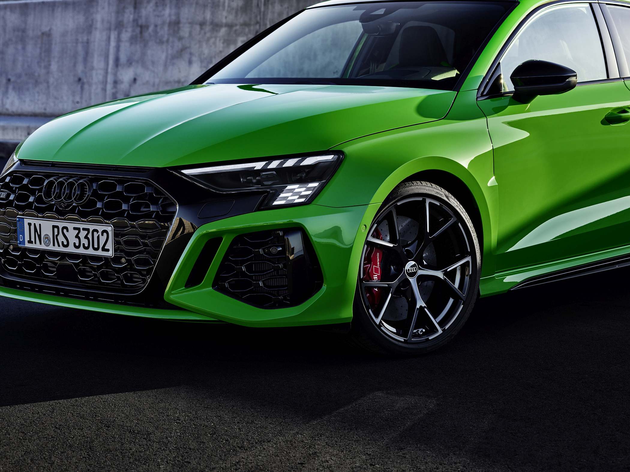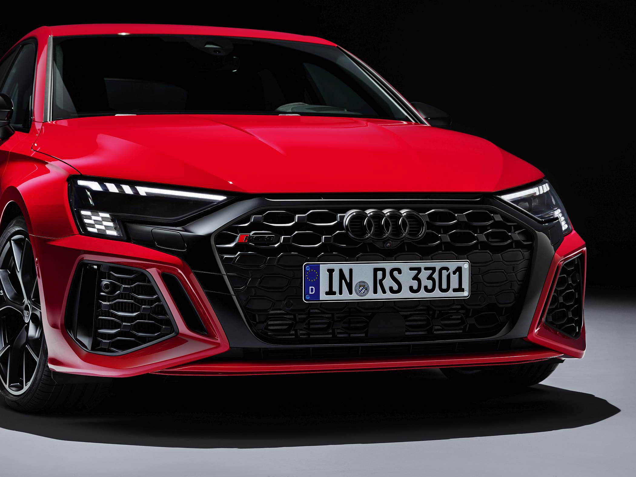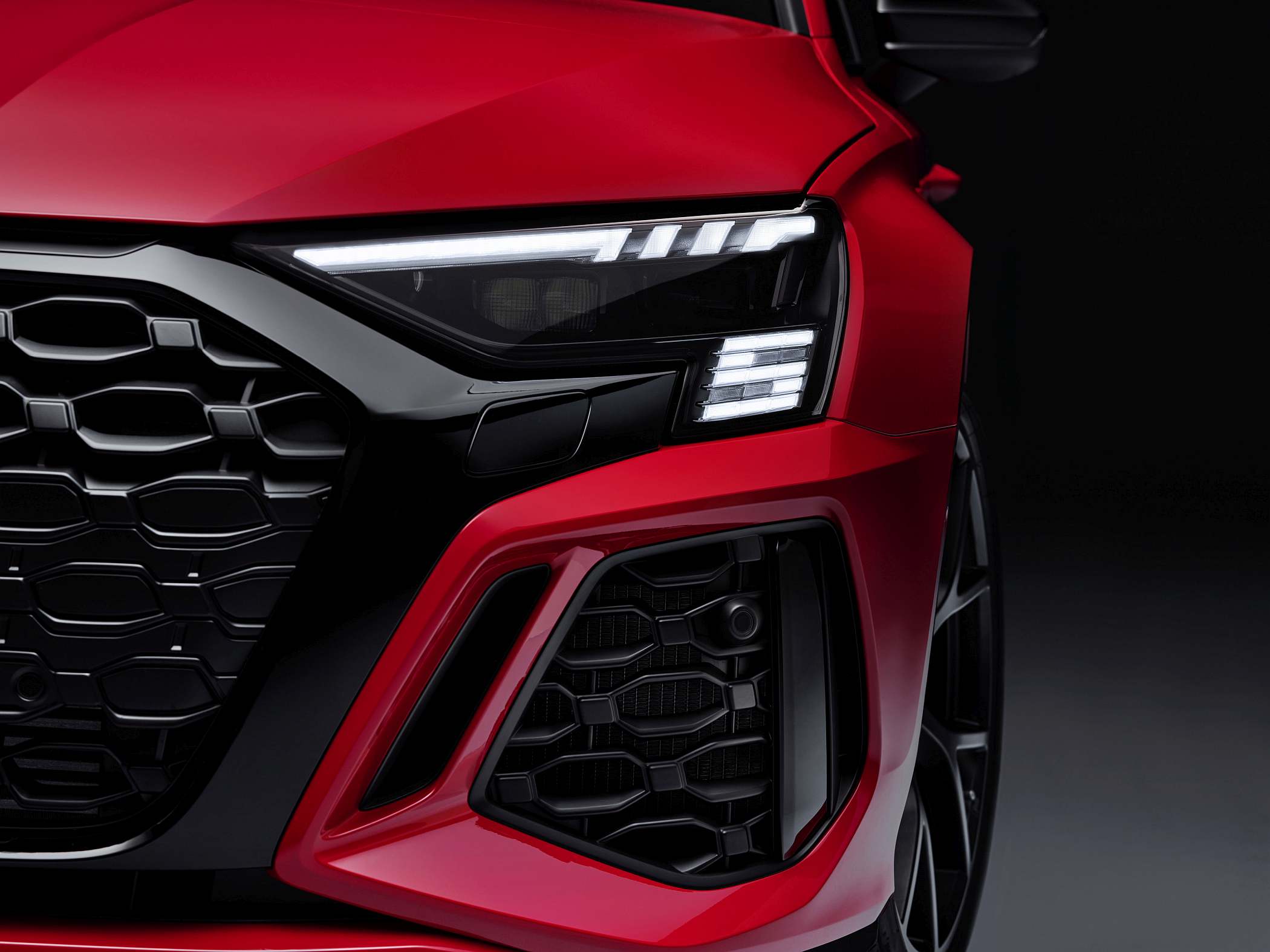 Esteticamente, destaque para a grelha dianteira ‘Singleframe’ de grandes dimensões com uma ‘máscara’ à volta em preto brilhante, a par das entradas de ar de dimensões generosas. A grelha dianteira, note-se, pode ter um acabamento em preto mate para visual mais ‘furtivo’. A iluminação diurna dos faróis também tem grafismo específico, neste caso com inspiração no design de uma bandeira de xadrez, ligando-se assim ao seu ambiente das pistas. A iluminação de boas-vindas assume também um padrão específico com a denominação ‘RS 3’ em modo sequencial.