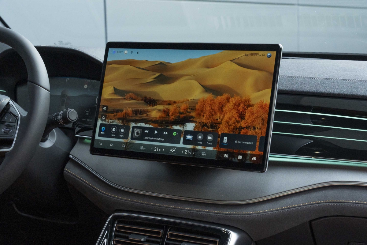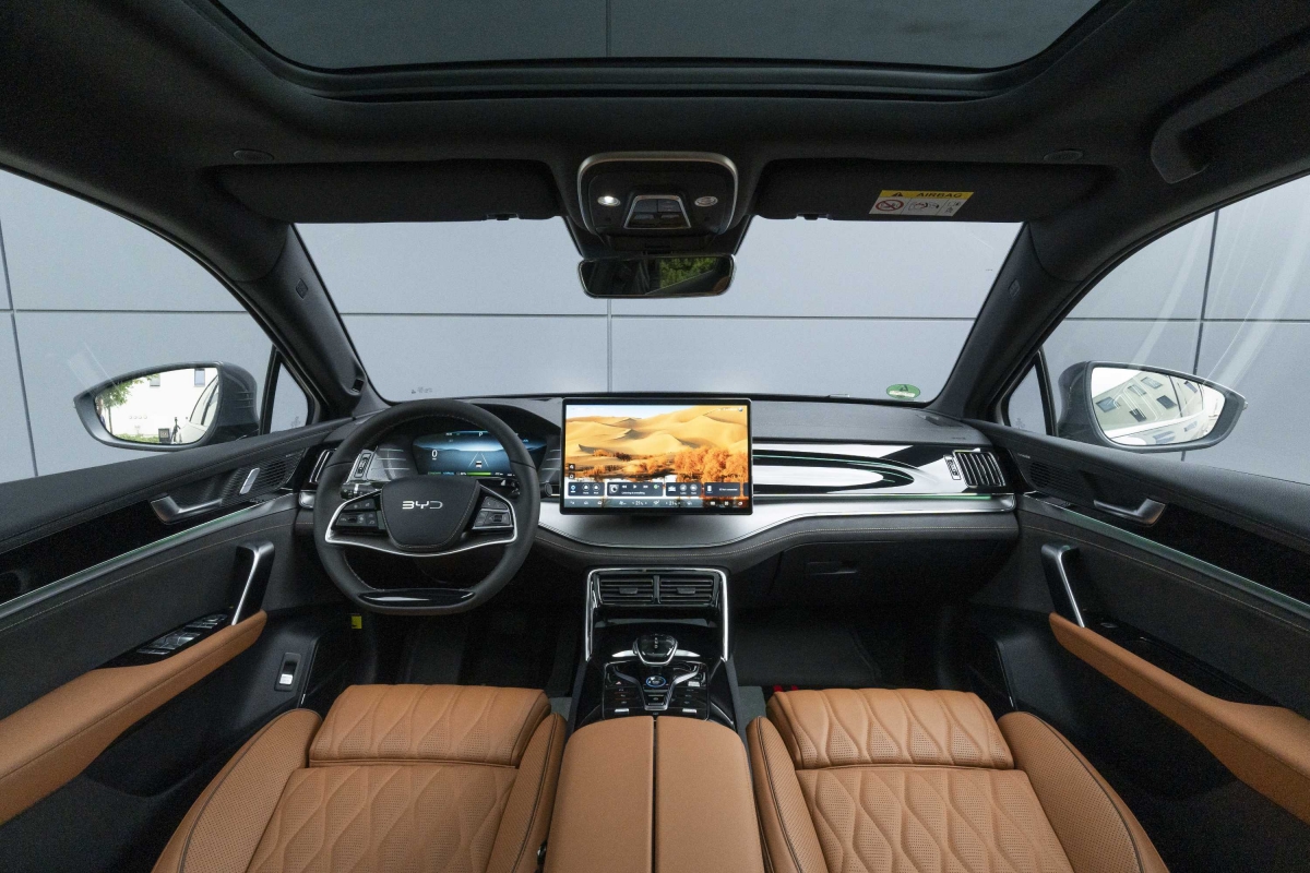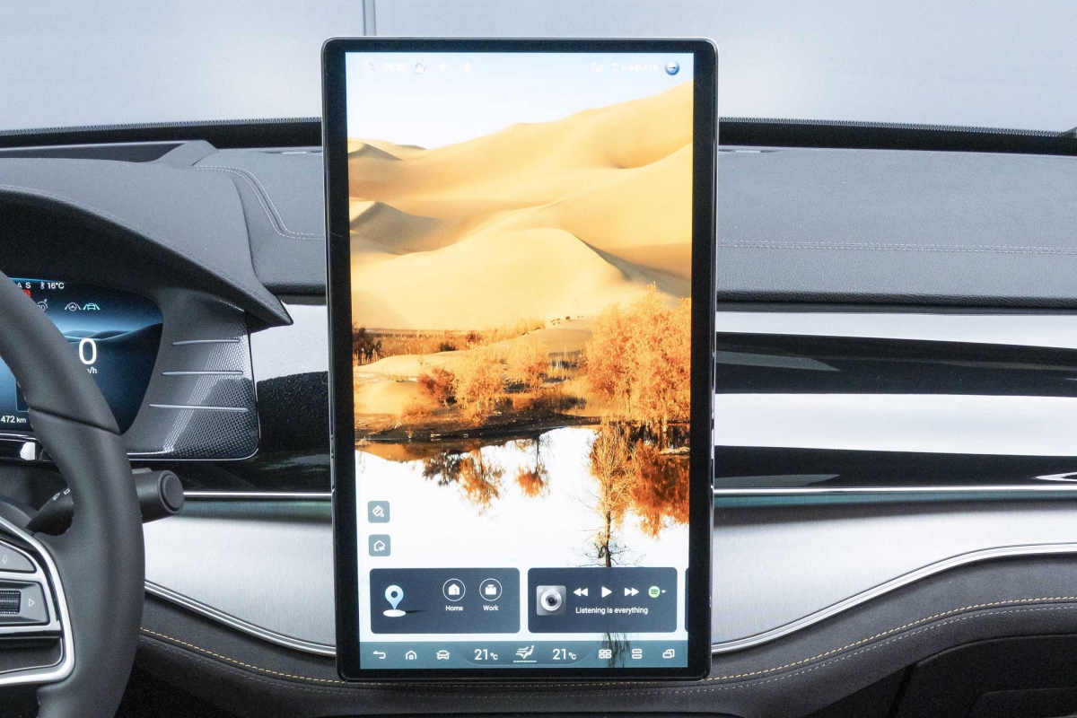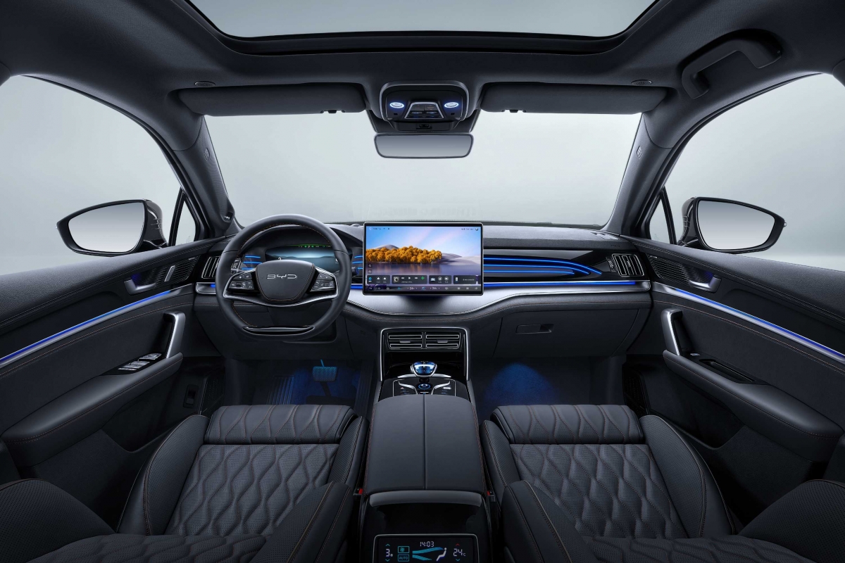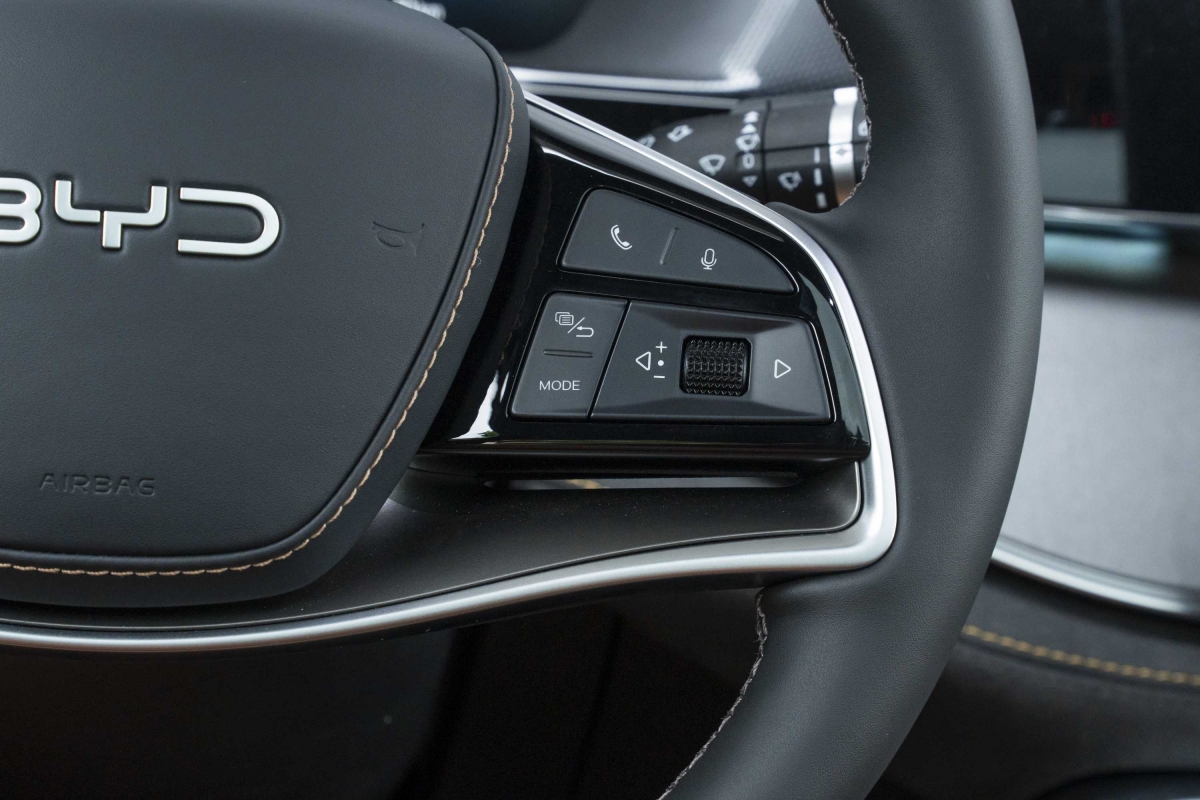 No ‘cockpit’, painel LCD de 12,3” à frente do condutor e ecrã tátil (rotativo) independente de 15,6” no centro do tablier, este último de elevada resolução e conetividade 4G (Android Auto ou Apple CarPlay), sendo possível aceder a assistente de voz inteligente para comandar certas funções (climatização, música e modos de condução, por exemplo), e isto através de uma simples frase inicial: ‘Hi BYD’. O sistema de som Hi-Fi Surround da Dynaudio incorpora 12 colunas.