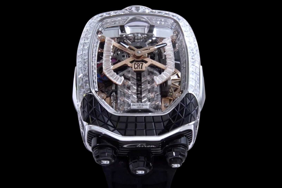 A Jacob & Co. criou um exemplar do seu relógio inspirado no Bugatti Chiron em exclusivo para Cristiano Ronaldo. Esta peça de única é baseada no especialíssimo Bugatti Chiron Tourbillon, lançado pela relojeira norte-americana em edição muito limitada para homenagear o automóvel que foi o primeiro veículo de série a ultrapassar as 300 milhas por hora (482 km/h), mas personalizado ao gosto do craque português. Entre os elementos exclusivos, o relógio tem a assinatura de CR7 na caixa cravejada de pedras preciosas: são exatamente 232 diamantes e 109 safiras pretas.