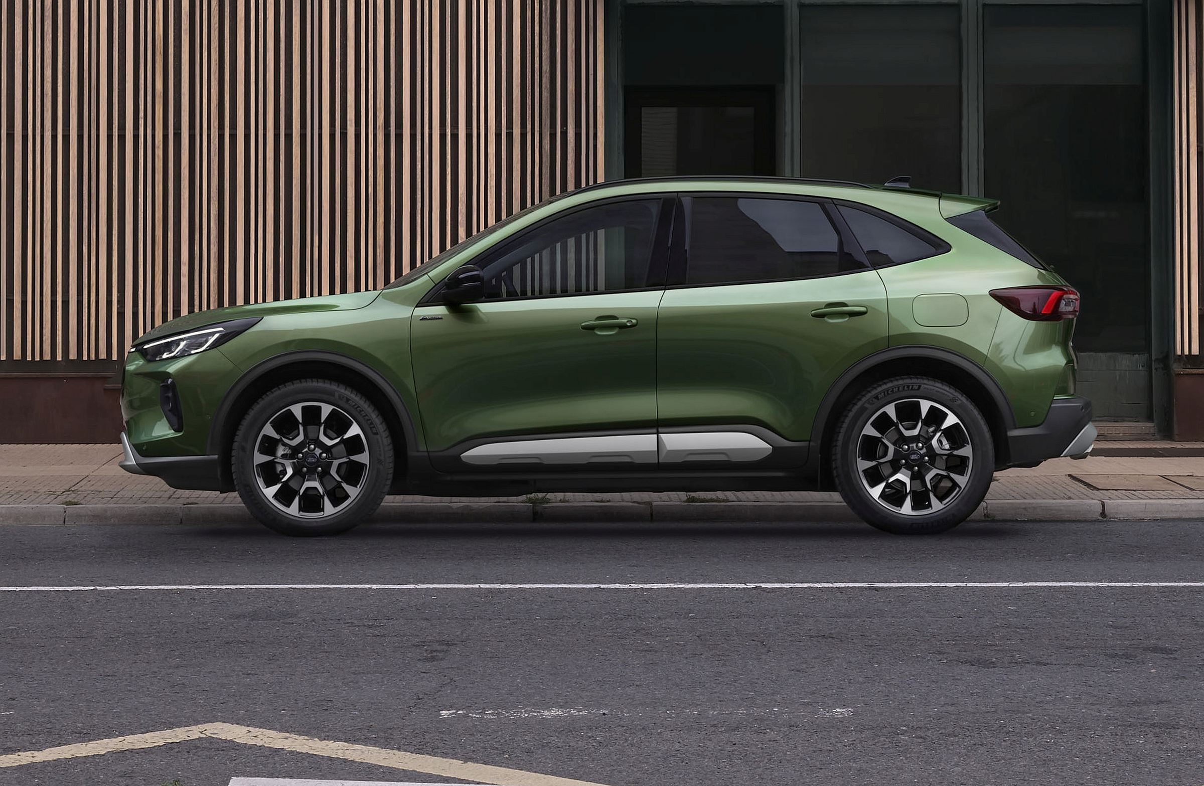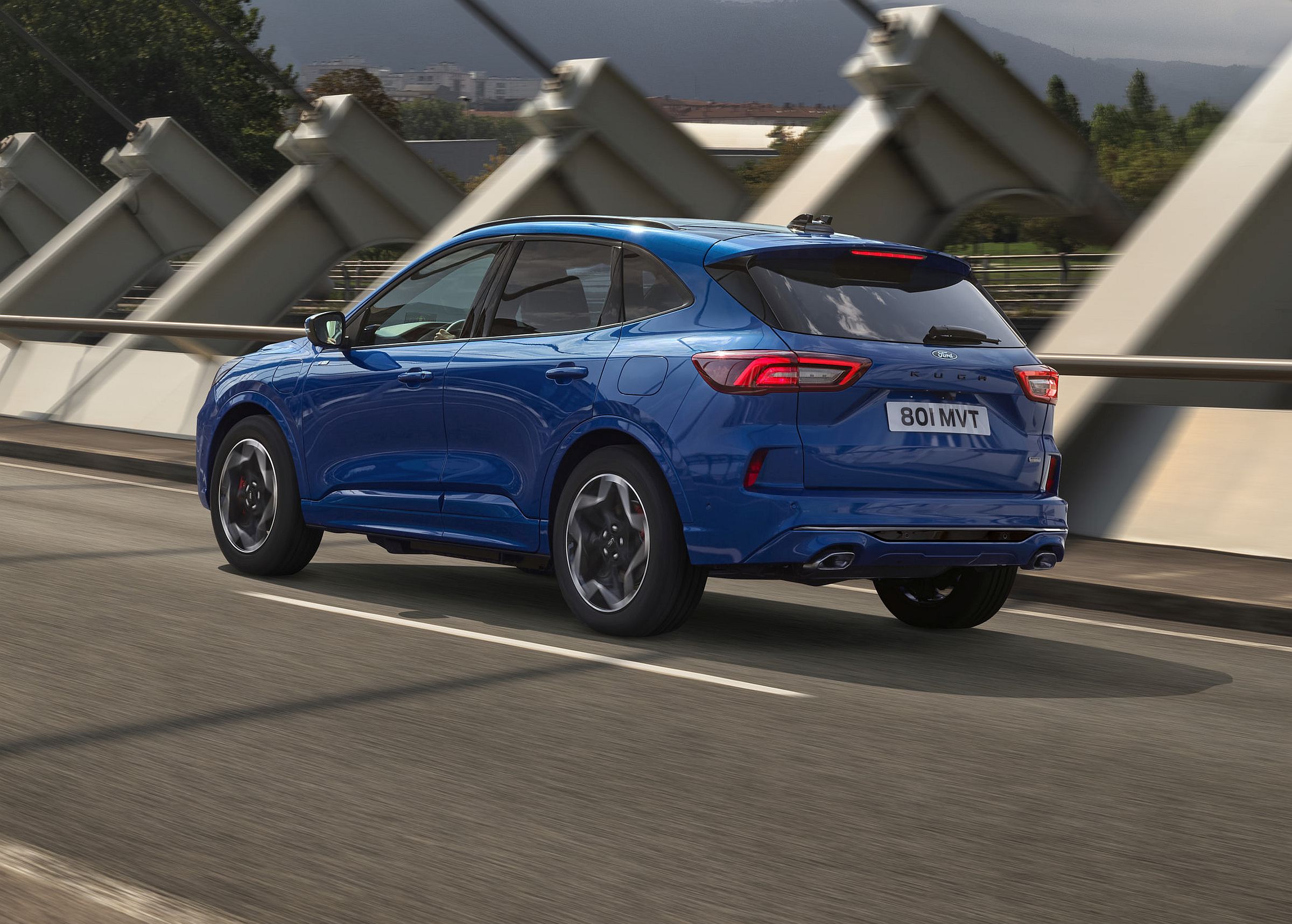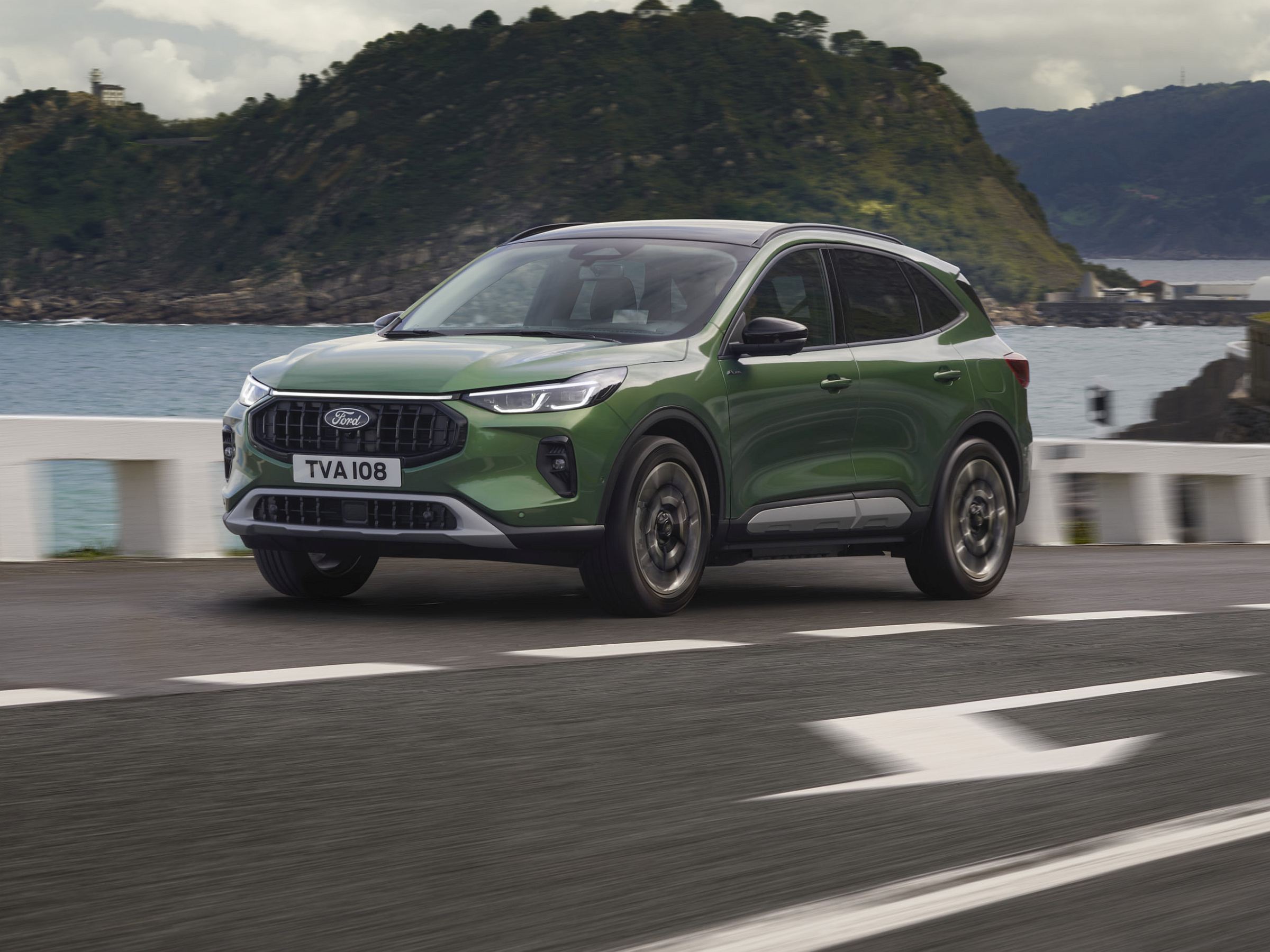 As opções de cores exteriores também foram renovadas, com a introdução das tonalidades ‘Desert Island Blue’ (azul) e ‘Bursting Green’ (verde), enquanto cinco novos designs de jantes de liga leve sublinham o novo impacto visual do Kuga.