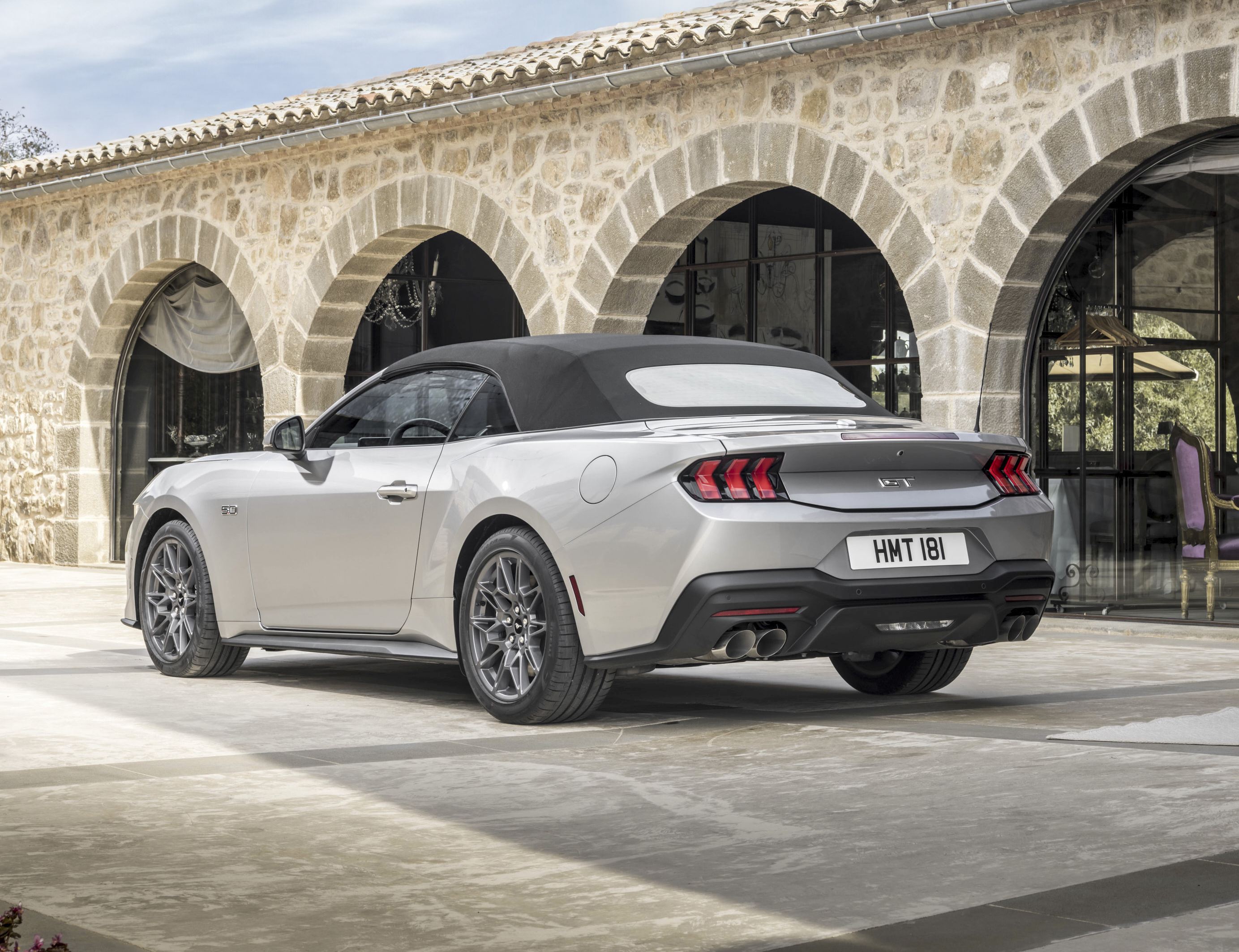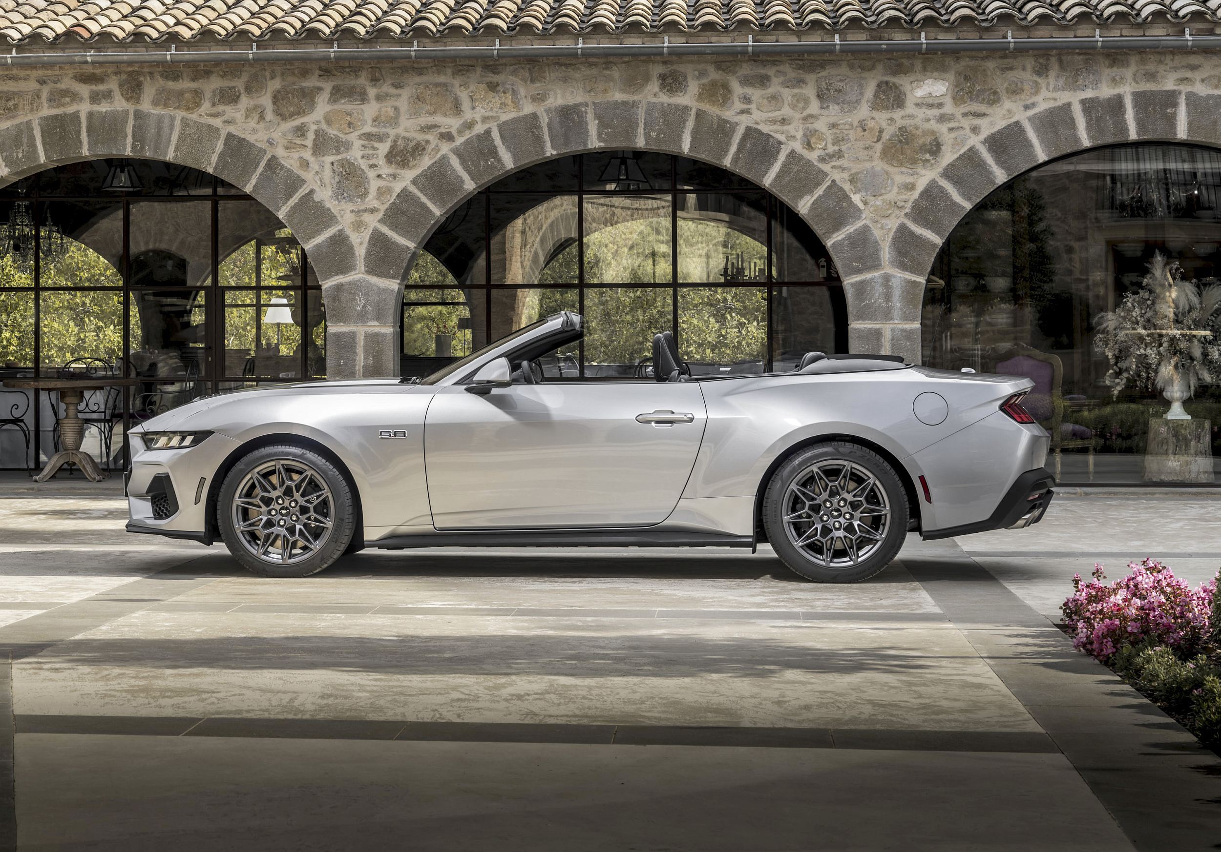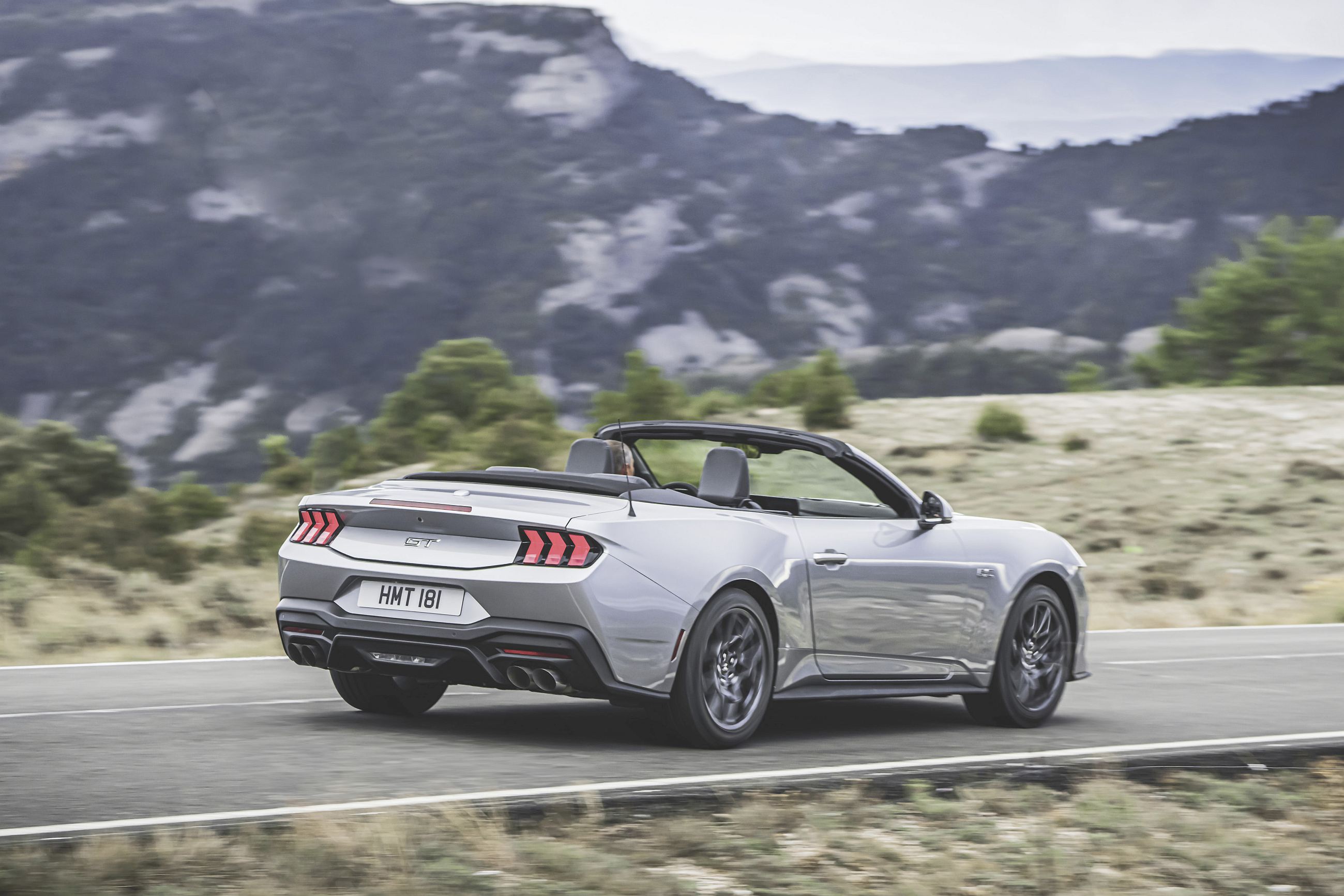O novo Mustang – disponível como coupé ou descapotável – tem uma robusta e claramente em linha com o seu passado, marcado por seis décadas de herança. O capot esculpido e as ilhargas traseiras são a chave para uma presença musculada praticamente inalterada desde o primeiro Mustang, lançado em 1964. Um novo spoiler dianteiro e saias laterais melhoram a aerodinâmica, enquanto os LED atualizam os clássicos faróis traseiros de três barras. No caso do Mustang descapotável, o tejadilho totalmente forrado e isolado pode ser recolhido ou recolocado em oito segundos, mantendo a funcionalidade da bagageira, que pode acomodar dois sacos de golfe.