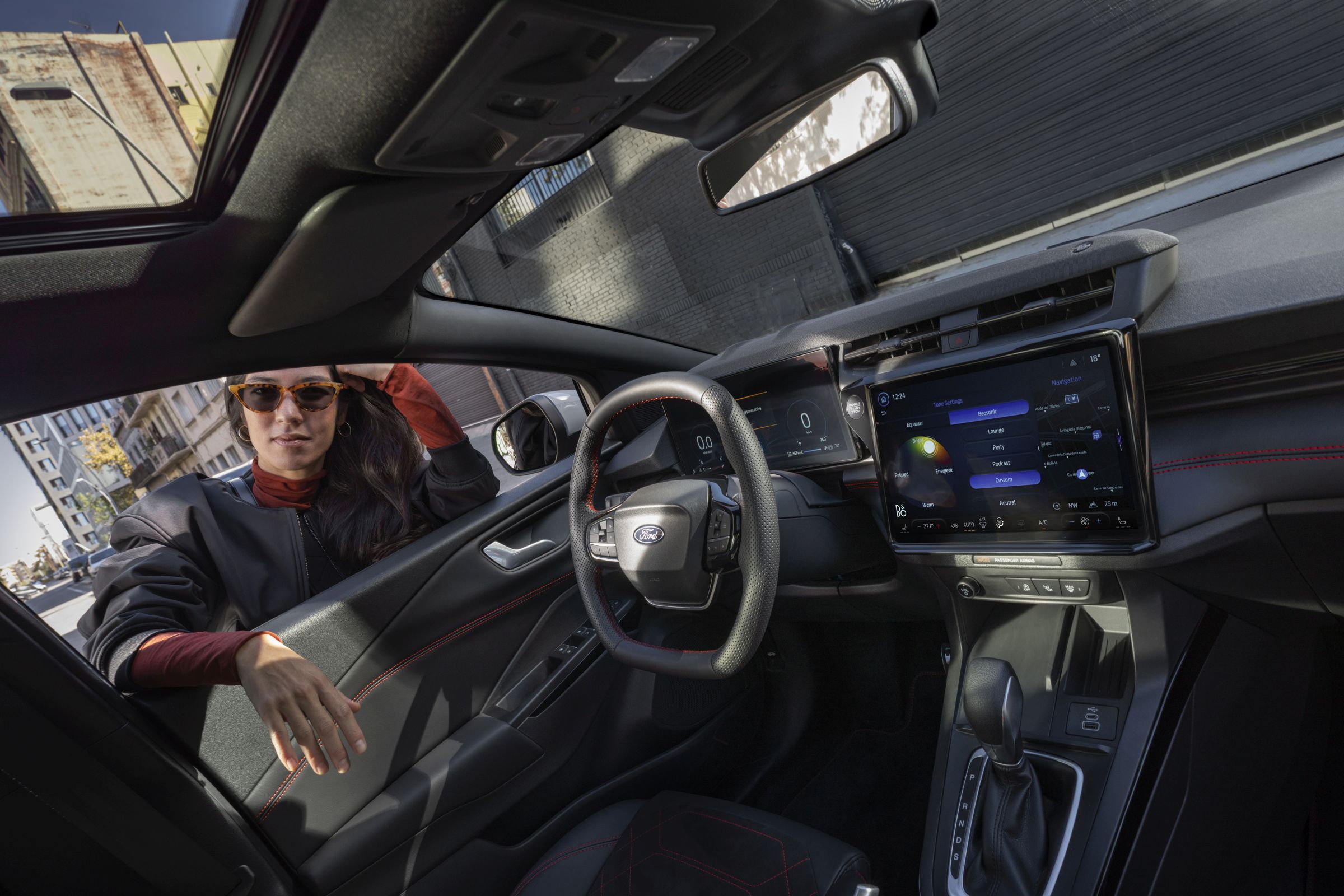 Os bancos, o volante e o novo apoio de braço deslizante têm acabamentos em couro sintético Sensico, com costuras delicadas em ‘Cinzento Frio’ nas versões Titanium e costuras cruzadas em vermelho vivo nas versões ST-Line. Os pedais desportivos e as embaladeiras em liga leve de alta qualidade, bem como o revestimento escuro do forro do tejadilho, estão igualmente presentes.