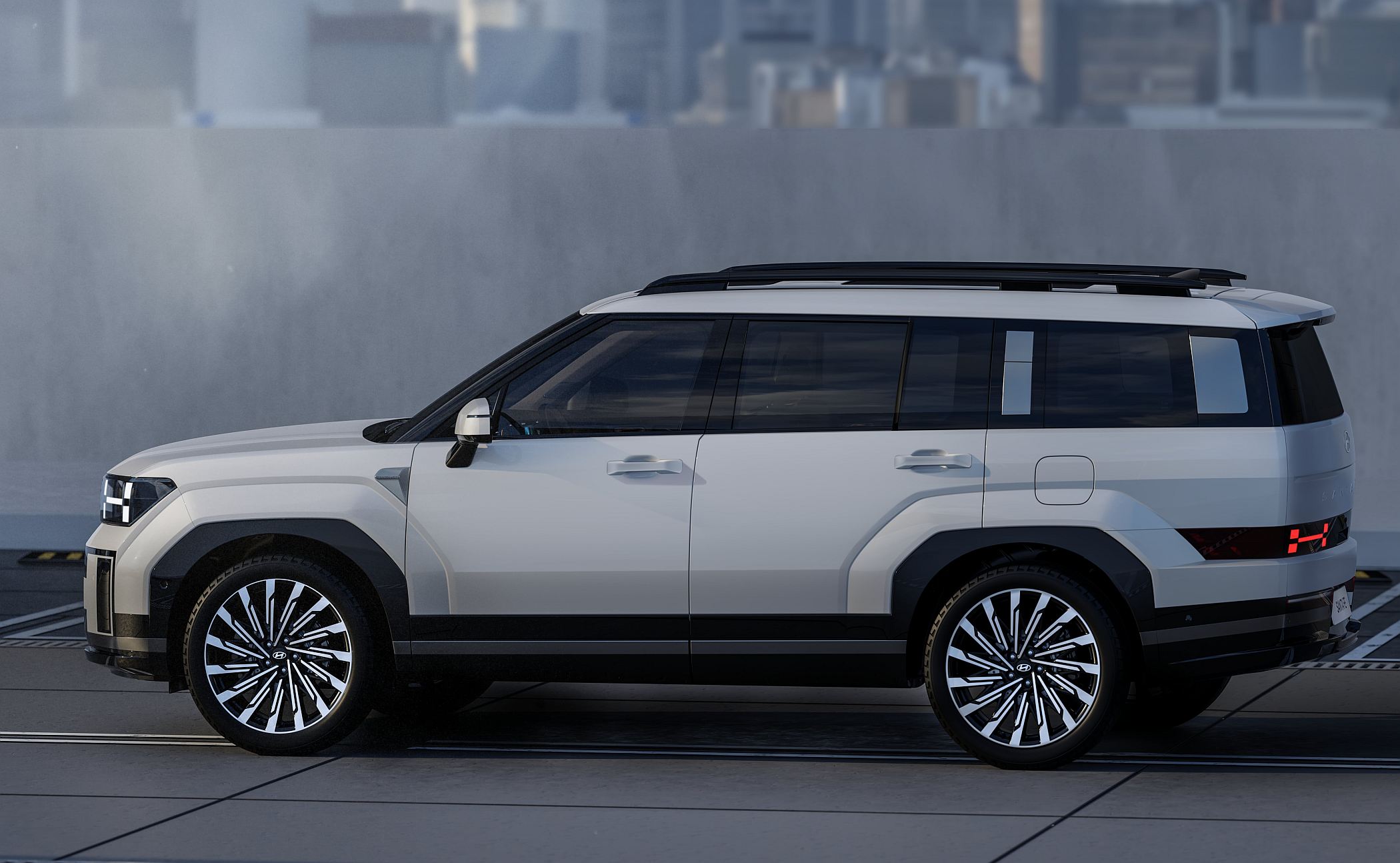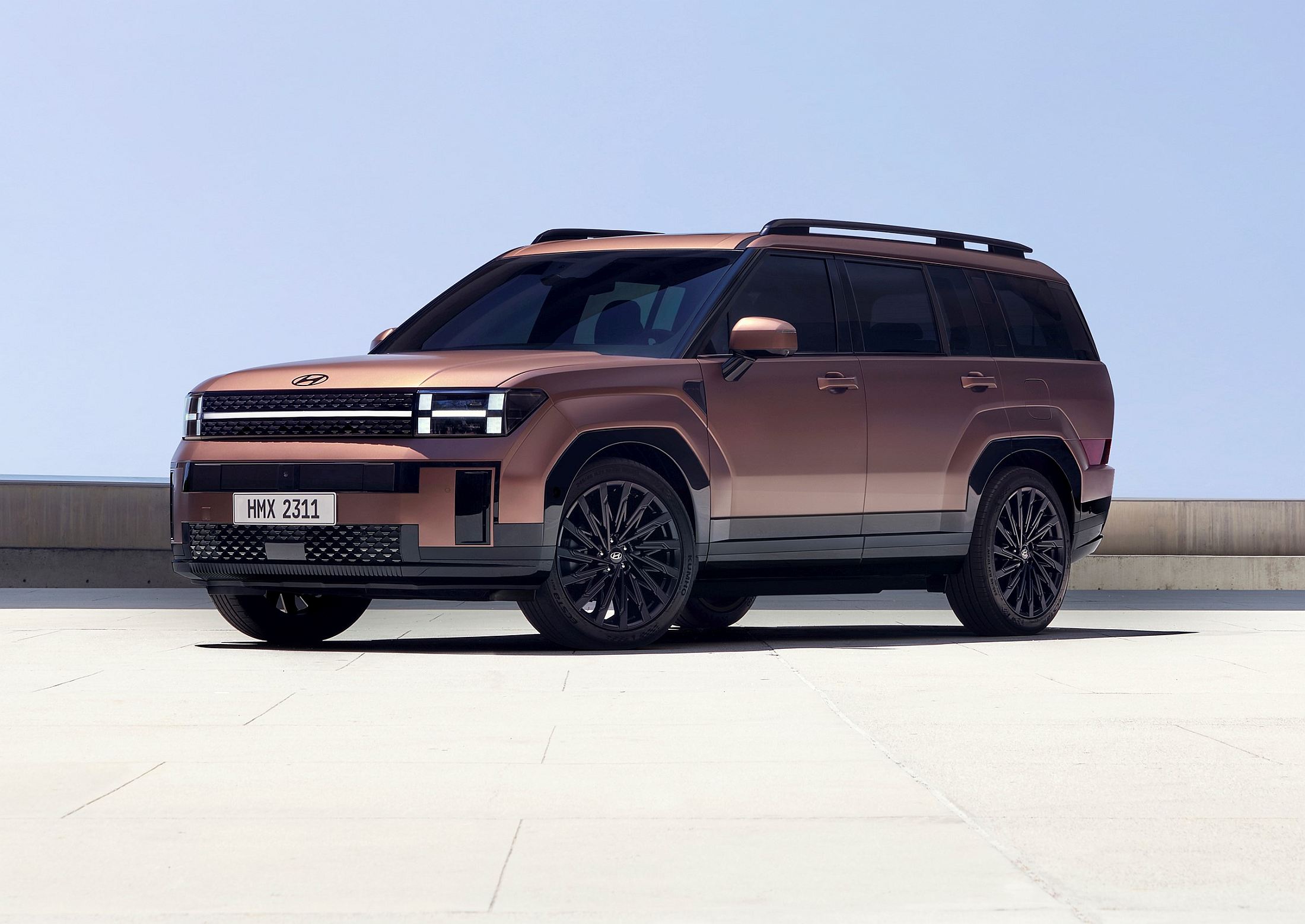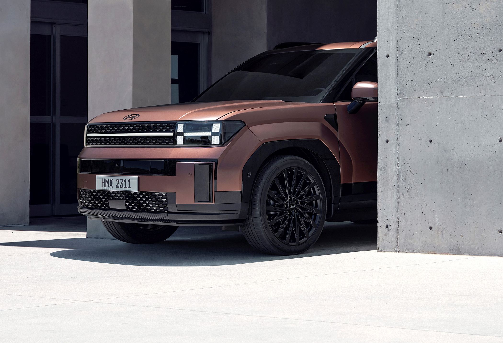 A aparência do SUV de grande porte da Hyundai deve-se em muito à intenção de oferecer muito espaço a bordo, com uma distância entre eixos mais longa, importante para a habitabilidade, mas que é depois complementada pela secção traseira da bagageira também esticada e de formato muito reto, com as jantes de 21 polegadas a complementarem a sensação de grande robustez.