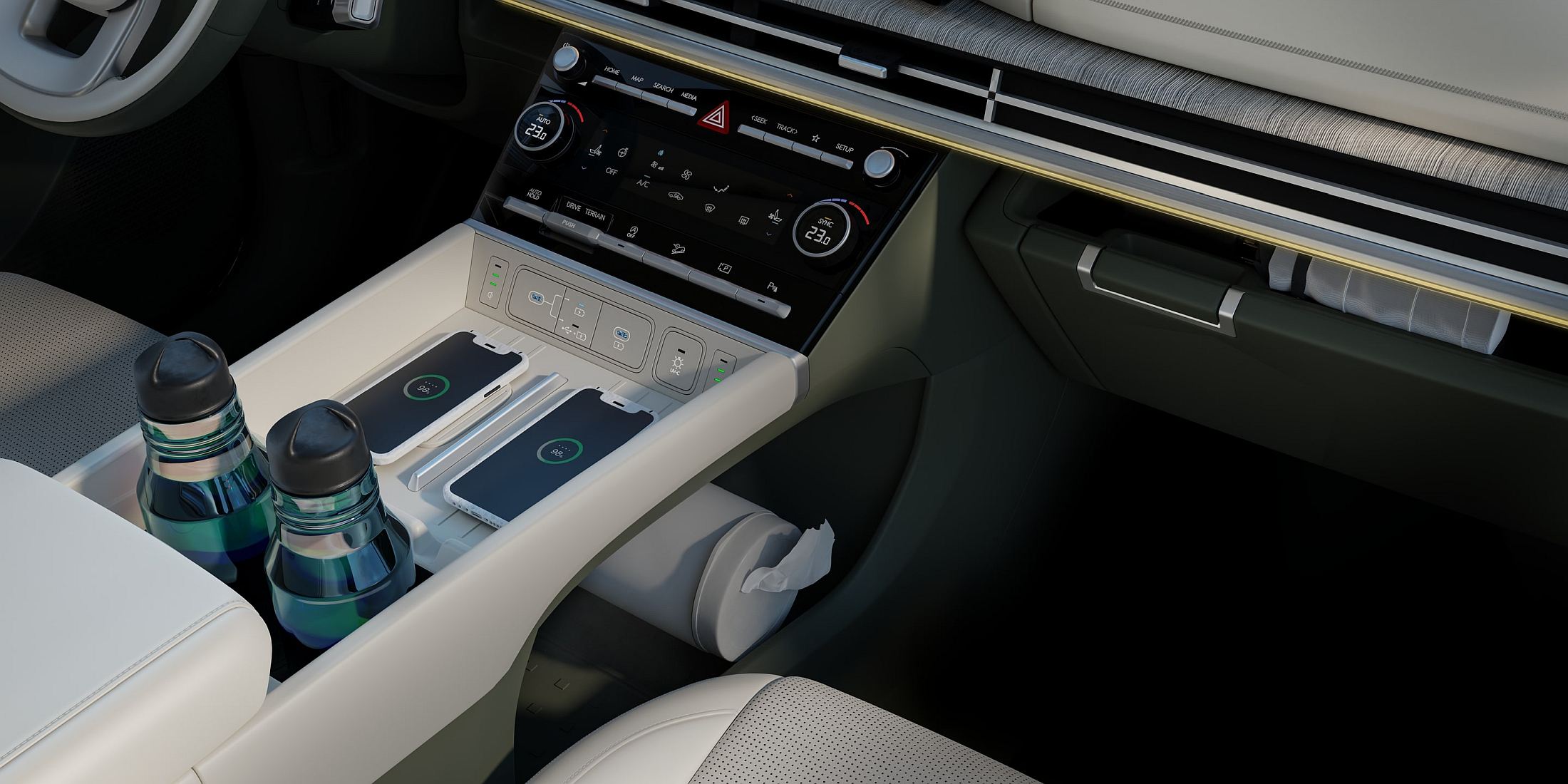 A marca revela que o novo Santa Fe terá três filas de bancos, sendo as duas últimas completamente rebatíveis, para possibilitar aventuras pela natureza levando passageiros ou equipamentos, como bicicletas de montanha ou esquis. O desenho do interior contrasta com o do exterior, com linhas horizontais e verticais e a inspiração, novamente, na letra ‘H’ para alguns elementos, como as saídas de ar da climatização.