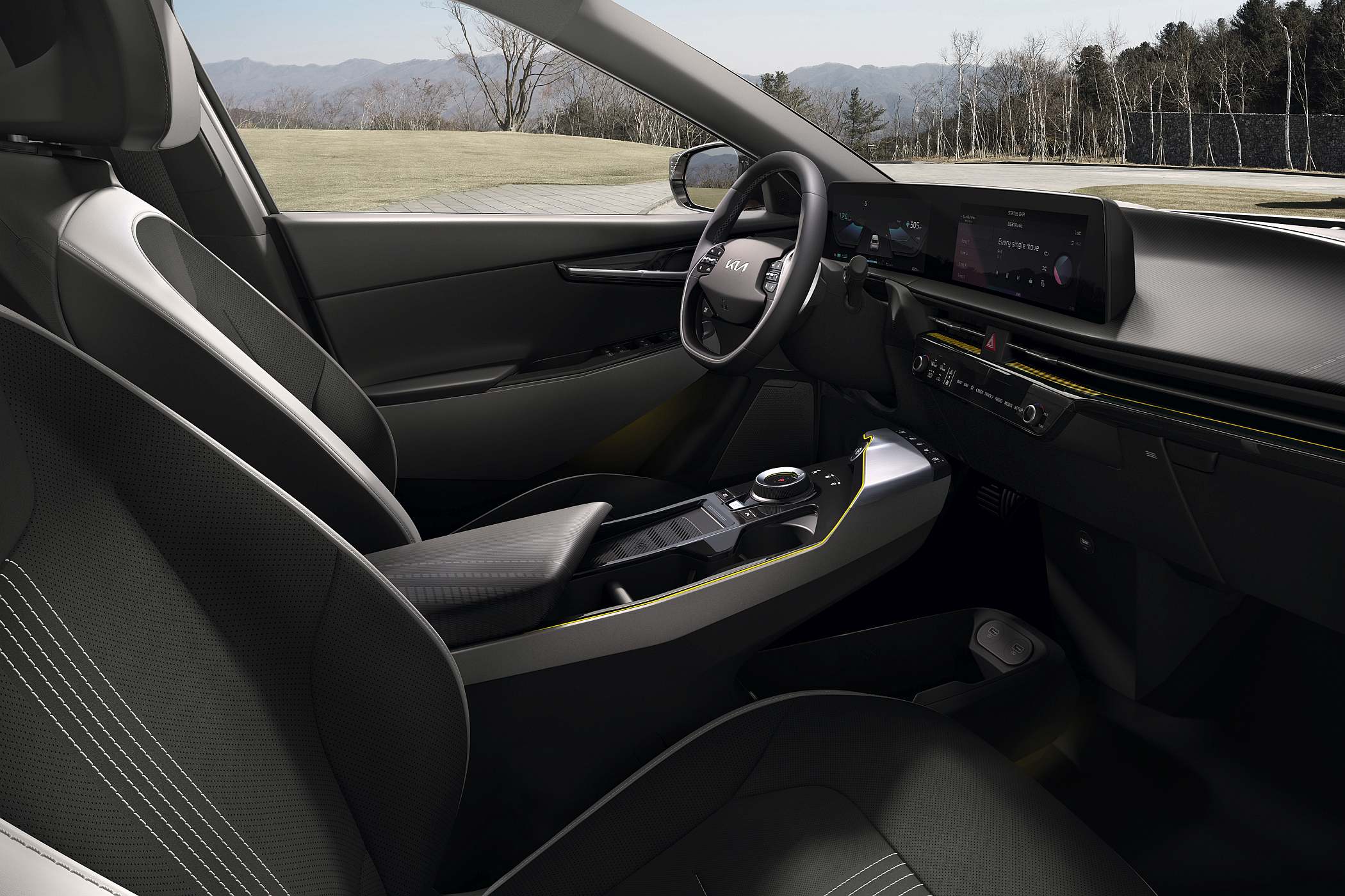 O EV6 estreia um sistema de infoentretenimento com dois ecrãs de 12 polegadas. Estes monitores curvos do EV6 incorporam painéis de película finos, que recorrem a uma nova estrutura e a tecnologia avançada para diminuir o impacto da luz. Este Kia também disponibiliza um ecrã head-up display com realidade aumentada (AR), que projeta informações de condução na base do para-brisas, na linha de visão do condutor. Este sistema mostra avisos dos Sistemas Avançados de Assistência ao Condutor, pormenores sobre a velocidade do veículo e instruções de navegação curva a curva.
