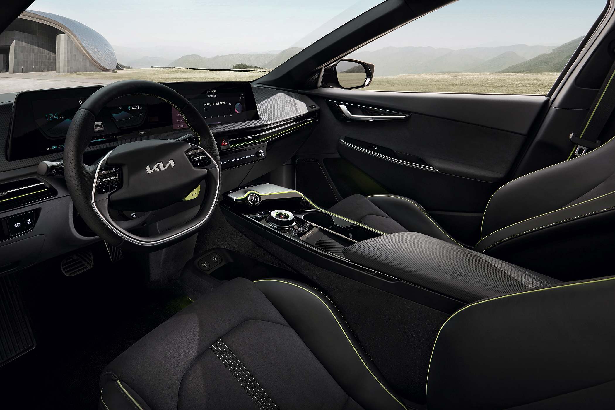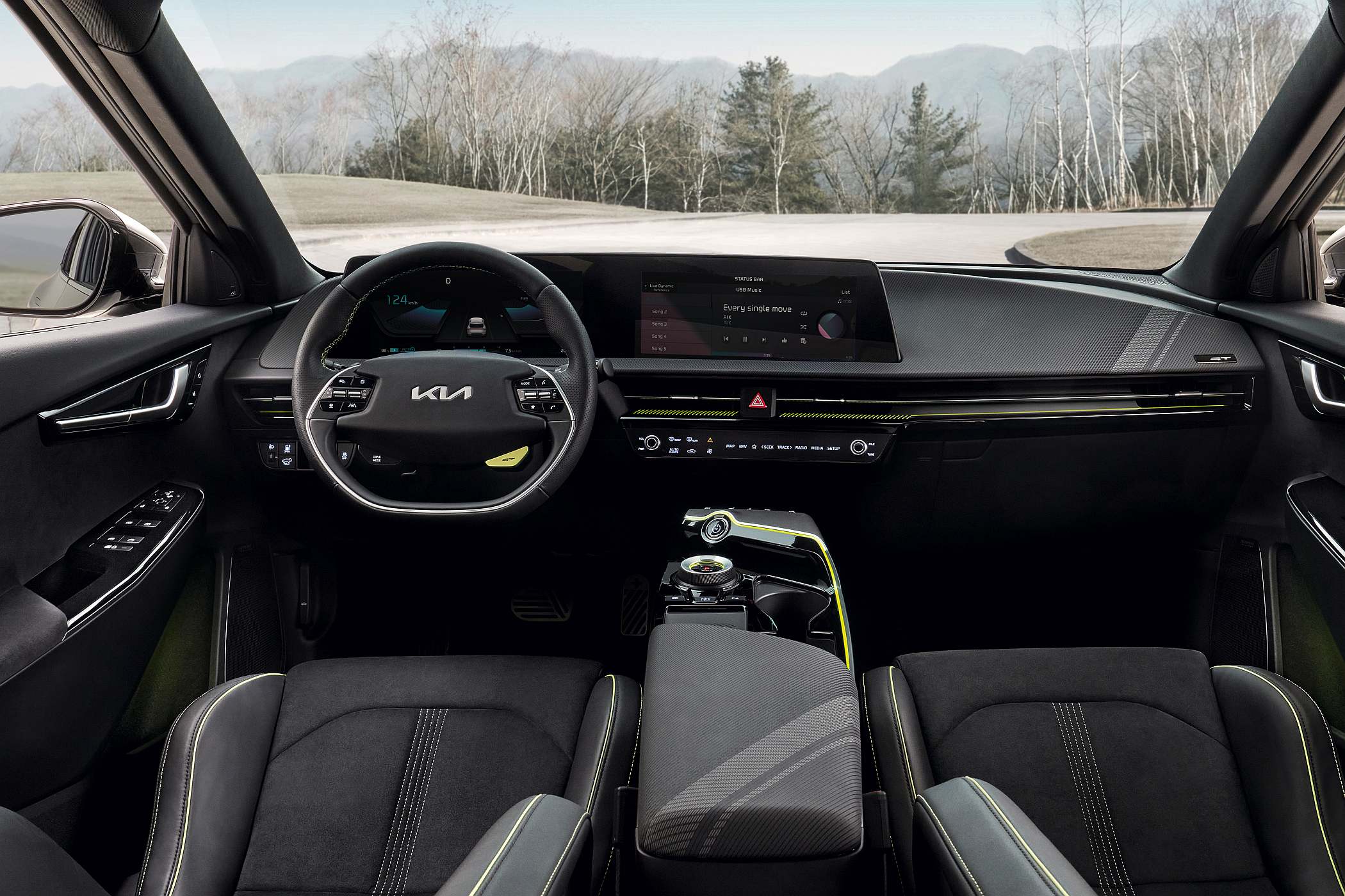 A bordo, o novo EV6 foi pensado para oferecer uma liberdade de vivência e aproveitamento do espaço sem precedentes na marca, beneficiando diretamente da plataforma E-GMP. Apesar das dimensões exteriores compactas (4680 mm de comprimento ou 4695 mm nos GT Line e GT), a distância entre eixos de 2900 mm permite oferecer um espaço no habitáculo ao nível do de muitos SUV médios. A nível tecnológico, destaque para o monitor curvo do sistema de infoentretenimento para um visual evoluído e moderno. Os bancos, por outro lado, convidam à distração, sendo revestidos com tecidos modernos e robustos, criados a partir de plástico reciclado – o equivalente a 111 garrafas.