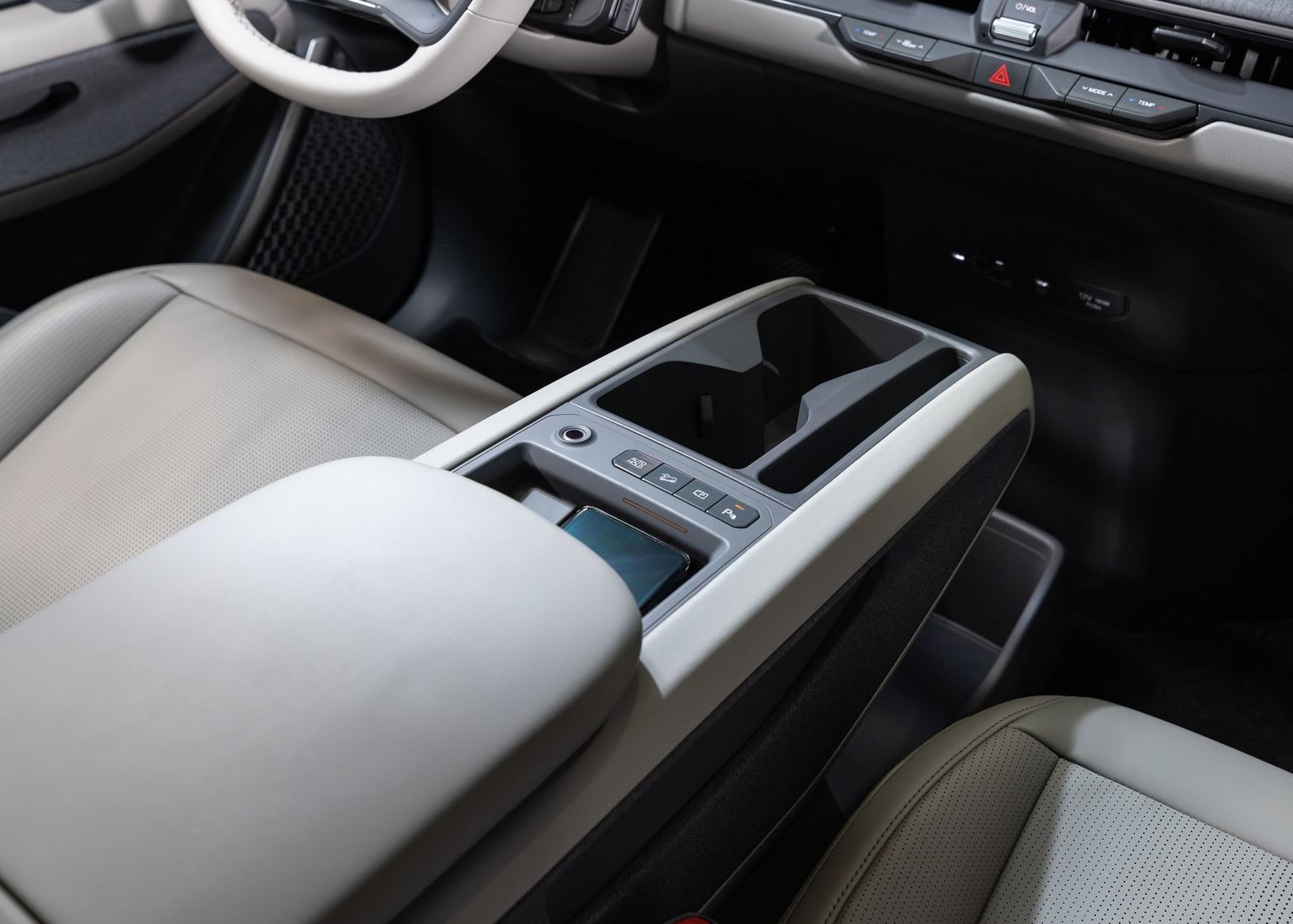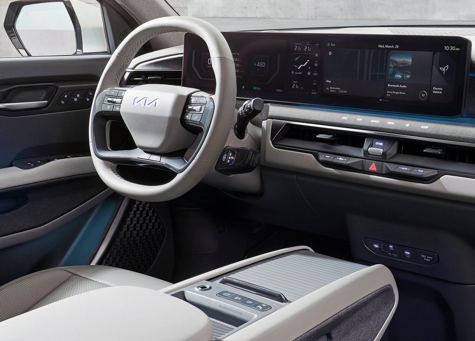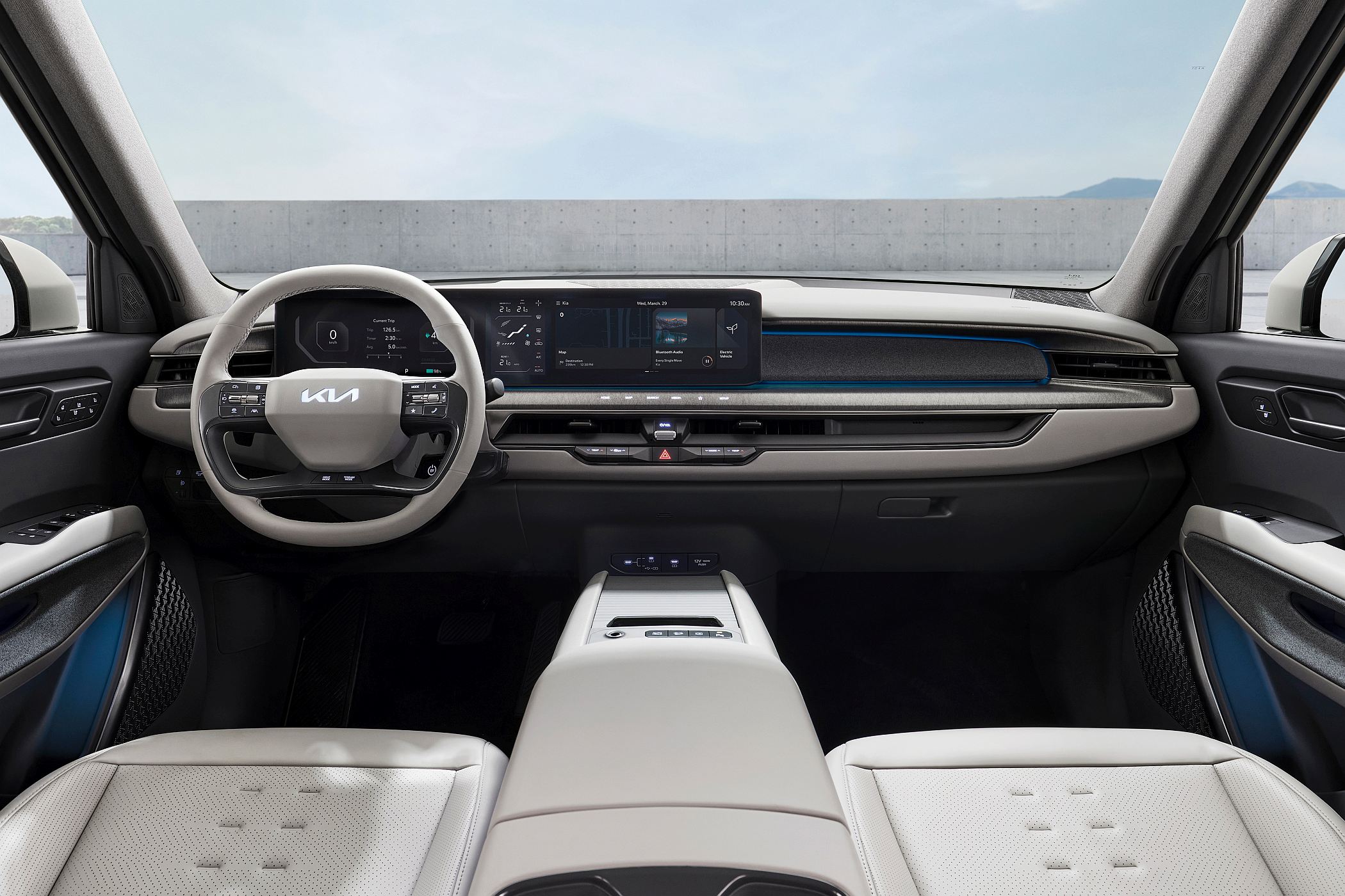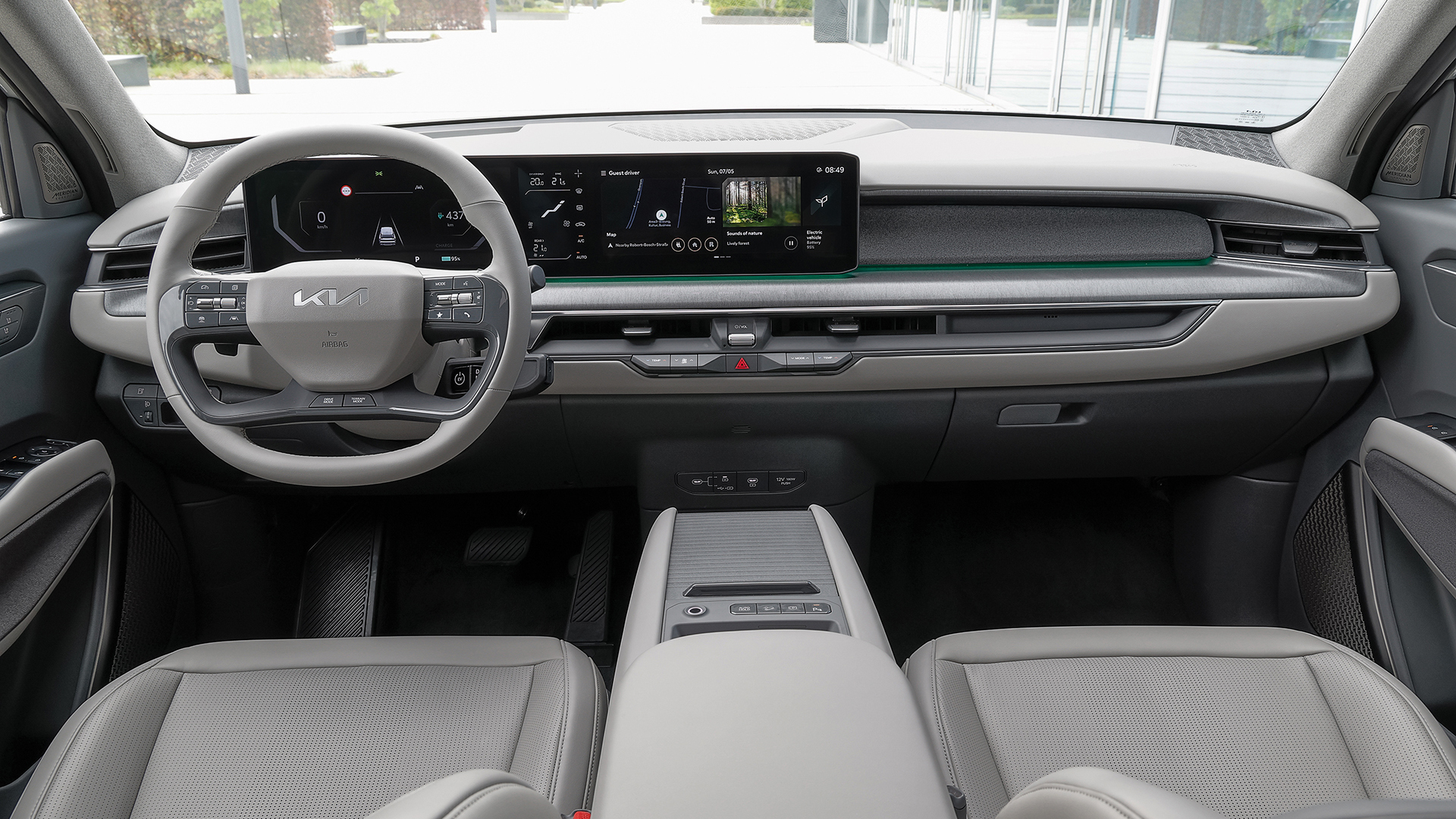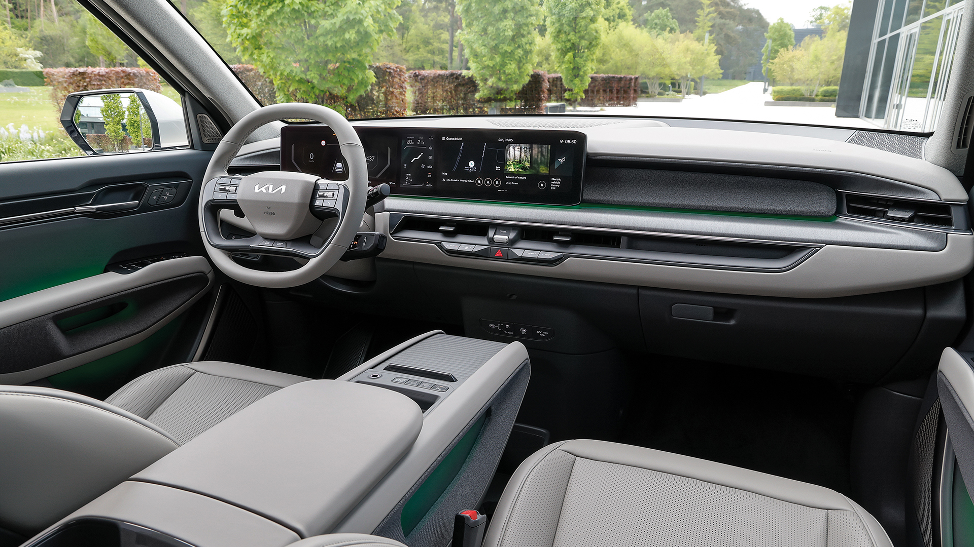 A tecnologia é outro elemento em destaque no EV9, com um painel horizontal em que os três ecrãs estão colocados no tablier: os dois principais (da instrumentação e do infoentretenimento) têm 12.3 polegadas, situando-se entre esses um pequeno ecrã de 5.3”, para controlar o sistema de climatização. A coluna de direção passa a contar com haste dedicada para o seletor de condução ‘shift-by-wire’ e botão para ligar o veículo, libertando dessa forma bastante espaço na consola central entre os dois bancos dianteiros (com ajuste elétrico, modulação automática durante a condução, aquecimento e ventilação). No tablier, há comandos hápticos para atalhos do menu de infoentretenimento.