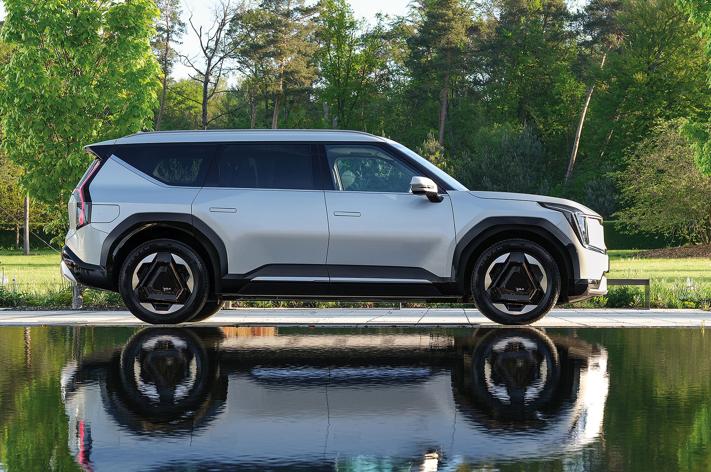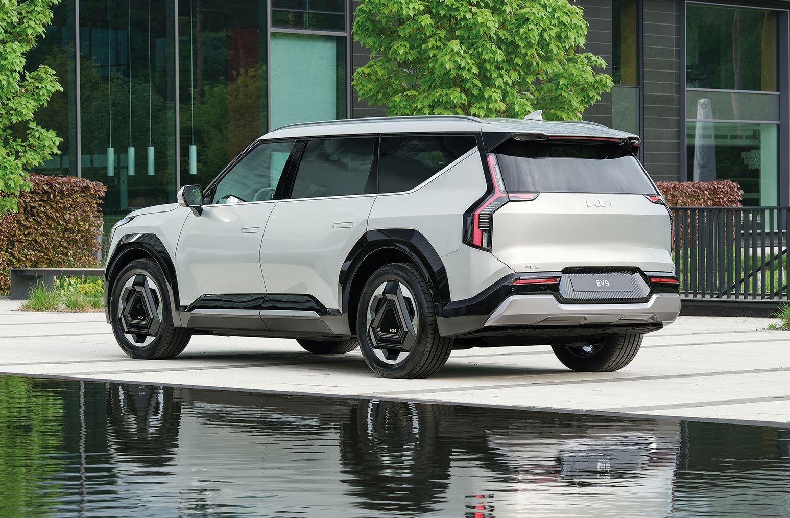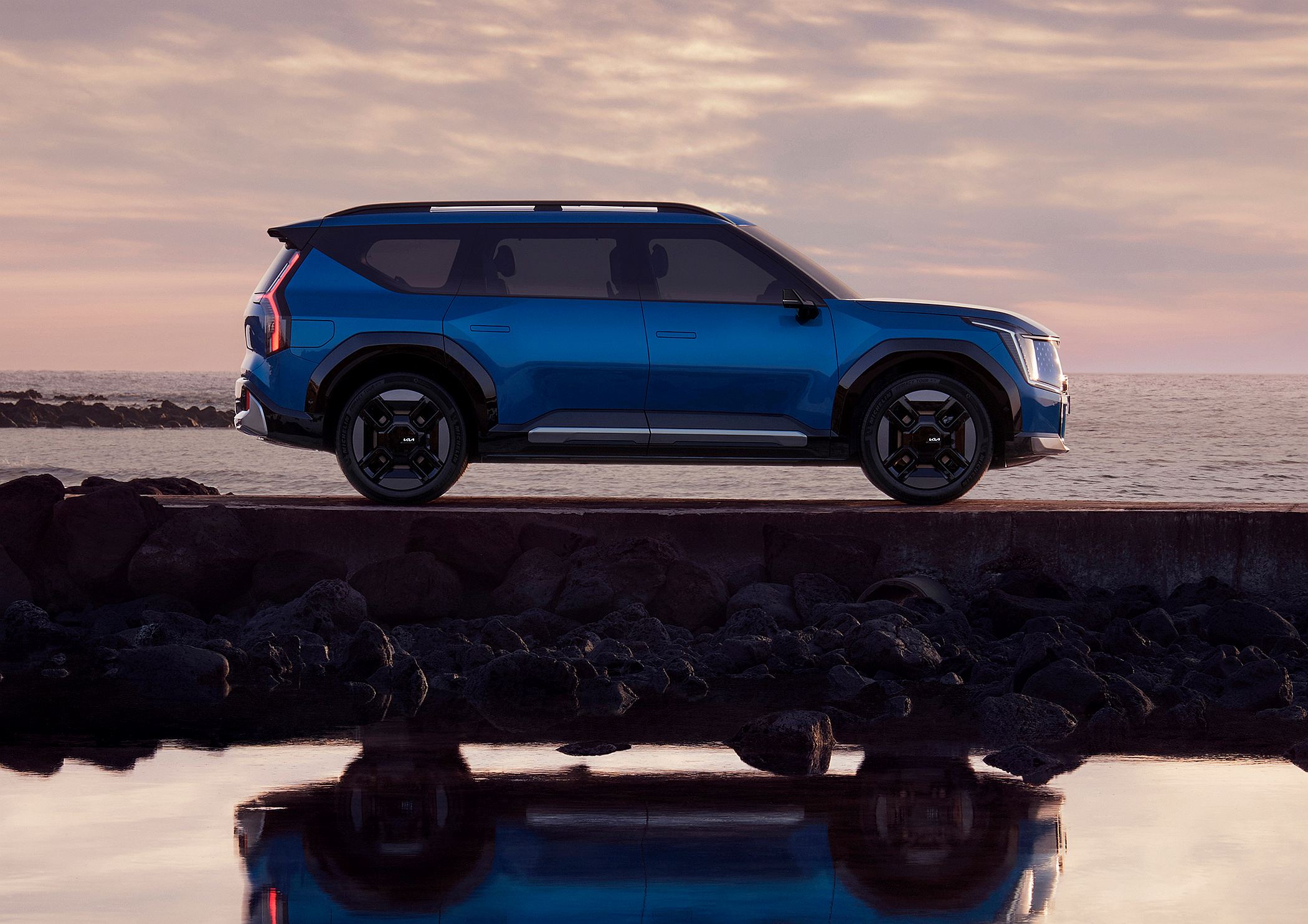 Apesar do seu volume, o coeficiente de arrasto do EV9 é de 0.28 Cd, o que é um valor bastante interessante quando se atenta nas proporções gerais deste SUV elétrico, ao qual não faltam também as barras de tejadilho e as jantes de liga leve em 19 polegadas na versão de equipamento First Edition. A outra versão é a GT-Line, que oferece um visual ligeiramente mais desportivo (sem transfigurar o EV9 em algo que não pretende ser), com para-choques mais desportivos ou as jantes de liga leve específicas de 21 polegadas. Esta versão conta com uma cor exterior exclusiva ‘Blue Ocean’. Tanto a linha de equipamento First Edition, como a GT-Line, oferecem seis cores exteriores de carroçaria.