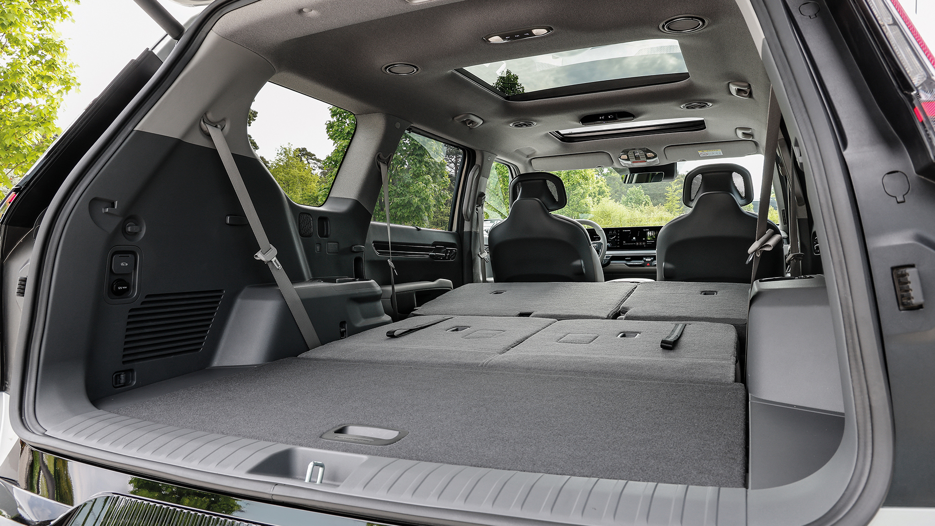 O espaço é uma premissa fundamental do EV9, com sete lugares a bordo (a Kia irá oferecer uma versão GT-Line com seis lugares – removendo o lugar central da segunda fila – apenas por encomenda). A capacidade da bagageira varia entre os 333 litros com os sete lugares operacionais, os 828 litros com cinco lugares e os 2393 litros com o rebatimento dos bancos das segunda e terceira filas. Na dianteira, a bagageira oferece 90 litros no caso do First Edition e um pouco menos na versão GT-Line (52 litros) devido aos constrangimentos técnicos da versão com tração integral (AWD).
