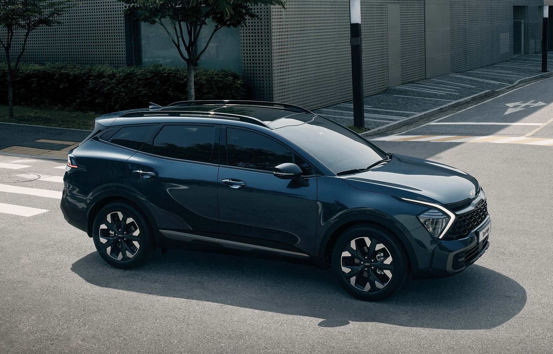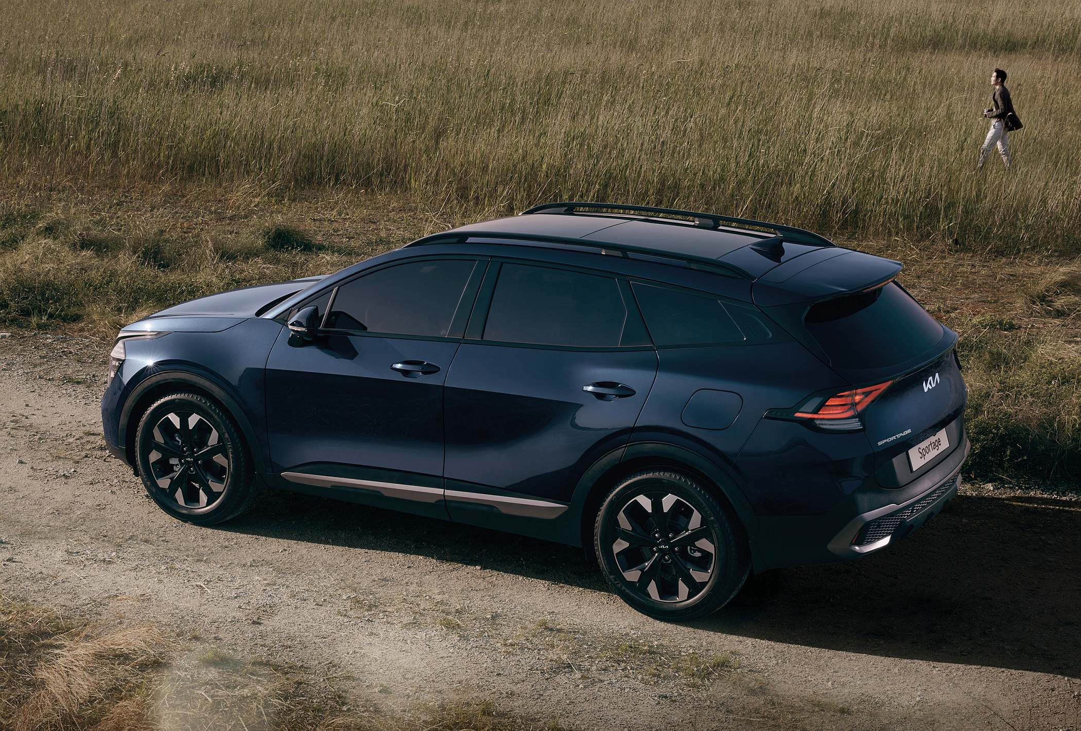 De perfil, a linha de cintura ascendente e o tejadilho descendente ao jeito de um coupé conjugam-se para oferecer uma pose dinâmica e moderna, complementada por um pilar D mais estreito e com um spoiler no topo da bagageira. Em estreia no Sportage, o tejadilho pode ser pintado em preto, contrastando com a cor da carroçaria.