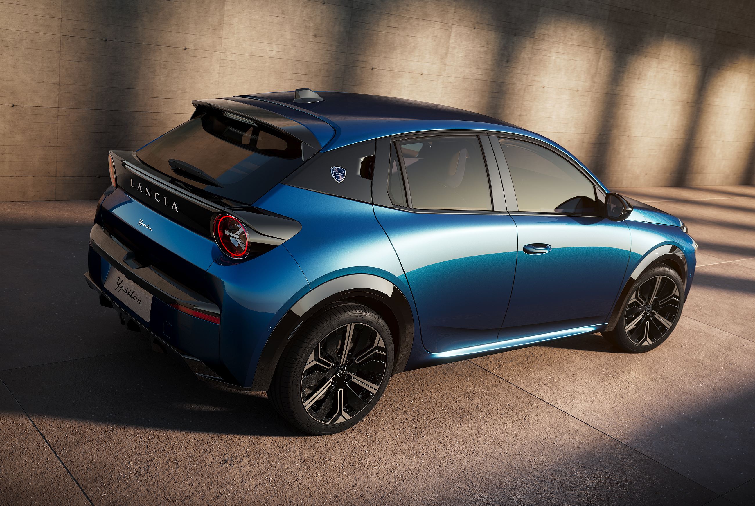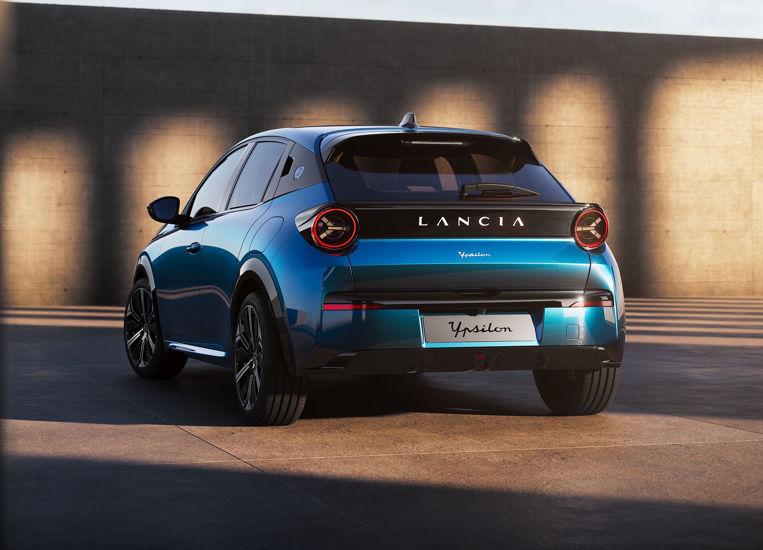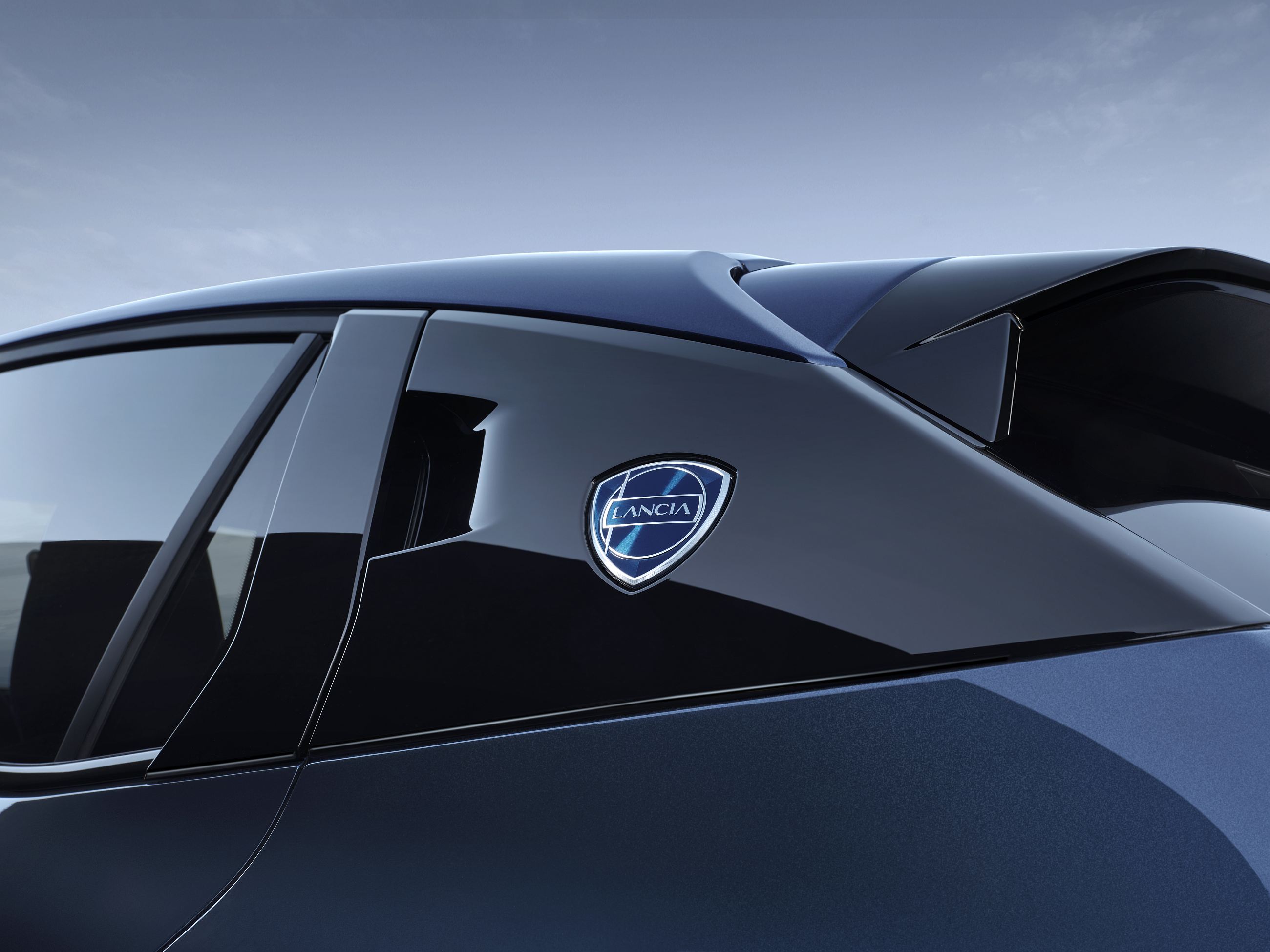 Os faróis circulares contam com tecnologia Full LED, a mesma que é utilizada nos farolins atrás, estes com formato inspirado noutro ícone da Lancia, neste caso o Stratos. Aqui, nota ainda para o painel preto junto ao óculo superior, enquanto o pilar C ‘esconde’ as pegas das portas traseiras.
