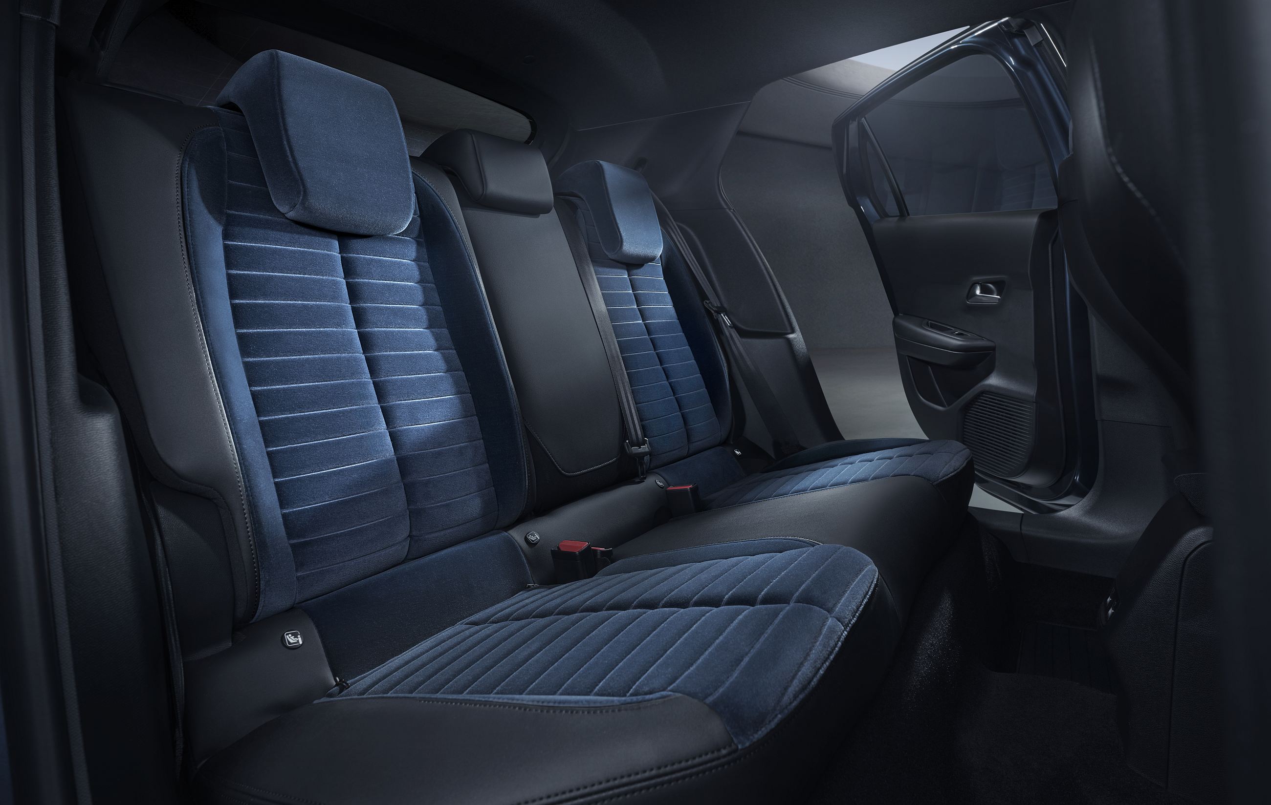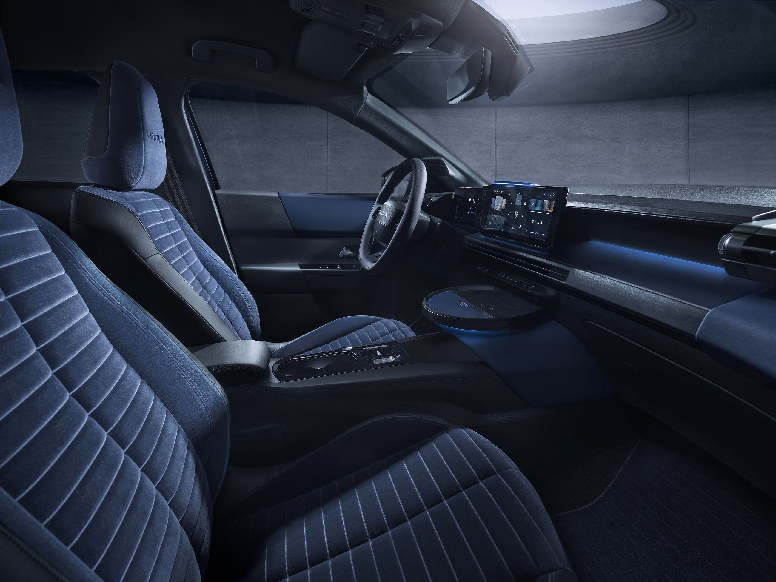 O veludo macio em fio azul 100% reciclado envolve os bancos, caracterizado pelo motivo “Cannelloni” e pela costura dupla, e a mesma tonalidade é utilizada no painel de instrumentos e nas inserções dos painéis das portas e do painel de instrumentos, criando um espaço interior elegante e coordenado.