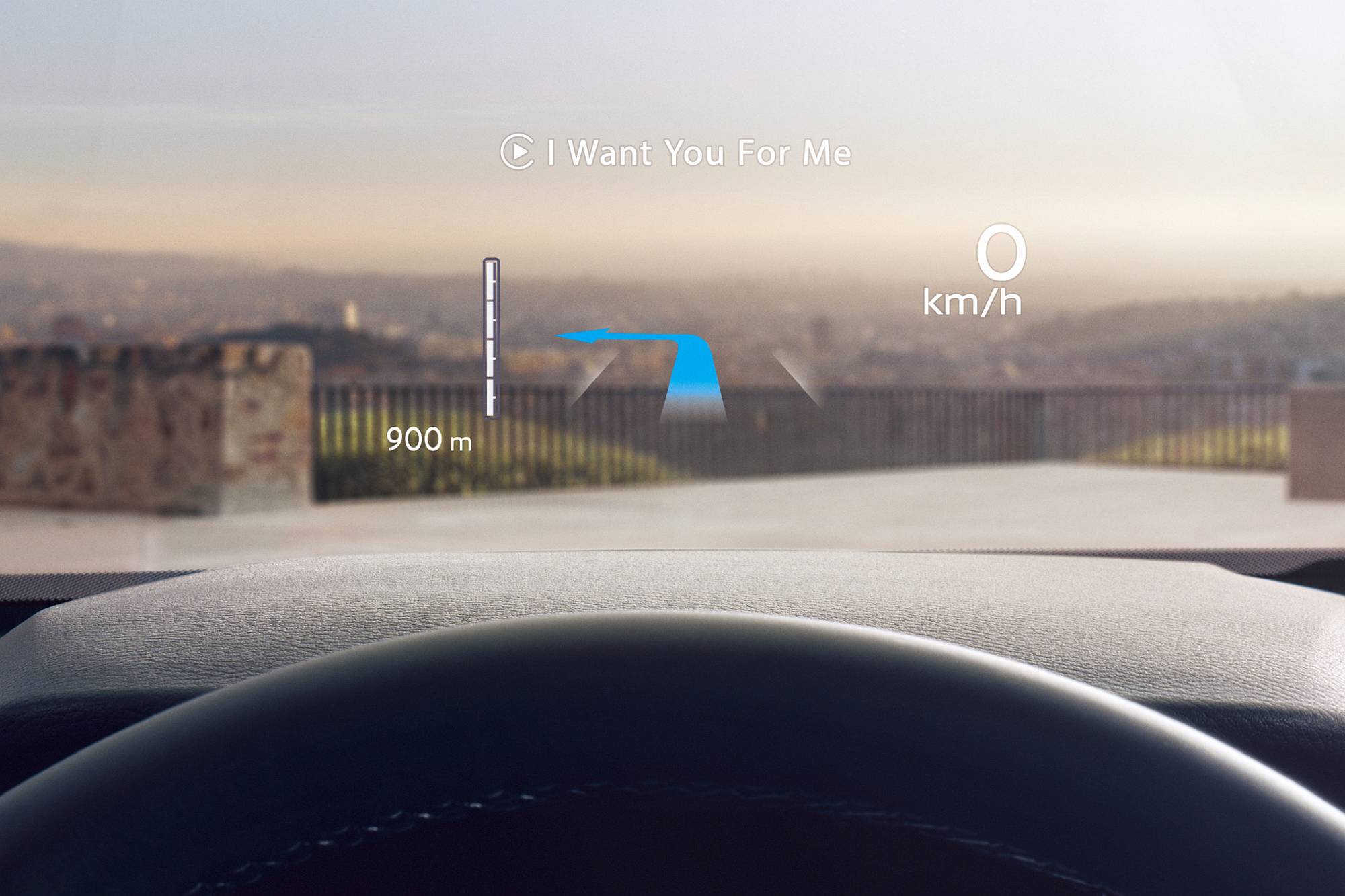 Um novo ecrã frontal projetado (HUD – Head-up Display) de 10.8 polegadas oferece o maior tamanho de imagem do segmento. As principais informações de navegação, assistência ao condutor e de estrada são projetadas no para-brisas, dentro da linha de visão do condutor.