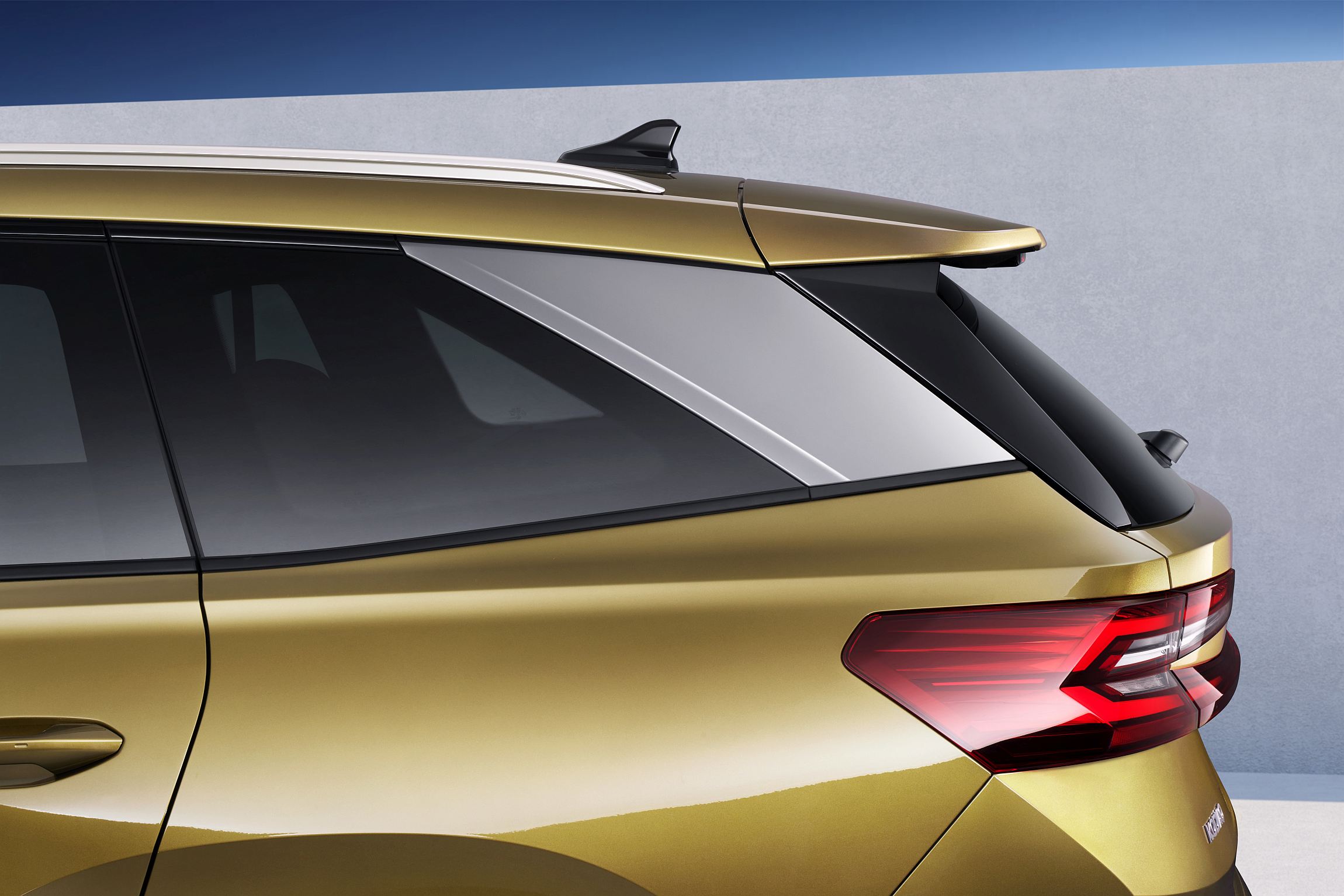 A lateral revela grande ‘limpeza’ em termos de arestas e vincos, destacando-se a linha de cintura elevada e o pilar C com maior superfície vidrada. Já a traseira conta com um para-choques que se ‘liga’ com as proteções em plástico negro das cavas das rodas, com o destaque a ser os farolins