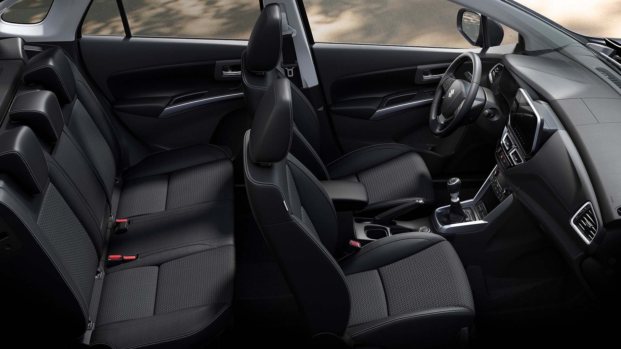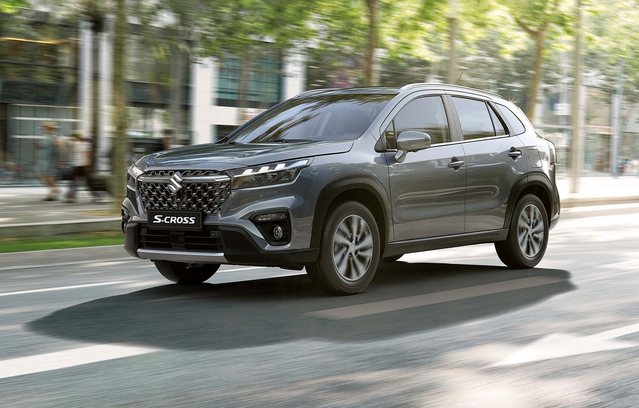A estética troca a sua exuberância pela elegância e refinamento, com destaque para uma grelha dianteira de generosas dimensões em preto brilhante, que se combina com faróis mais elegantes equipados com tecnologia LED de três pontos de alta luminosidade. Os guarda-lamas quadrangulares nas rodas dianteiras e traseiras, em conjunto com detalhes prateados à frente e atrás, transmitem a agressiva natureza SUV do novo S-Cross.