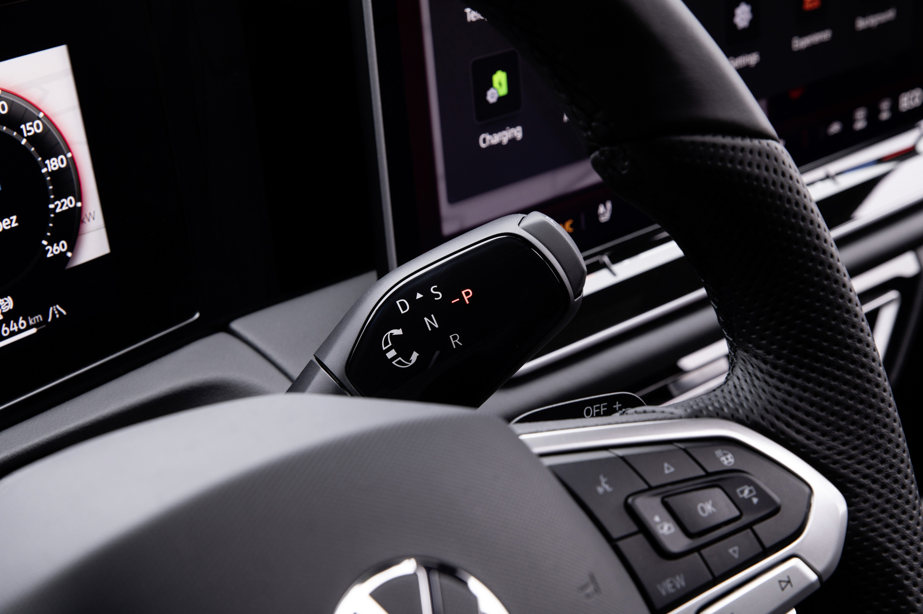 Tal como nos modelos Volkswagen ID. e no novo Passat, o seletor da caixa de velocidades passa a estar na coluna de direção, à direita do volante, com funcionamento igualmente semelhante: o comando é rodado para a frente para “D”, para conduzir, e para trás para “R” para marcha-atrás, enquanto o travão de estacionamento é ativado premindo a parte lateral do manípulo. Todos os modelos Tiguan dispõem adicionalmente de patilhas atrás do volante.