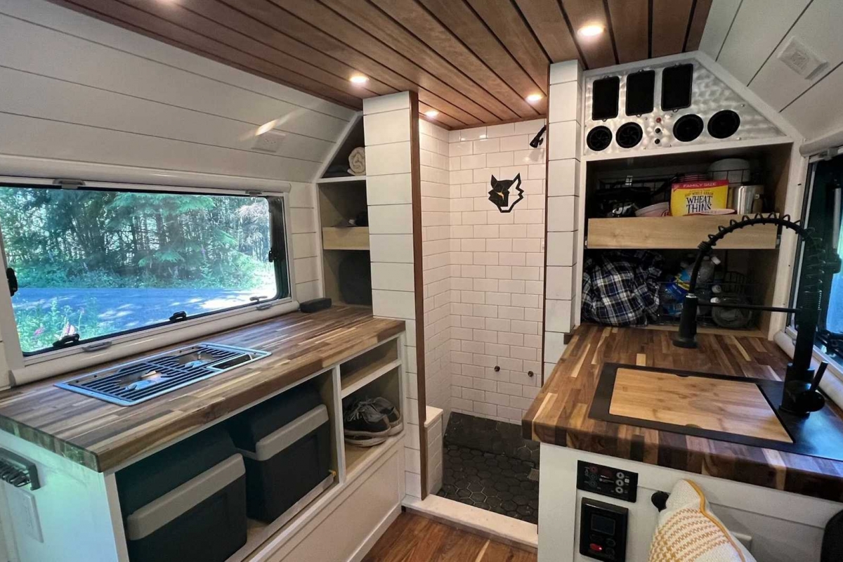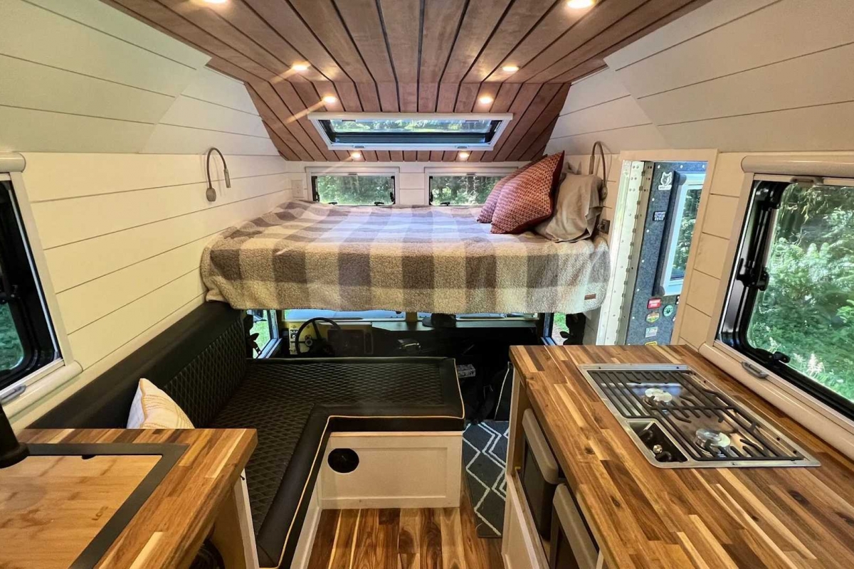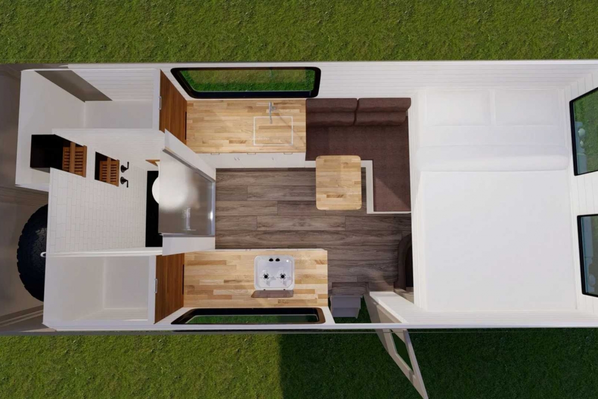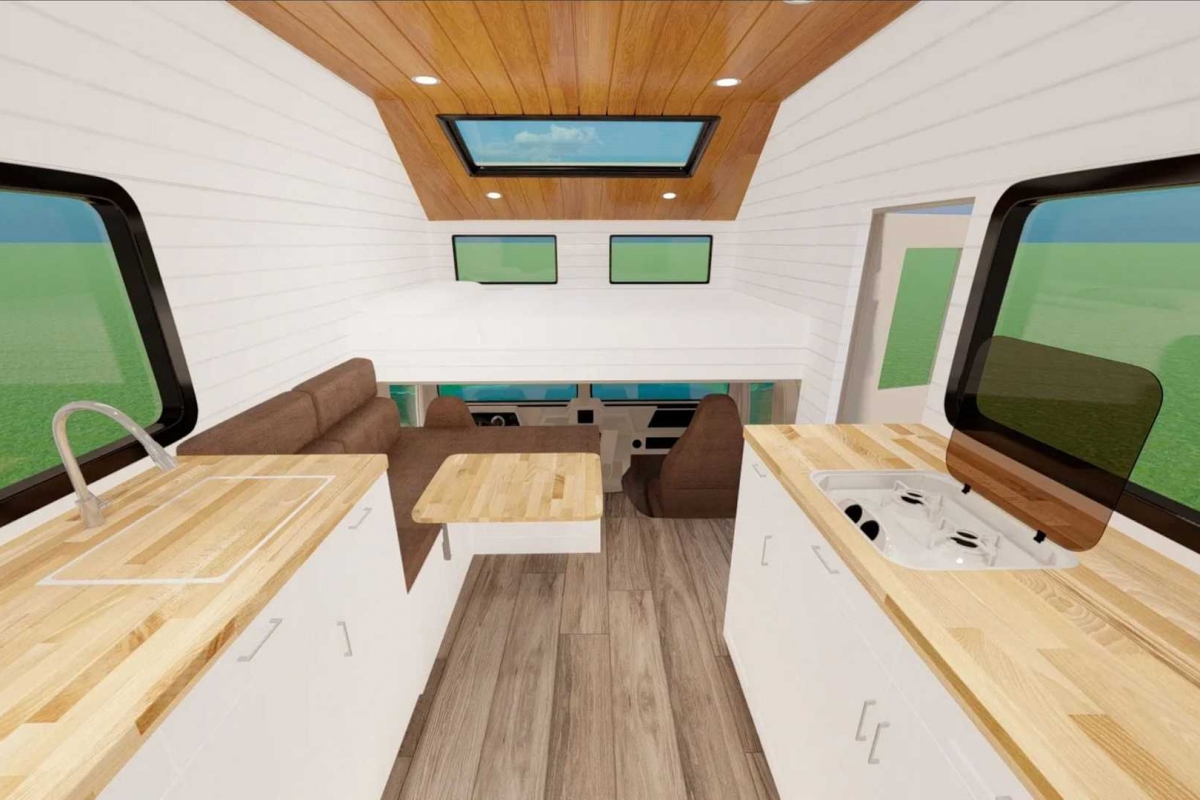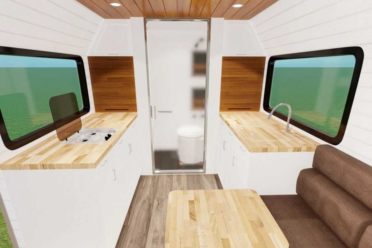 Em cima dos bancos dianteiros há uma cama de casal e, noutra divisão, a zona de estar em forma de L com “assentos extra grandes”, descreve o fabricante, paredes meias com a cozinha totalmente equipada.
