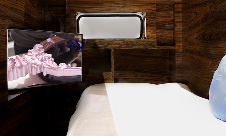 Está disponível com a “carroçaria” em fibra de vidro pintada em azul, rosa e negro, mas todos os pormenores exteriores podem ser configurados a gosto. No interior, completamente revestido em madeira, está a cama com 1,90 por 0,90 metros, uma secretária com tomadas de corrente, um minibar com frigorífico, sofá e televisão.