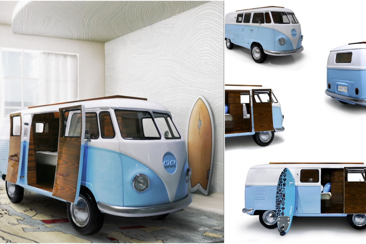 Empresa portuguesa de mobiliário juvenil comercializa réplica perfeita do clássico da Volkswagen, com cama, secretária e televisão para levar para o quarto.