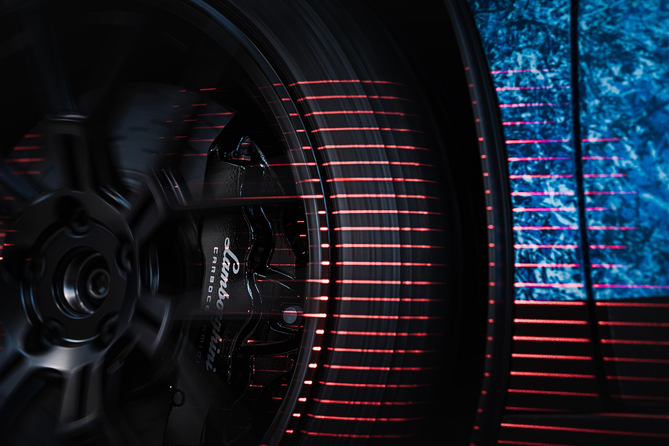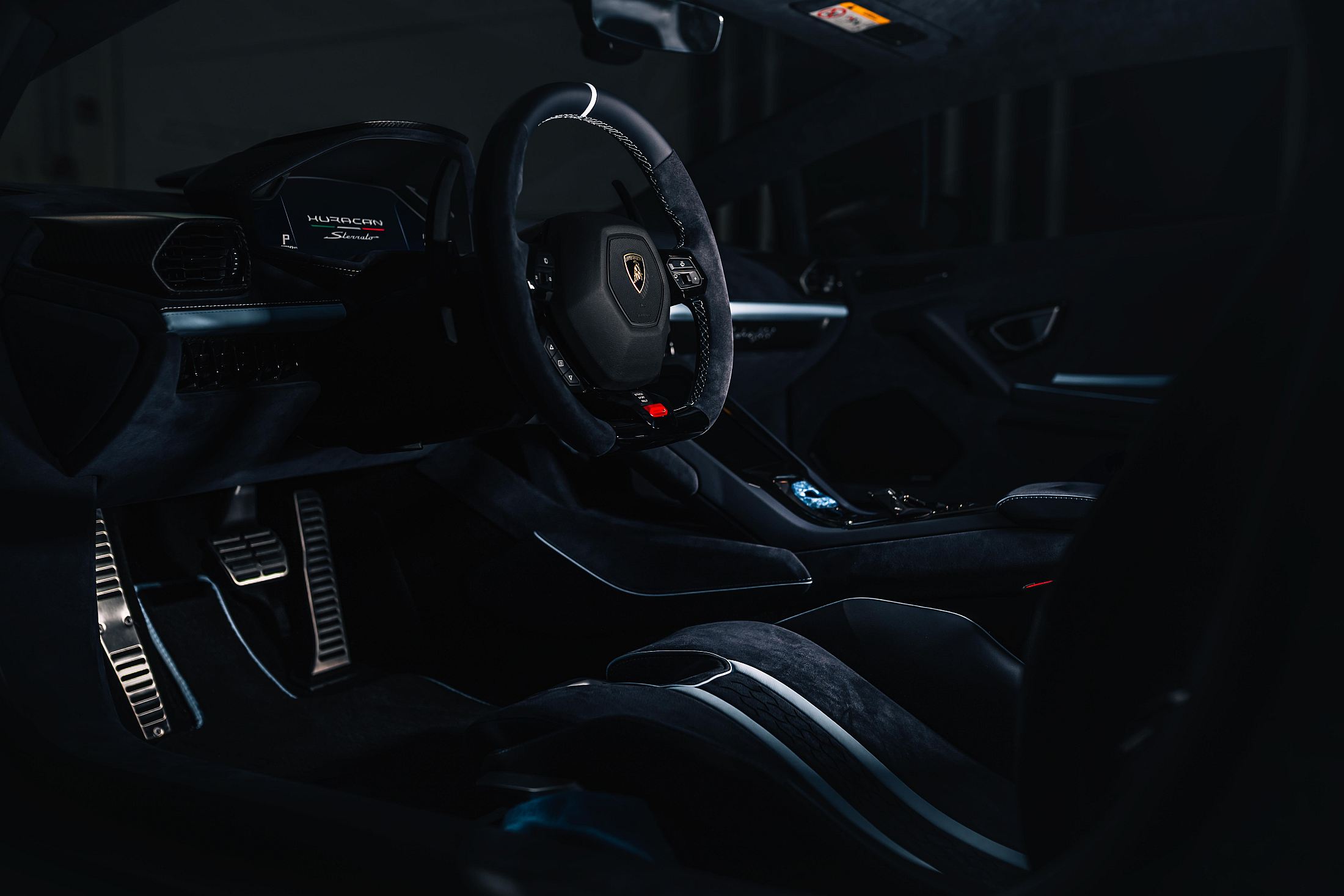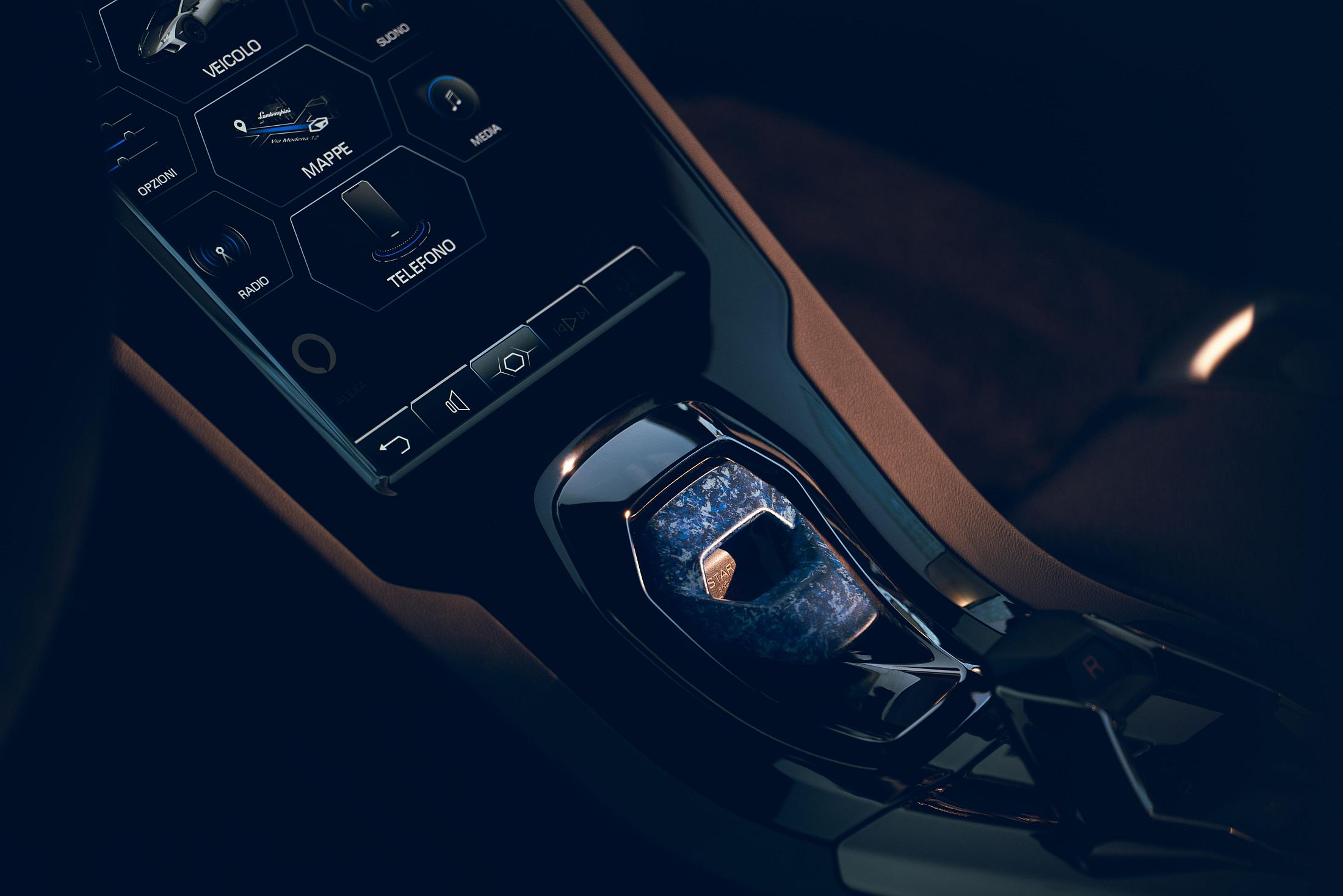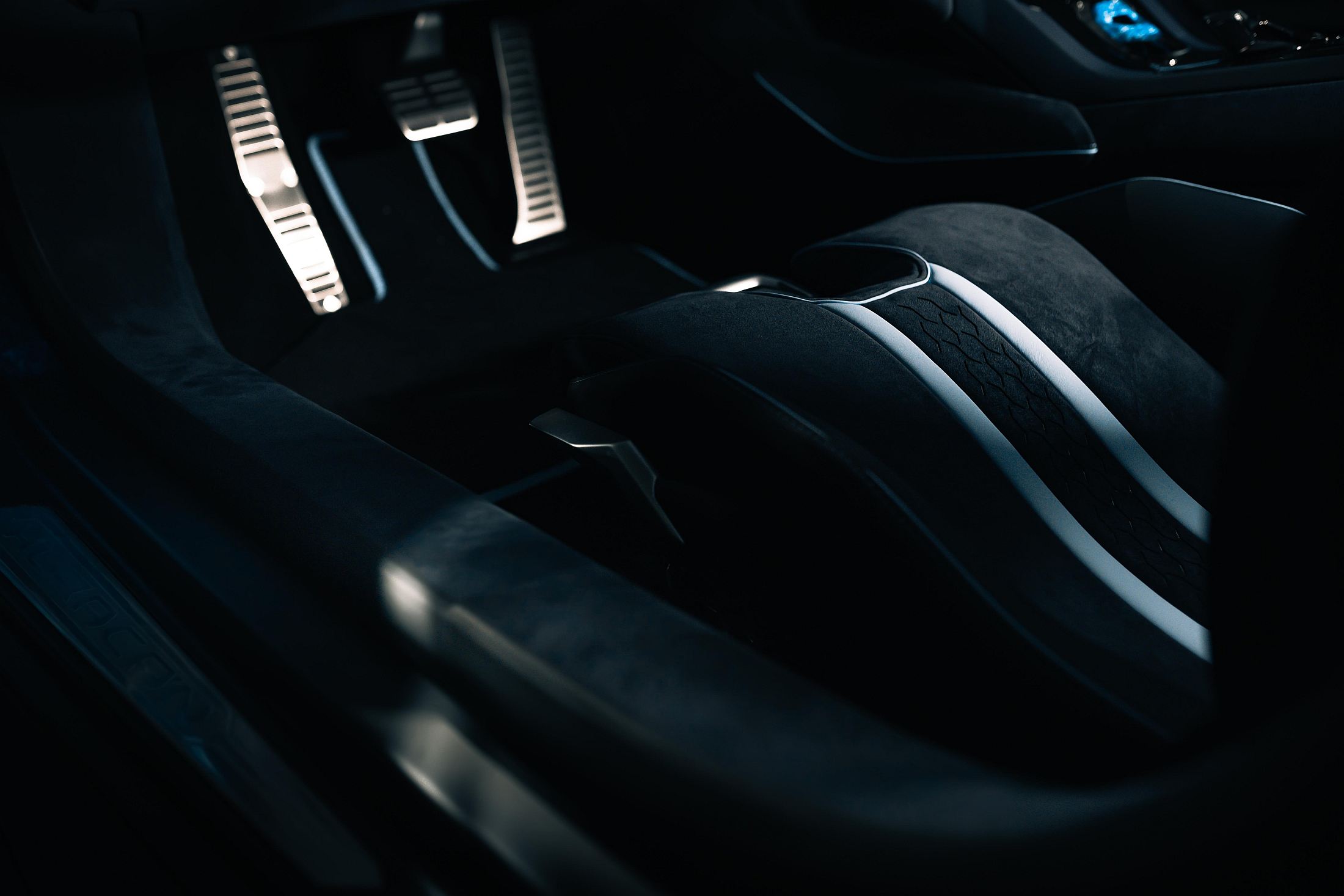 O interior desta peça exclusiva é tão especial como o exterior: revelando peças em fibra de carbono, com os bancos desportivos, painéis de porta e a consola, forrados a pele de cor ‘Blu Delphinus’. O painel de instrumentos é revestido em pele de Alcantara na mesma cor. Já o volante, combina dois materiais: a pele num tom mais claro de ‘Celeste Phoebe’. A pele, também é usada nos painéis complementares, com bordados que apresentam o logo da Lamborghini, fazendo lembrar o estilo de vida ligado ao mar.