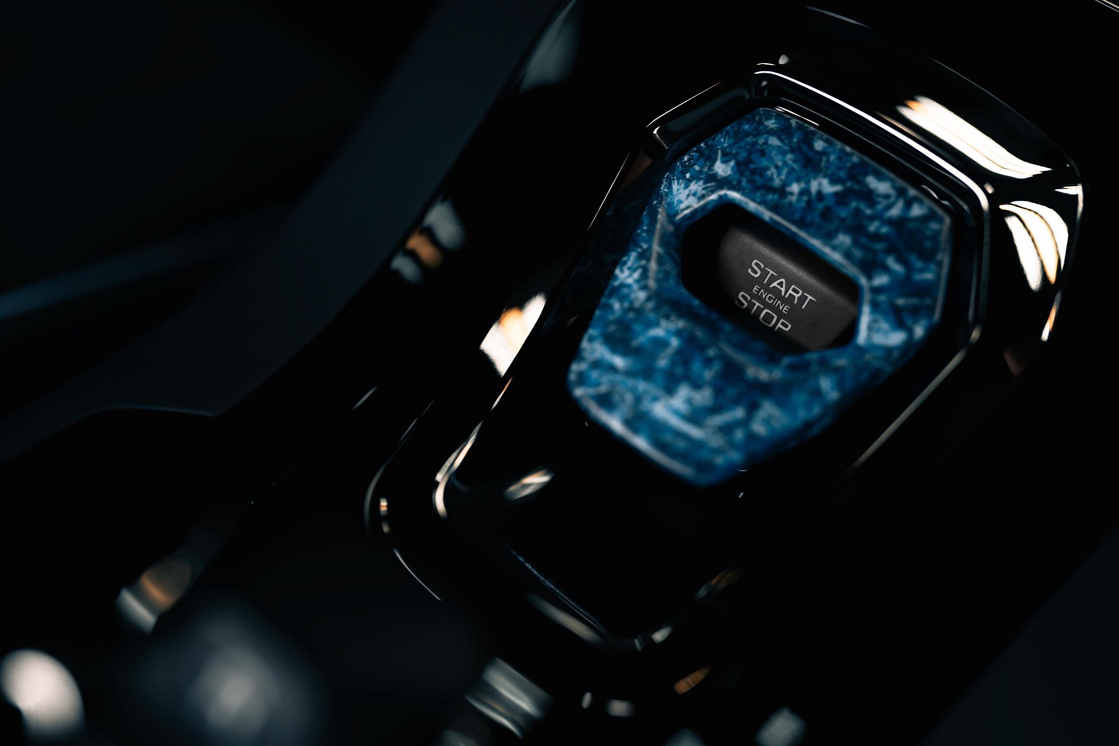 O assento, tem um desenho marcado a laser na cor prata e até a cobertura do botão de ignição, colocado na consola central, tem um acabamento com o efeito da pintura cristal do exterior.