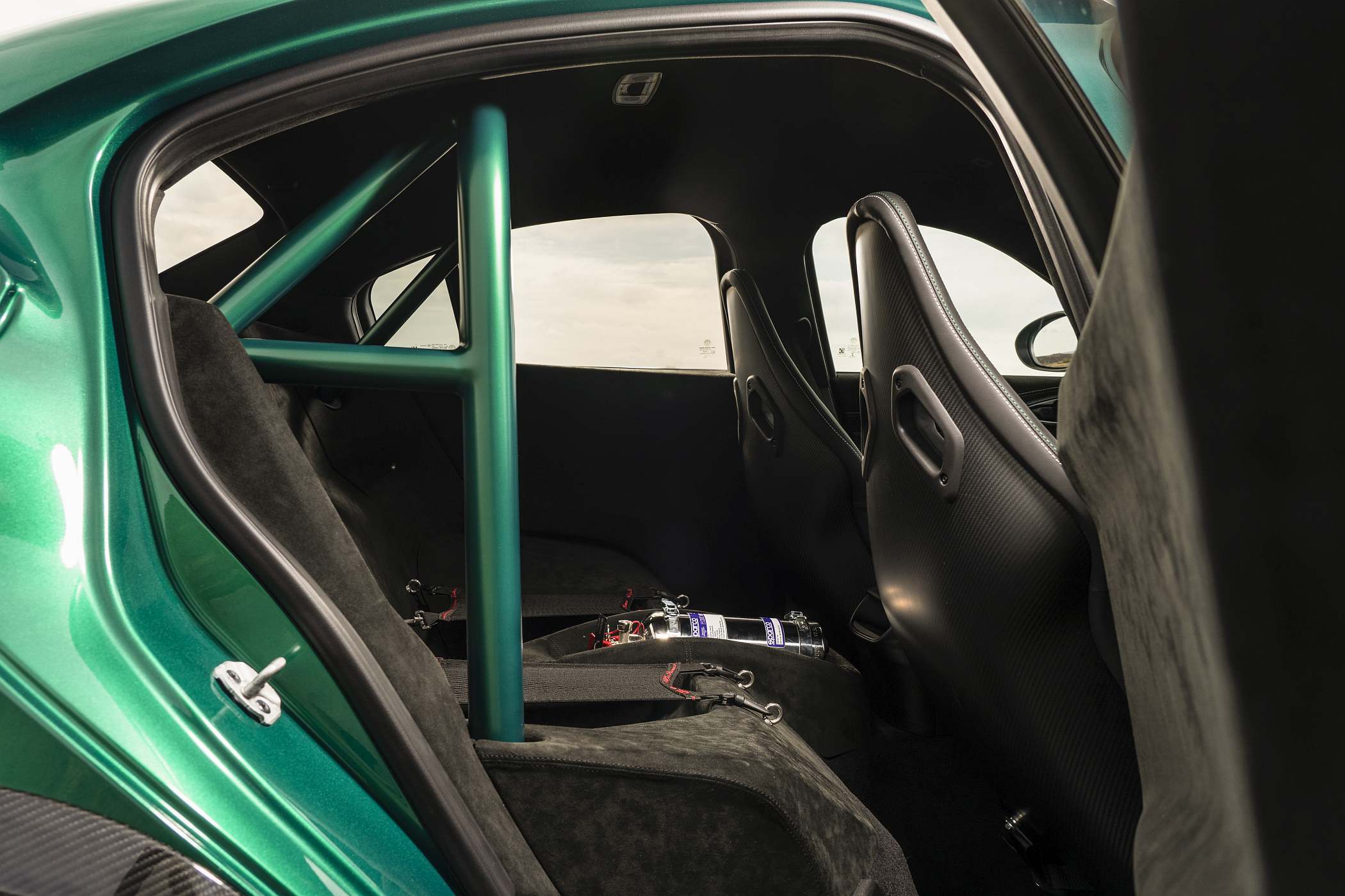 Os revestimentos em Alcantara multiplicam-se em pontos como o tablier, painéis das portas, porta-luvas, pilares laterais e revestimento central dos bancos, sendo ainda mais extensiva no GTAm, de onde os bancos traseiros foram removidos para dar lugar a um “recipiente” totalmente revestido e provido de estruturas moldadas para acolher capacetes e um extintor. A versão GTA, igualmente com 540 CV, oferece cinco lugares.