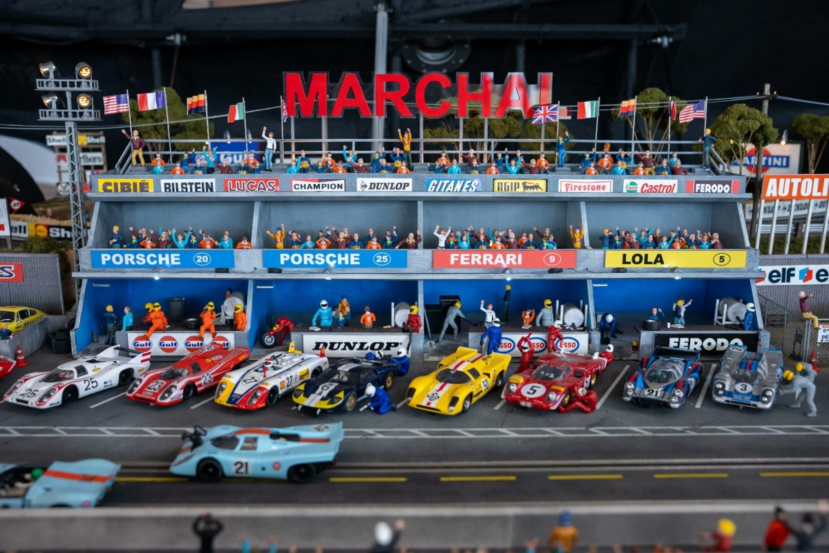 O conjunto ainda inclui 19 ‘slot cars’ à escala 1:32, entre os quais várias versões em miniatura do 917 e os Ford GT40, Lola T70 e Ferrari 512 Coda Lunga do filme, os respetivos pilotos, espetadores e mecânicos com fatos da época, todos os elementos pintados à mão.