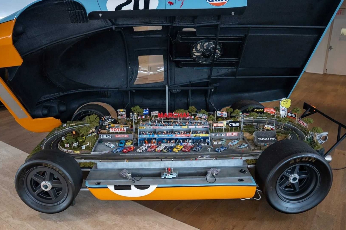 Criada pelos norte-americanos da Slot Mods Raceway, a pista com cerca de 4 metros de comprimento e quase 2 metros em largura recria o cenário do filme “Le Mans” de 1971 e está instalada no interior de uma réplica do mítico Porsche, o #20 pintado com as icónicas cores da Gulf conduzido por Michael Delaney no filme, o personagem interpretado por Steve McQueen.