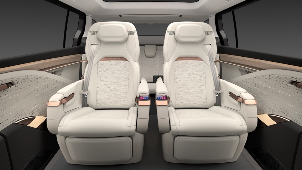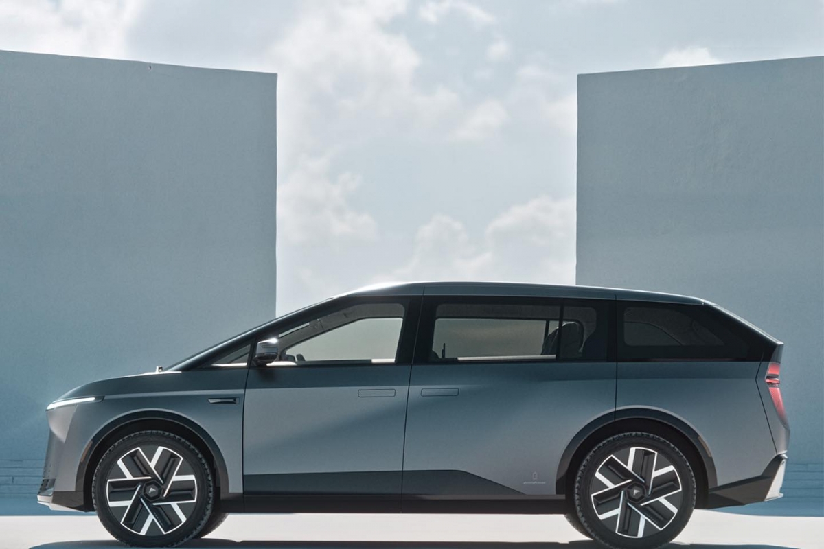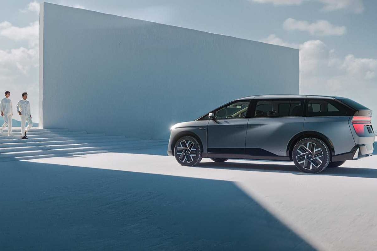 De lado, o perfil do Modelo D reflecte uma ênfase no espaço e na aerodinâmica. A linha do tejadilho ligeiramente inclinada e os puxadores das portas embutidos contribuem para a sua aparência elegante. Os caixilhos das janelas escurecidos misturam-se suavemente com a carroçaria, criando um efeito de vidro quase flutuante que acrescenta um toque de elegância. A longa distância entre eixos indica o generoso espaço interior, garantindo o conforto de todos os passageiros.