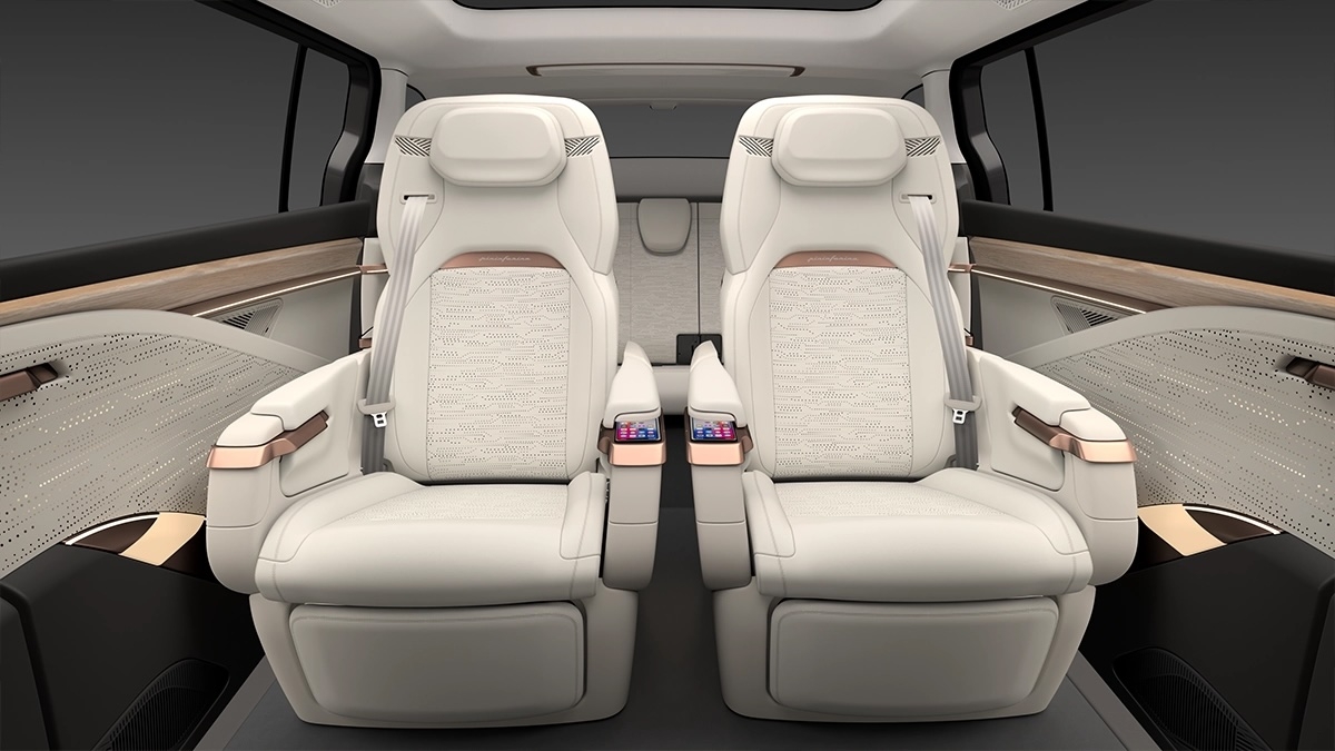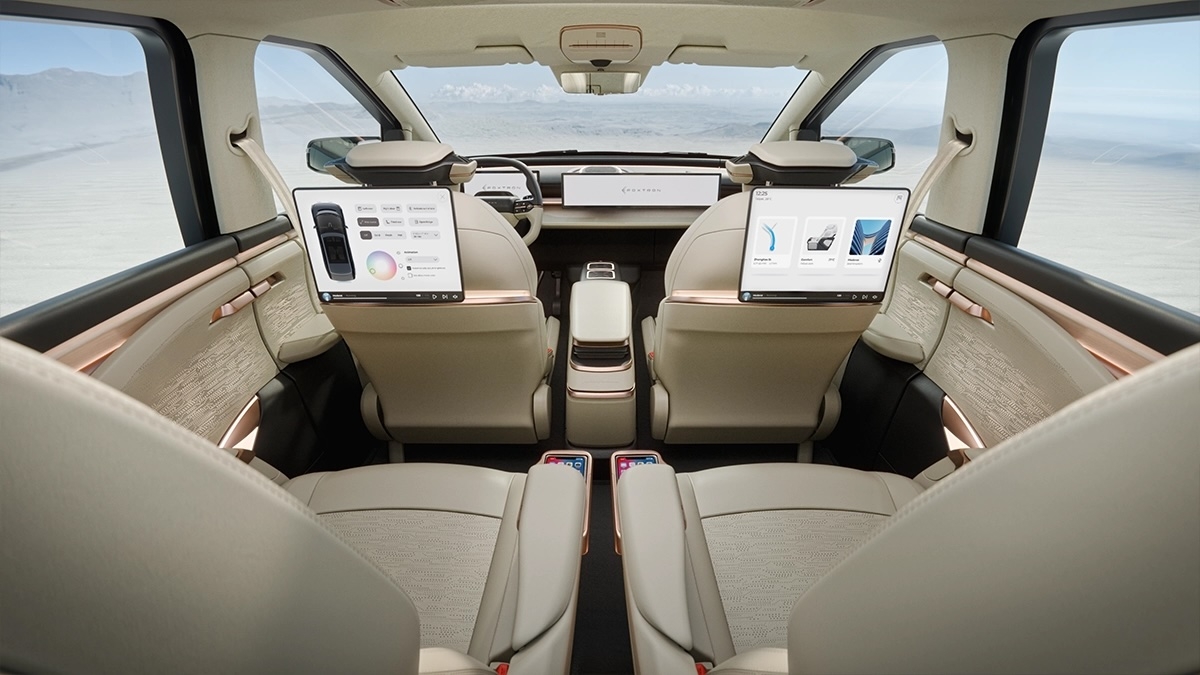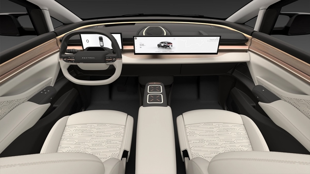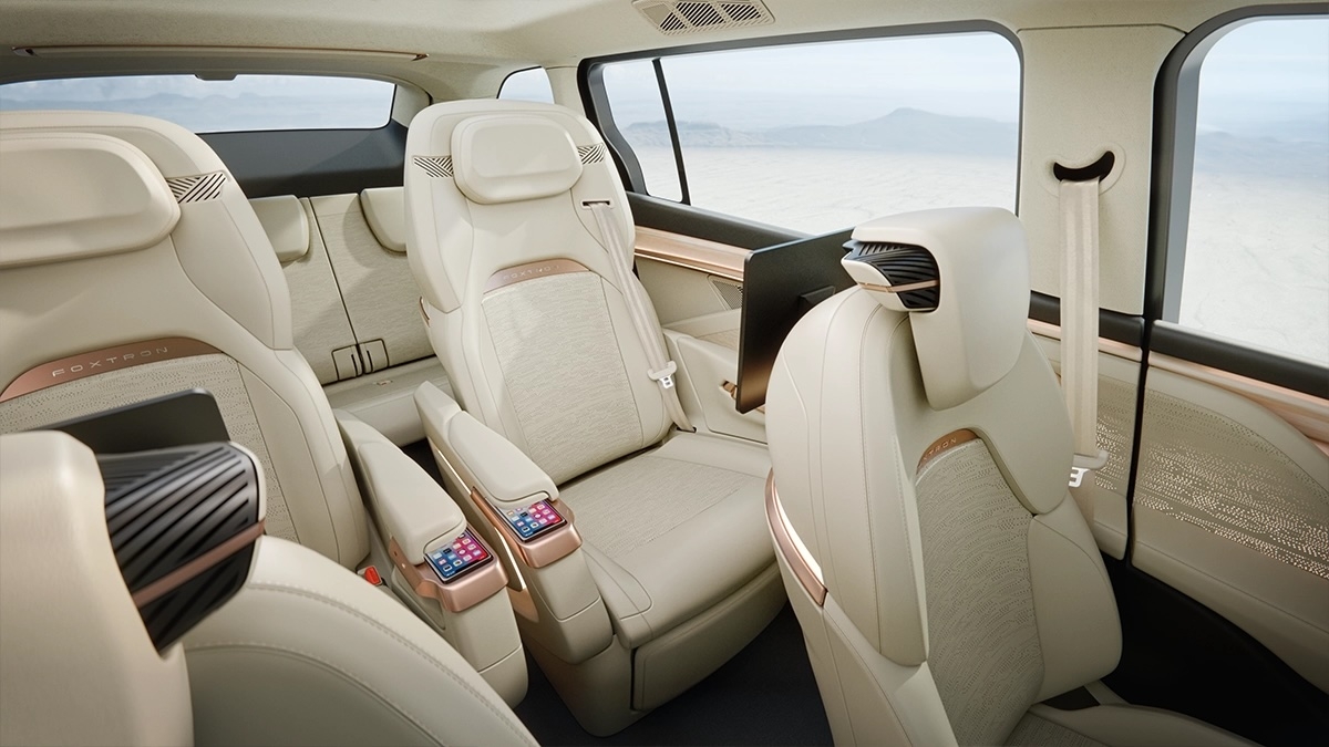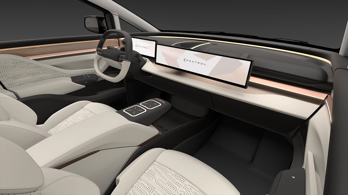 No interior, o Modelo D da Foxconn não desilude. O painel de instrumentos minimalista é dominado por um ecrã digital amplo e contínuo que integra o painel de instrumentos do condutor e o sistema central de infoentretenimento. A ausência de botões físicos confere ao cockpit um aspeto limpo e organizado, que é simultaneamente esteticamente agradável e altamente funcional. Os detalhes em cobre ao longo do painel de instrumentos e das guarnições das portas acrescentam calor ao interior, contrastando lindamente com os tons neutros dos estofos em pele.