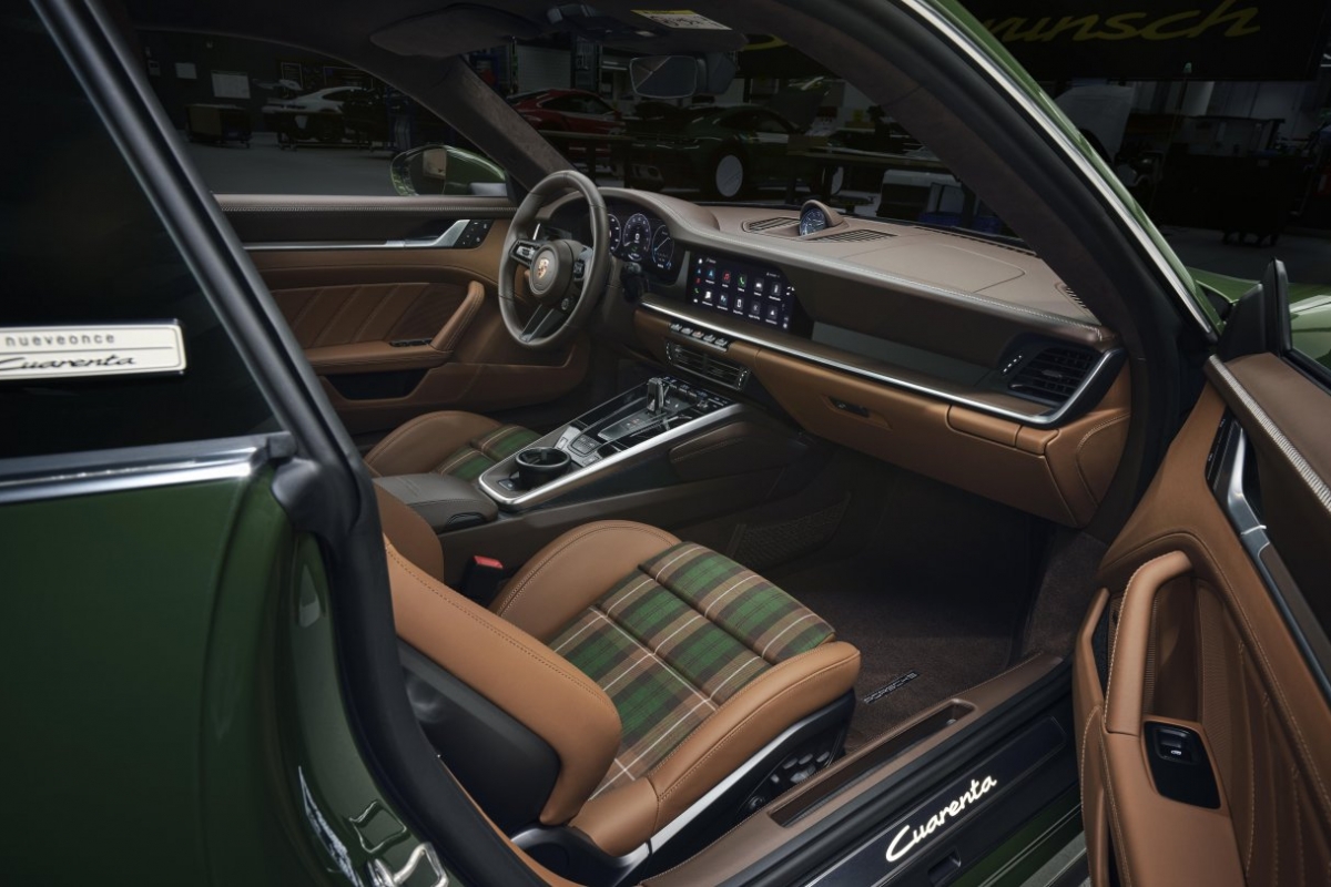 Neste 911 Cuarenta Edition, foram aplicados pespontos em Crayon e Castanho Trufa no tablier e nas secções superiores das portas. A costura cruzada e um processo totalmente artesanal, com os especialistas a coserem cada ponto à mão, um pormenor que sublinha o conceito de interior de luxo deste automóvel. Os bancos Desportivos Adaptativos Plus (18 vias, elétricos) e os bancos traseiros são em Pele em Castanho Cohiba, com os centros revestidos com o novo tecido tartan. O elegante acabamento em Crayon, aplicado à frente e atrás, acentua o conceito de luxo. Os bancos dianteiros têm a inscrição “Cuarenta” em relevo nos encostos de cabeça.