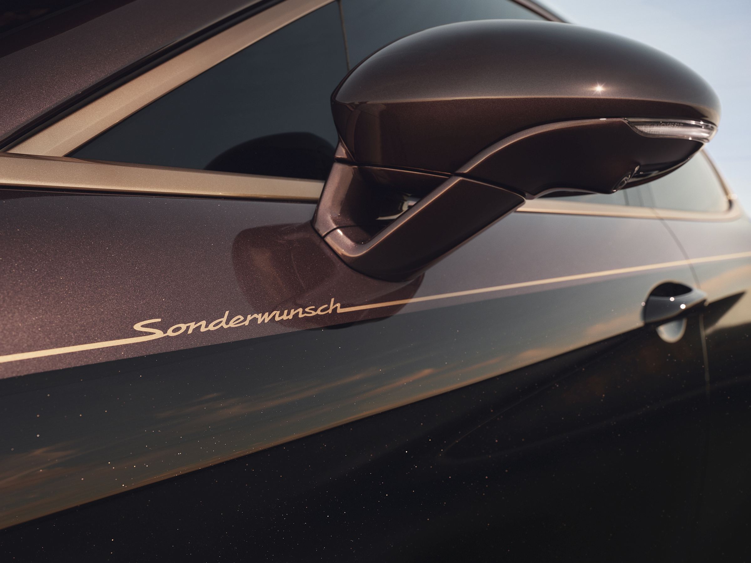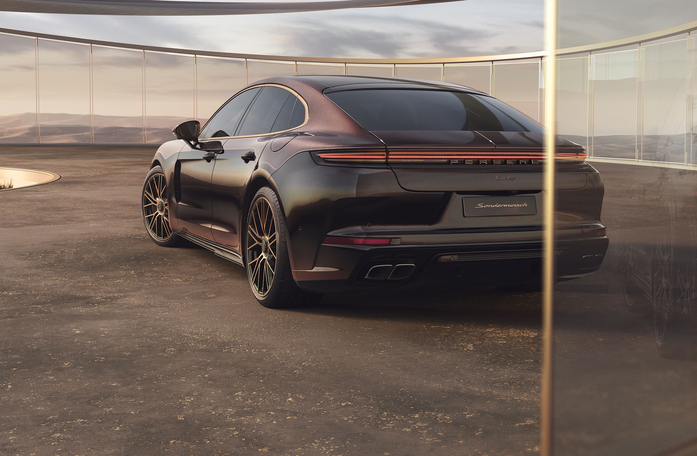 O revestimento transparente do Panamera Turbo Sonderwunsch contém focos vaporizados com ouro verdadeiro, o que permite criar um aspeto premium com efeito de profundidade. O exterior também apresenta faixas com o logótipo Sonderwunsch, na também recém-desenvolvida cor Avium Metallic. As jantes de 21 polegadas com porca de aperto central, bem como as molduras das janelas laterais, também têm acabamento em Avium Metallic. Já o interior foi deliberadamente deixado inacabado até ao próximo ano.