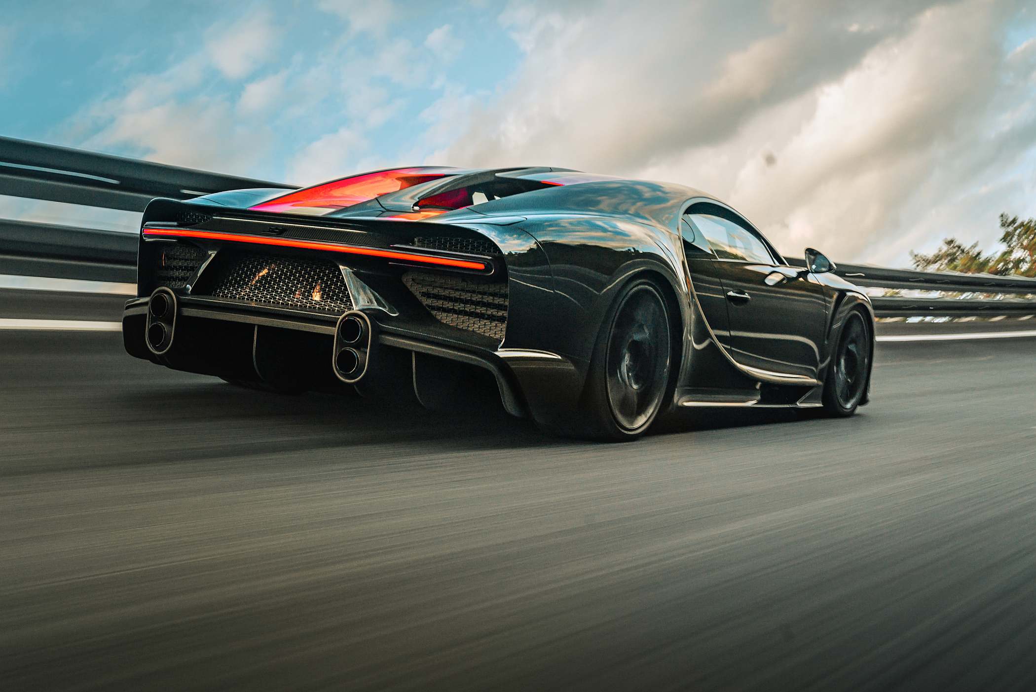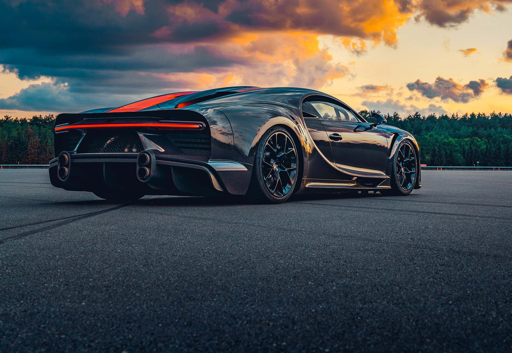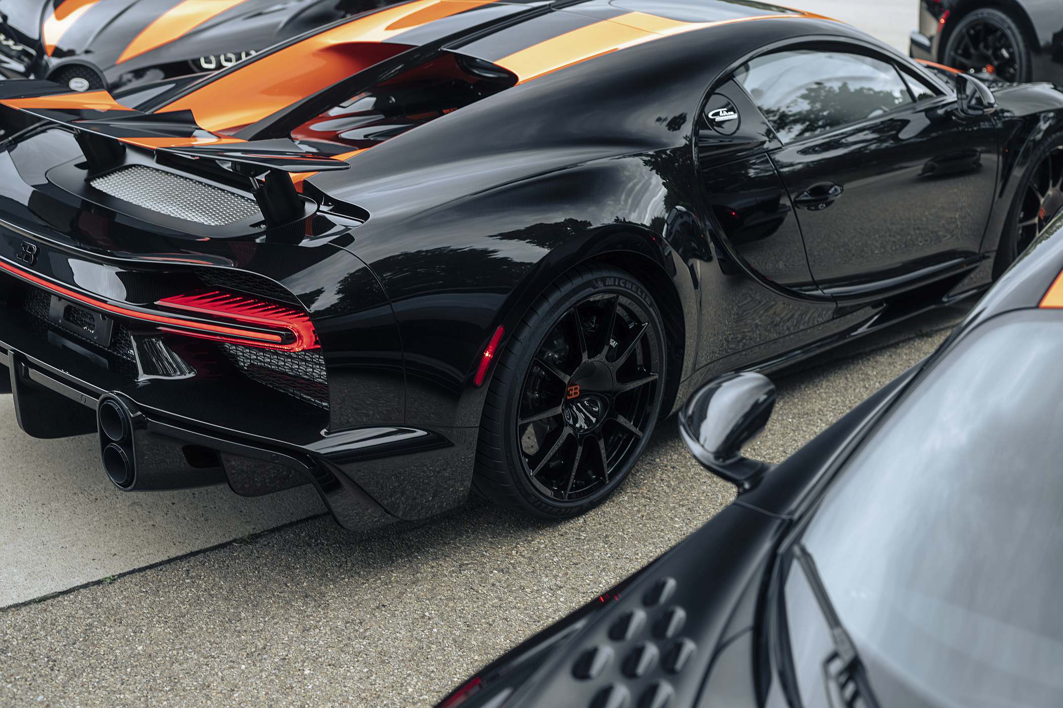 De resto, a carroçaria esguia do Chiron Super Sport 300+ deixa à mostra a fibra de carbono em preto, com grafismos a laranja no centro do veículo.