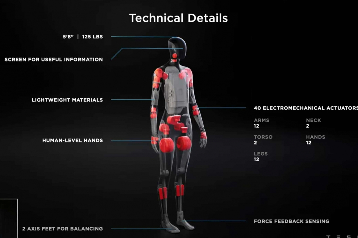 Sem revelar muitos mais pormenores sobre o concept, Musk indicou que este primeiro Tesla com pernas para andar vai um ecrã no lugar do “rosto”, onde serão projetadas todas as informações úteis e mais revelantes. Terá a figura de um humano de estatura média, com uma altura de 1,76m e 57kg de peso, sendo capaz de transportar volumes até 20kg.