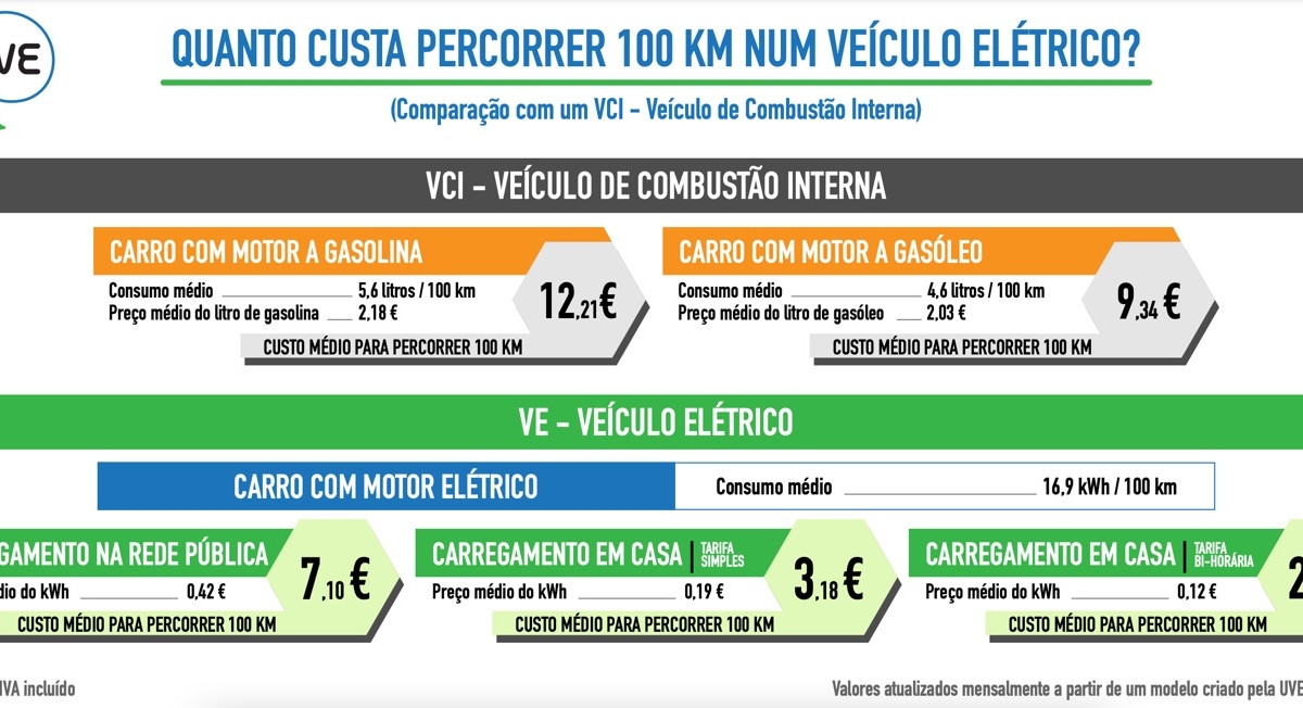 Aquela associação criou um modelo de análise para comparar o custo de utilização por 100 km, já tendo em conta os valores dos vários tipos de postos da rede pública de carregamento em Portugal, carregamento em casa/condomínio (tarifa de eletricidade simples e bi-horária), e o consumo real dos vários modelos de veículos automóveis 100% elétricos em circulação no país.