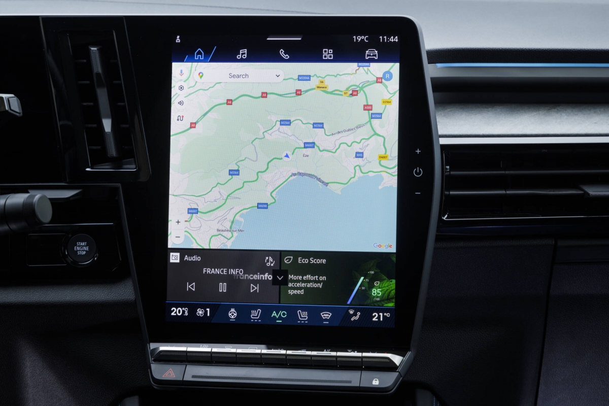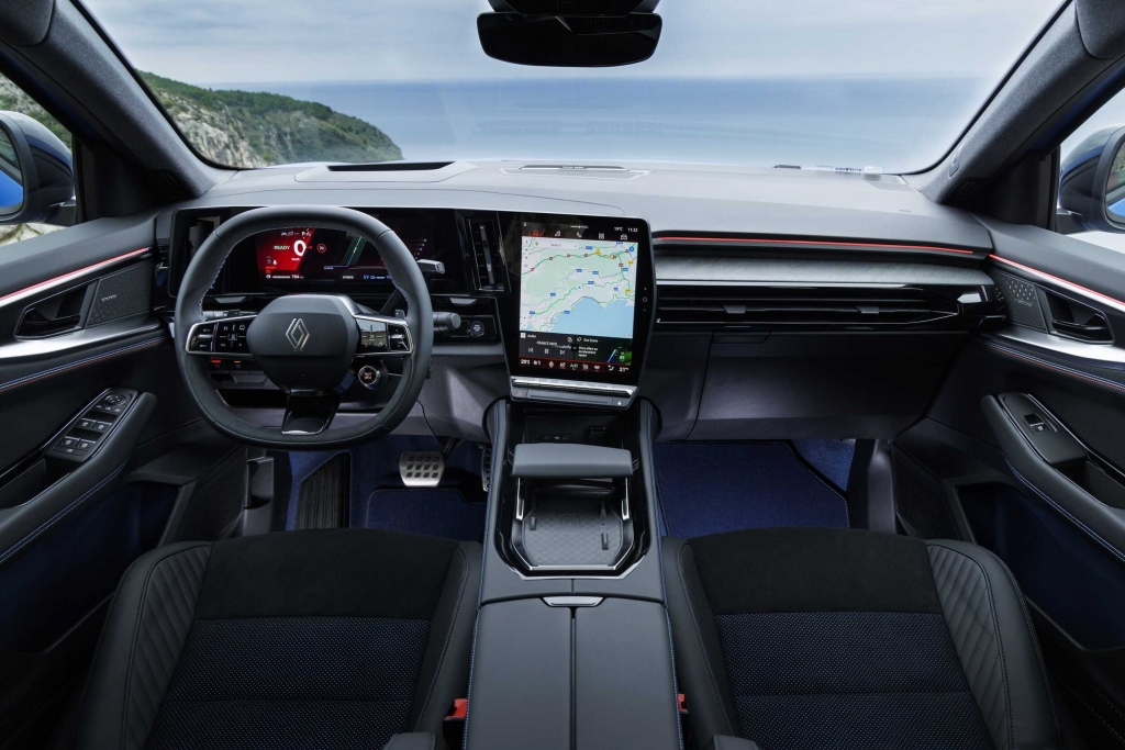 No interior do Rafale, a utilização generalizada de materiais macios e de camurça Alcantara confere às versões Esprit Alpine um toque luxuoso e sofisticado, utiliza o mesmo cockpit do Austral com um painel de instrumentos de alta resolução com 12,3 polegadas e um ecrã vertical para multimédia com 12,0 “ virado para o condutor. Destacamos o infoentretenimento OpenR Link, equipado com navegação Google e suporte para Android Auto e Apple CarPlay. A utilização do ecrã é auto-explicativa. Em alternativa é possível utilizar o assistente de voz, podendo até pedir para escurecer automaticamente o enorme teto de vidro panorâmico Solarbay.