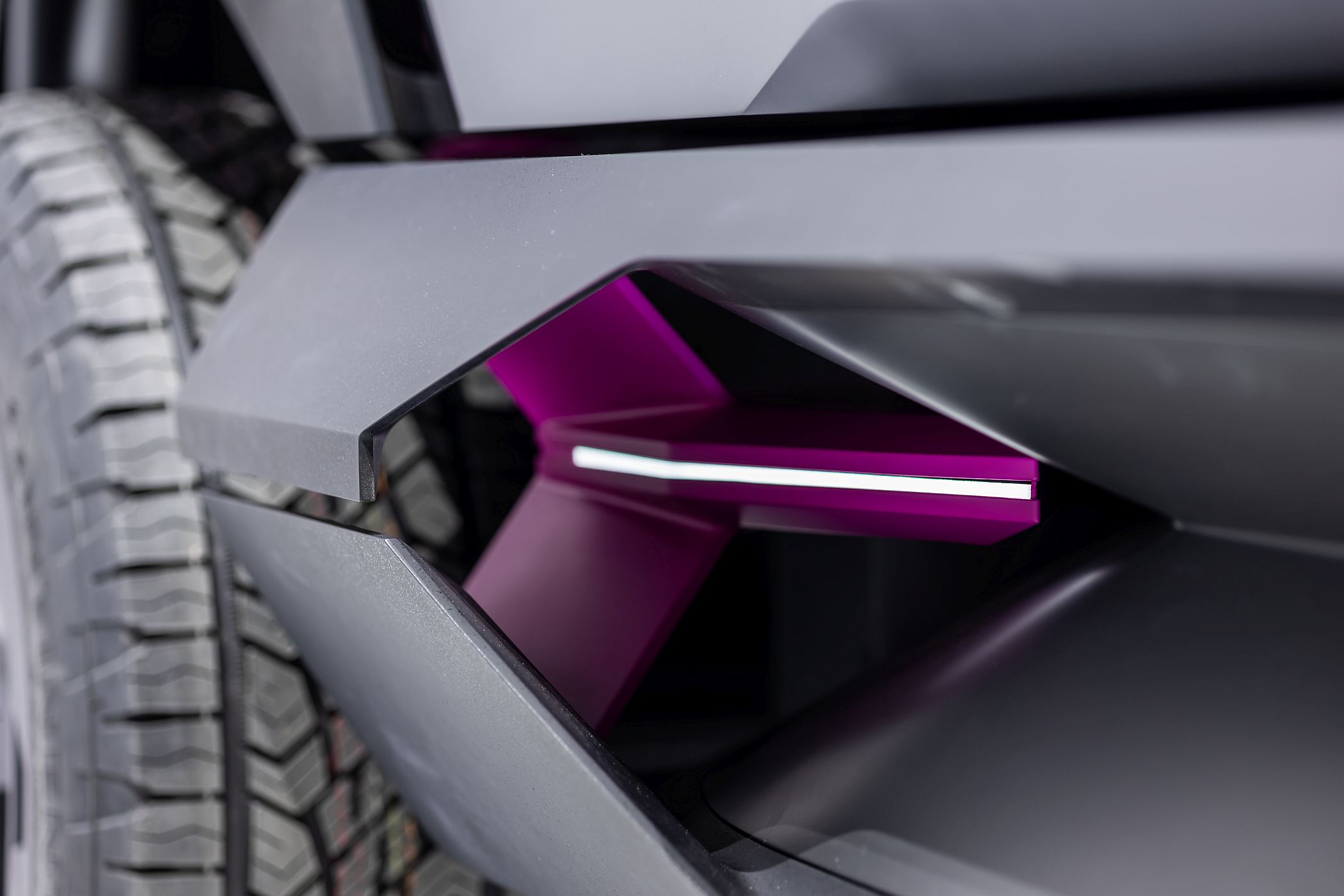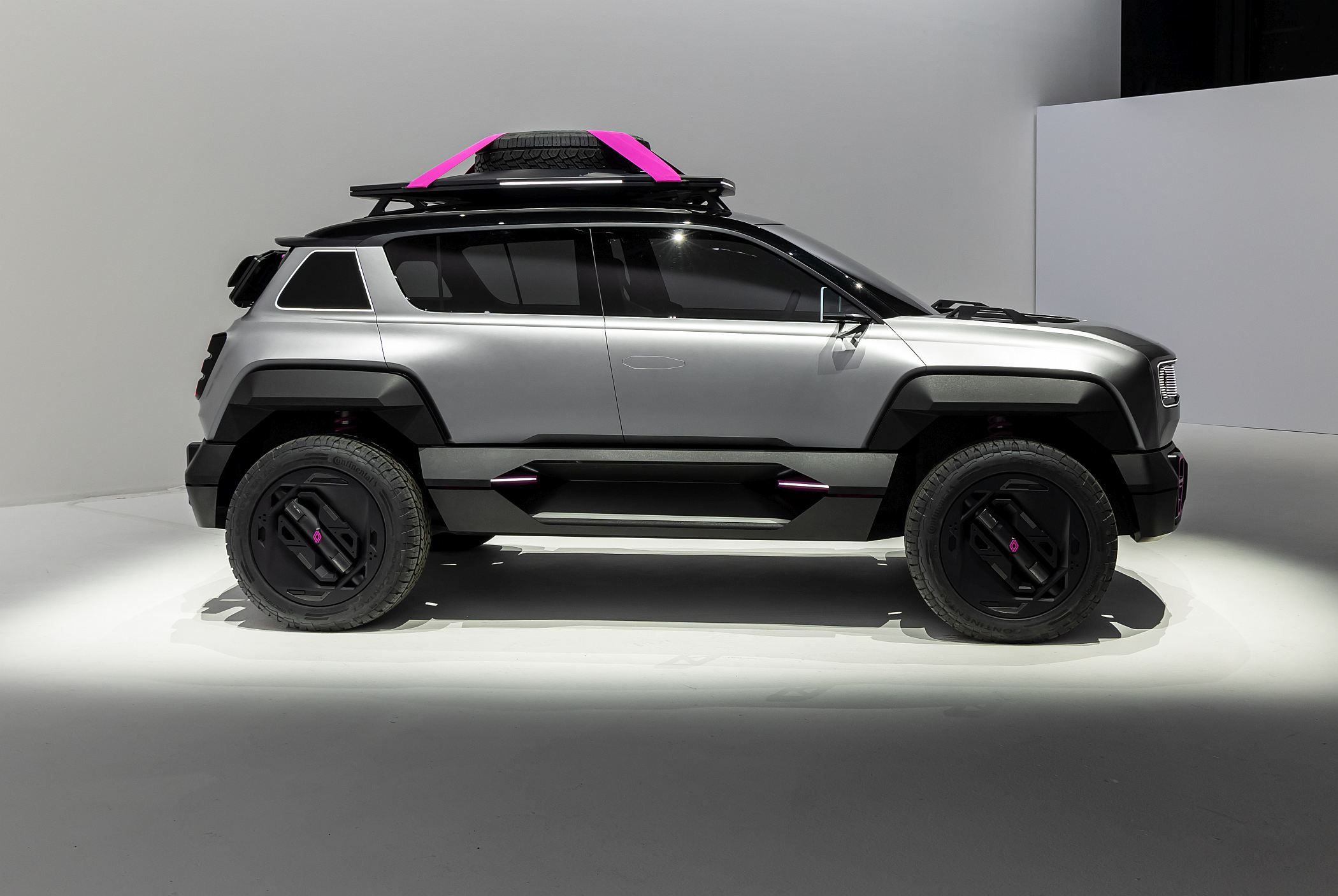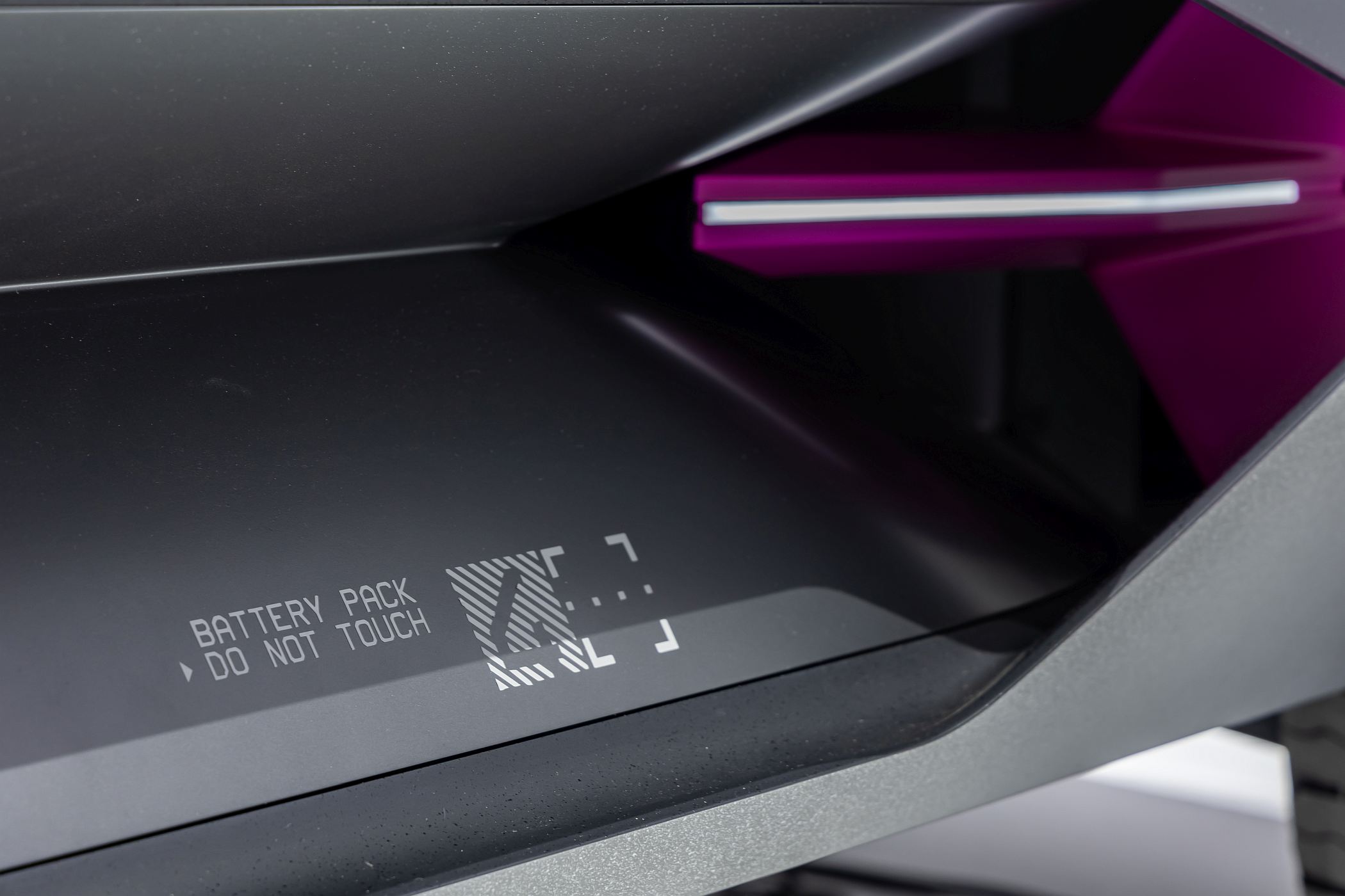 O capot demarca-se pela ampla entrada de ar e pelas pegas laterais, enquanto as saias laterais são igualmente volumosas e intrincadas no seu design, indicando também o local onde encontra a bateria de iões de lítio de 42 kWh. O fundo do veículo foi reforçado para oferecer uma maior proteção à bateria ali situada.