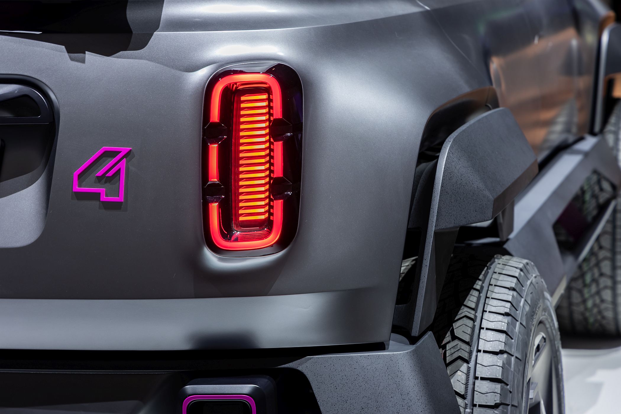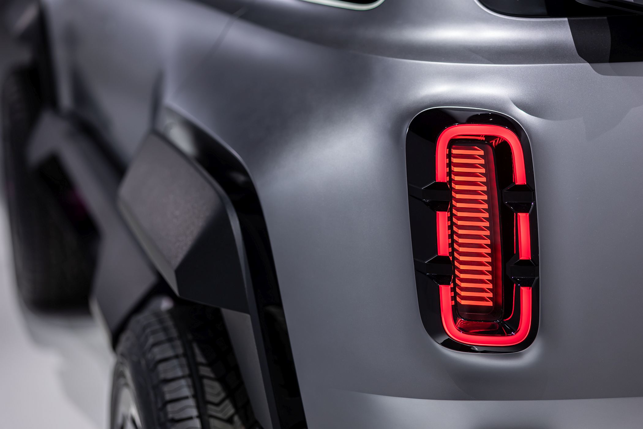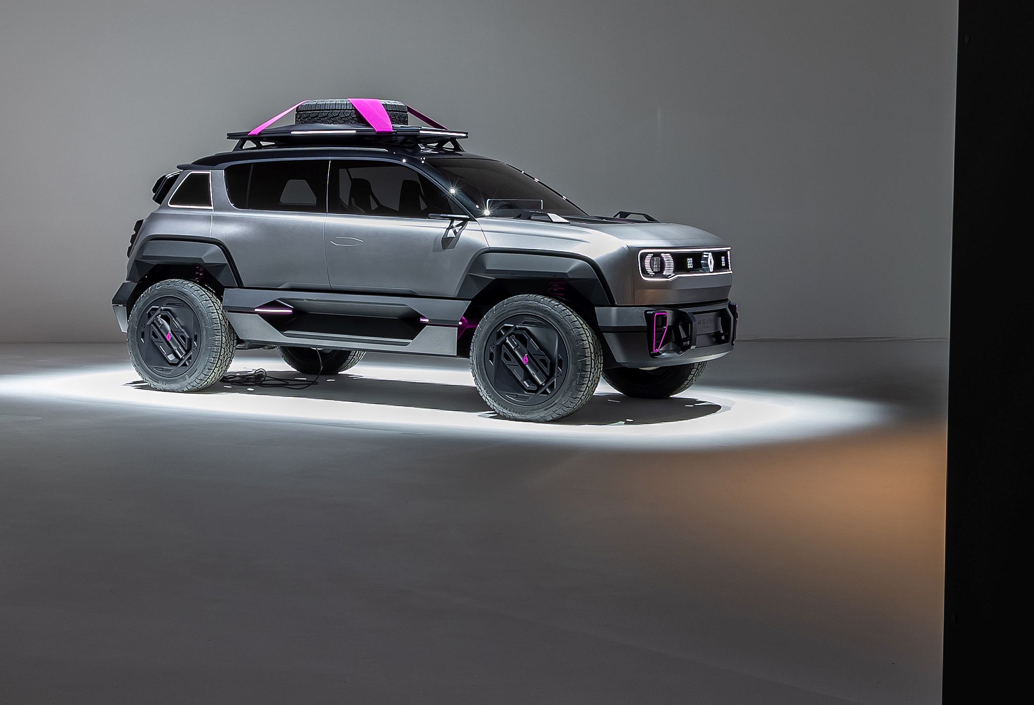 O capot demarca-se pela ampla entrada de ar e pelas pegas laterais, enquanto as saias laterais são igualmente volumosas e intrincadas no seu design, indicando também o local onde encontra a bateria de iões de lítio de 42 kWh. O fundo do veículo foi reforçado para oferecer uma maior proteção à bateria ali situada.