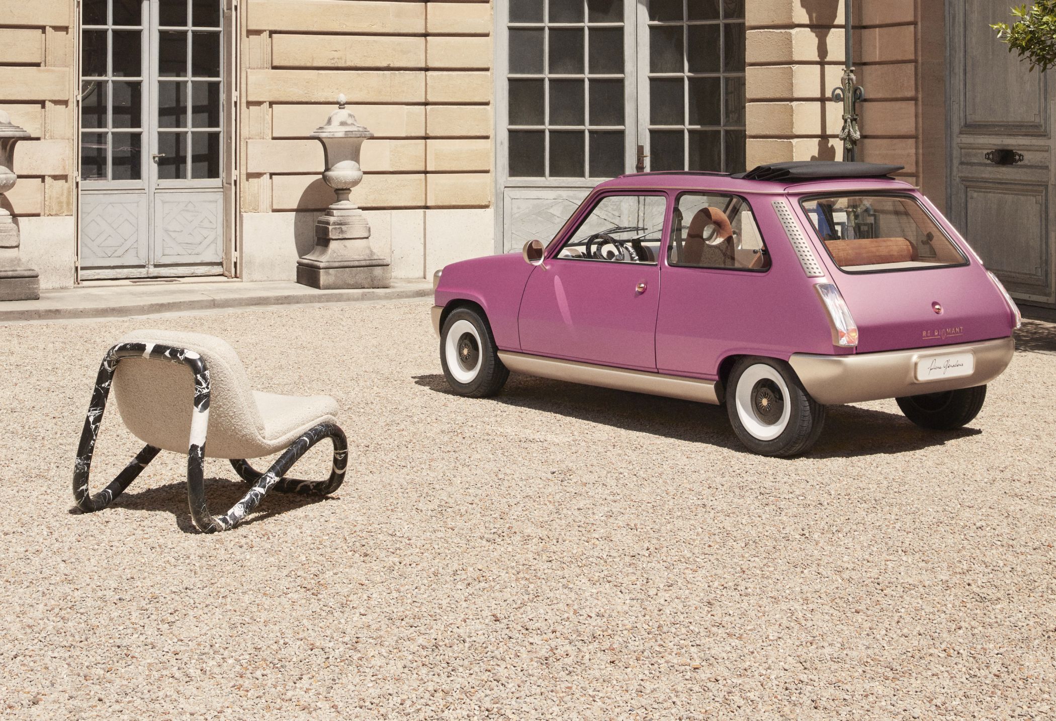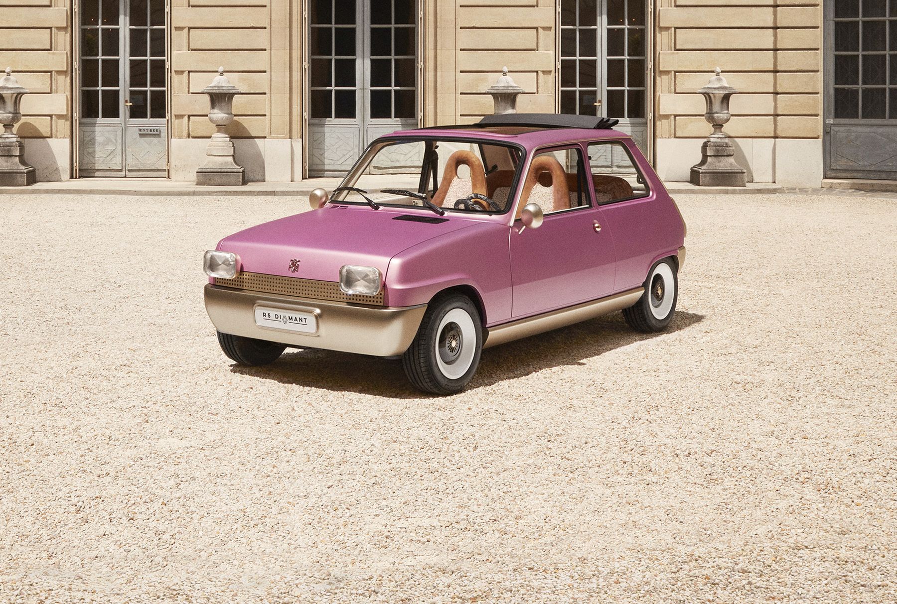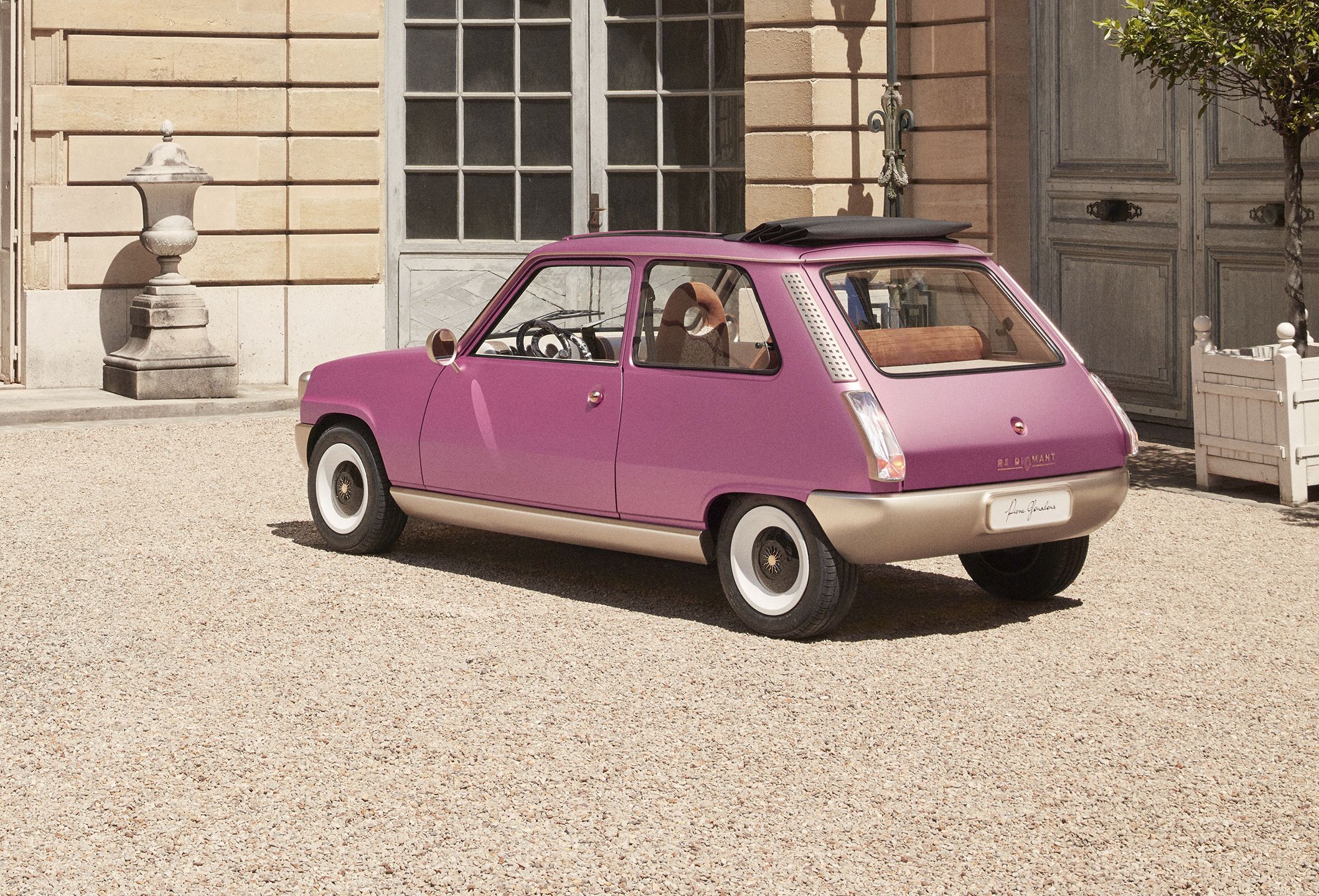 Entre os elementos mais chamativos estão os faróis destacados da carroçaria na dianteira, a que se junta a grelha simplista perfurada e o para-choques maciço e sem aberturas. As rodas são provenientes das unidades utilizadas na versão Alpine mais desportiva, enquanto o perfil é ainda marcado pelos espelhos circulares cromados para uma perfeita sensação ‘retro’. Já as pegas das portas (por fora e por dentro) são agora em formato de esferas douradas com banho de ouro.