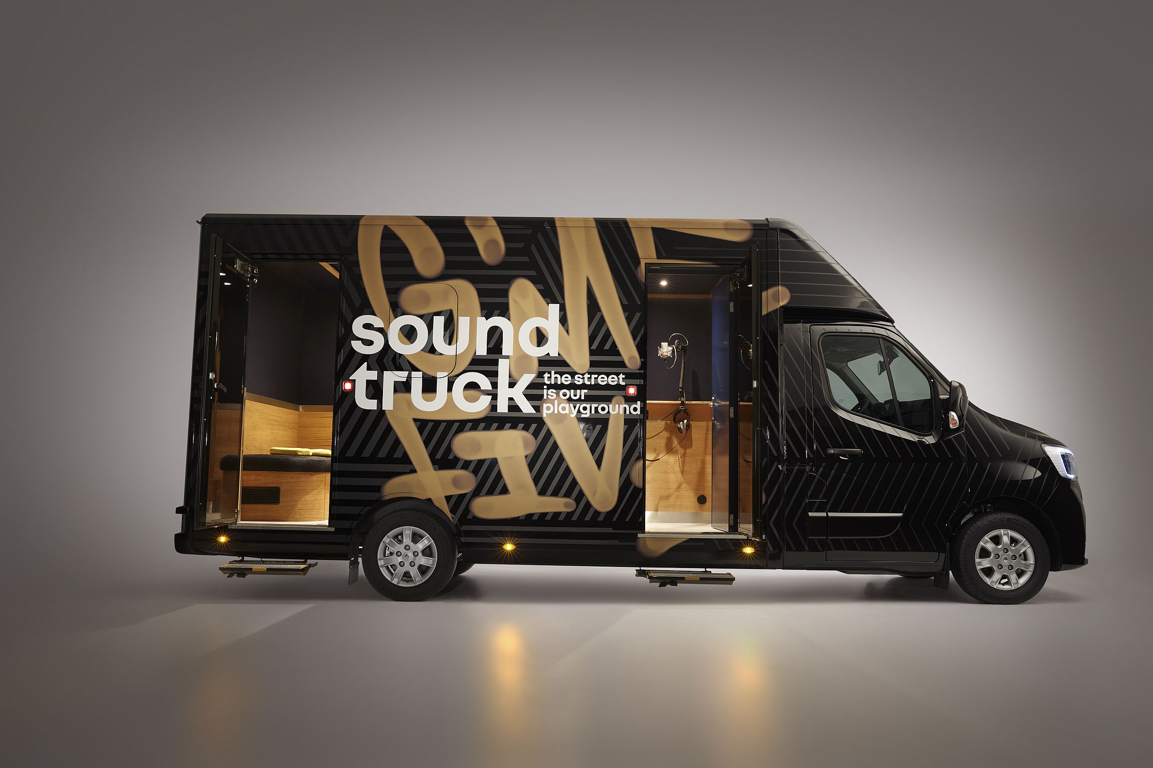 Na primavera de 2023, uma iniciativa de trampolim móvel deu a cinco talentosos finalistas a oportunidade de gravar em condições profissionais – num estúdio de gravação móvel. Para desenvolver um veículo Master para este fim, a Renault trabalhou com dois parceiros, um especializado em acústica arquitetónica, a Red House, e o outro em carroçarias, o Pro Car.