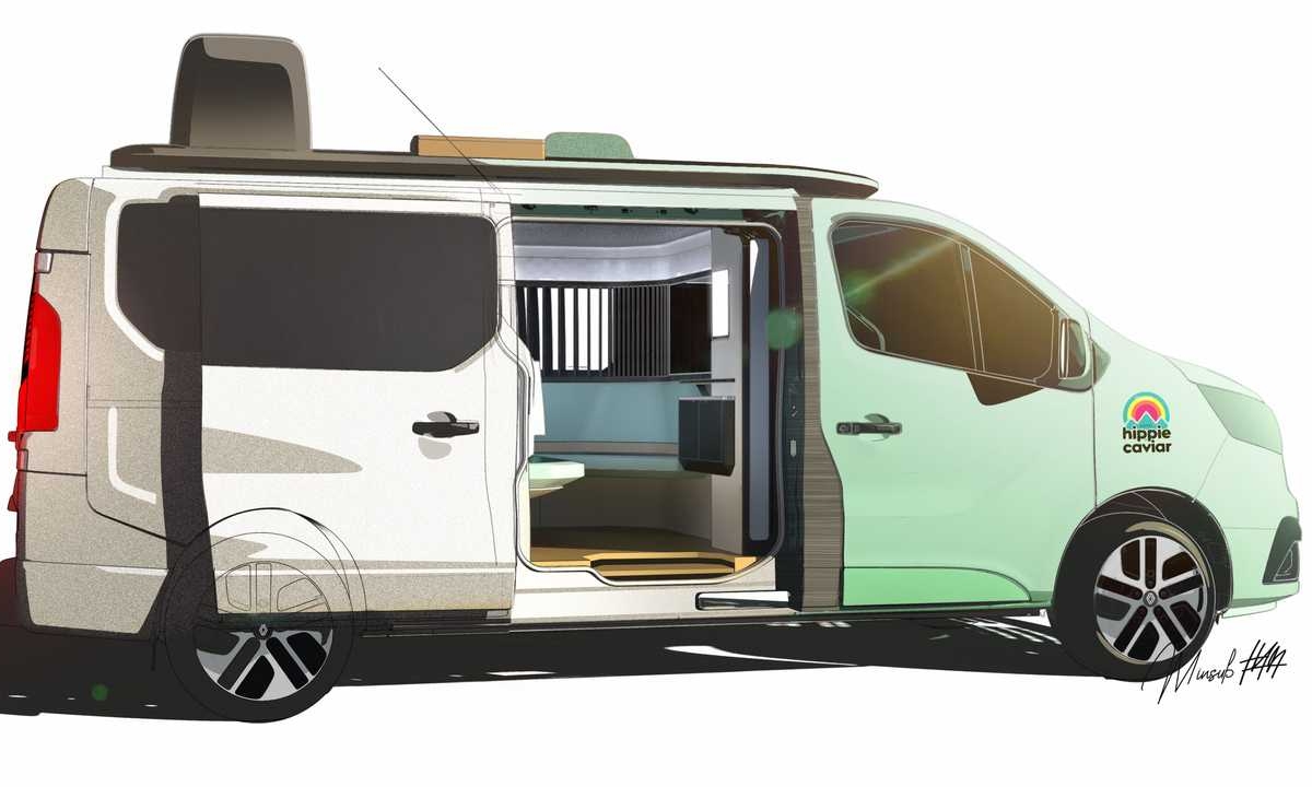 Com base no bem-sucedido furgão Trafic, a Renault está a criar uma nova gama de veículos para multiusos com posicionamento premium, dirigida a uma clientela VIP, em que se inclui esta surpreendente Hotel Hippie Caviar é uma das mais, que não é mais do que uma luxuosa autocaravana que a marca francesa do losango desenhou a pensar nos quartos de hotéis mais requintados.