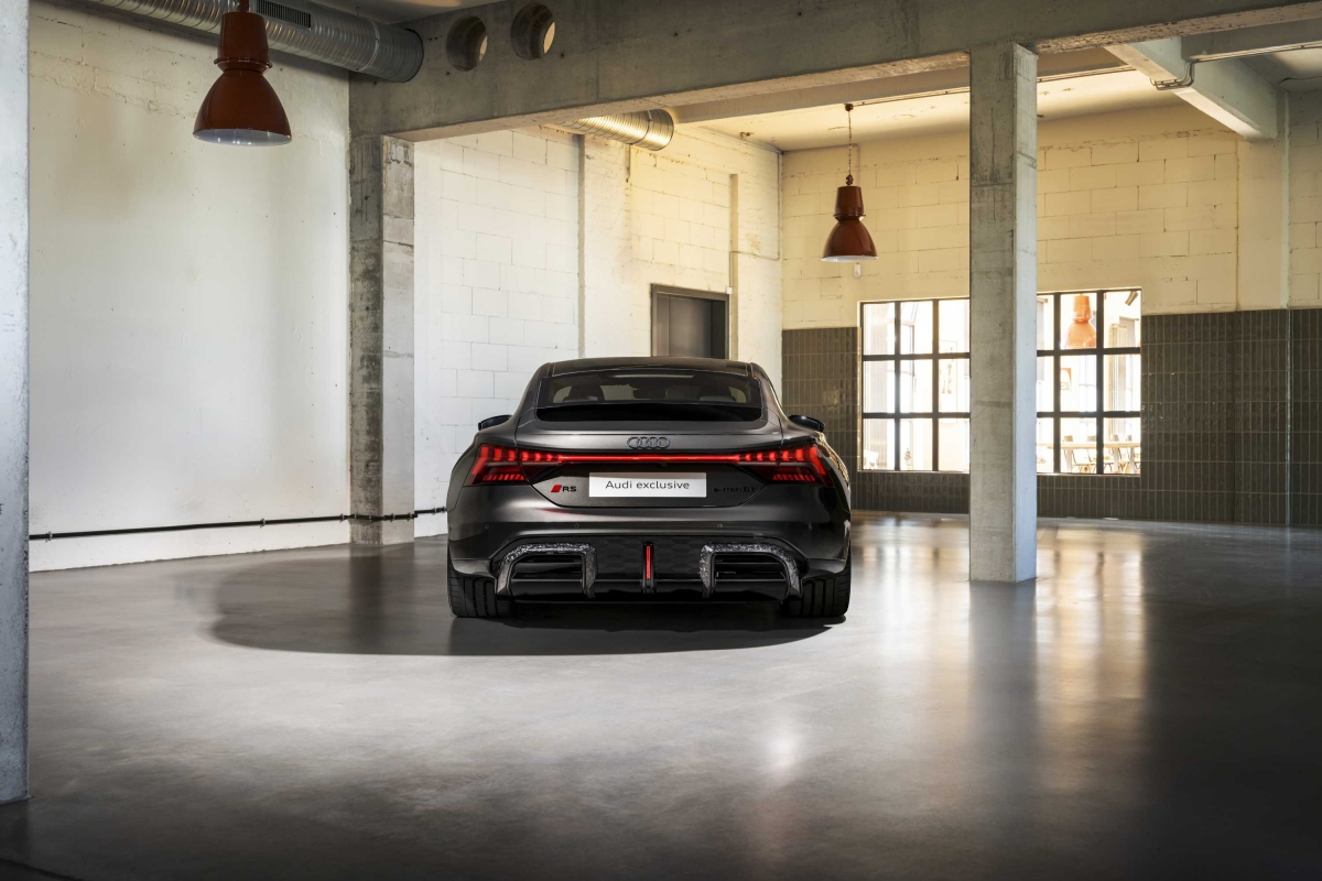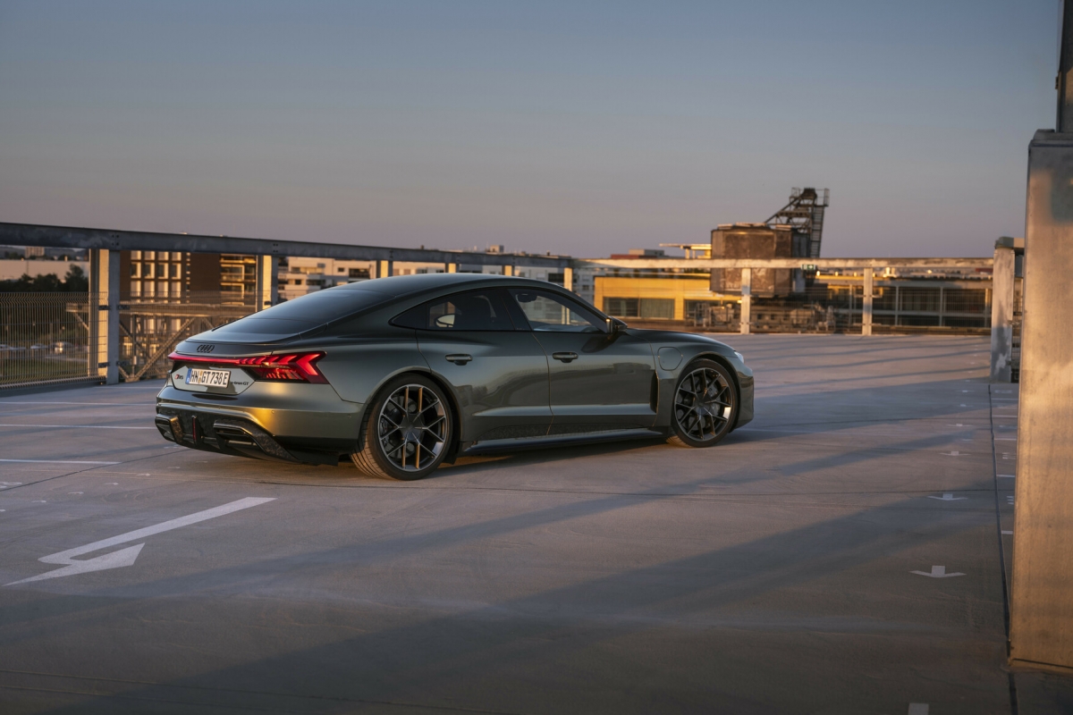 Os elementos de design do Audi RS e-tron GT Performance são altamente distintos. O teto em carbono escurecido em mate, opcional, pode ser combinado com outros detalhes em carbono, que a Audi está a utilizar pela primeira vez e são exclusivos para esta variante. O acabamento em carbono é aplicado nos revestimentos do para-choques, na faixa lateral, em partes do difusor e nos espelhos laterais. A nova cor exterior Bedford Green também está disponível especificamente para o RS e-tron GT Performance.