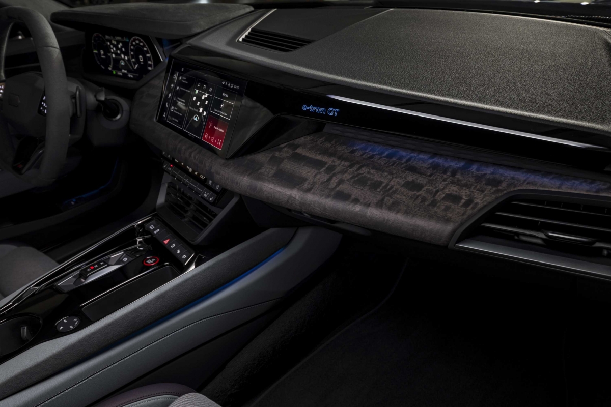 No interior, um dos destaques é o novo e exclusivo pacote de design, que inclui costuras em Serpentine Green para combinar com o exterior Bedford Green e bancos ajustáveis em 18 posições. Os acabamentos decorativos também estão disponíveis em carbono mate para corresponder ao exterior. Em homenagem ao Audi Avant RS 2 de 1994, cujos mostradores analógicos também eram brancos, o RS e-tron GT Performance inclui um indicador de potência e um velocímetro brancos como características digitais especiais.