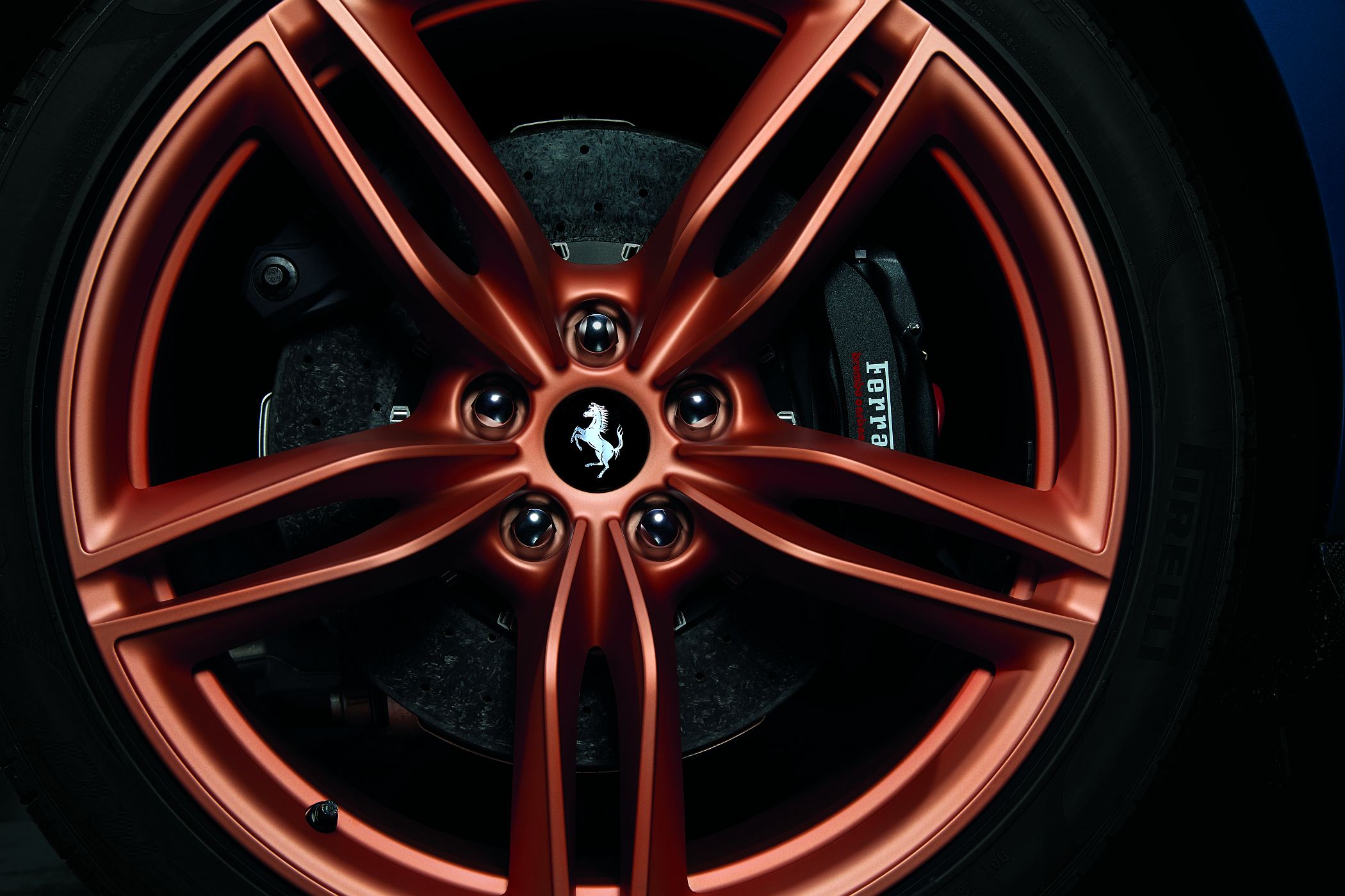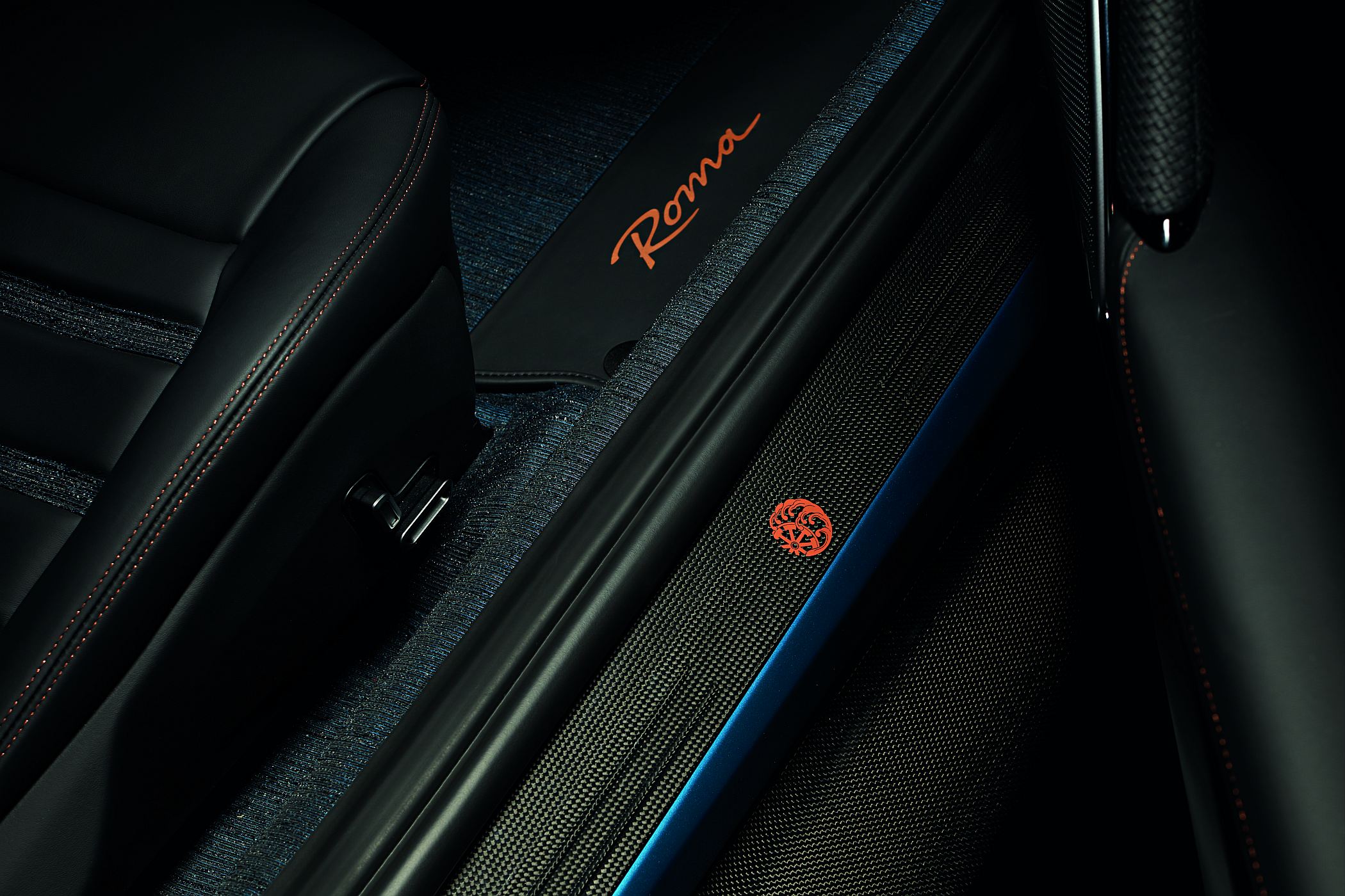 A placa exclusiva do carro no apoio de braço central e nas soleiras das portas é feita de kamon personalizado, que no Japão era usado para indicar origem, linhagem familiar e status. Projetado por Kyogen, representa uma roda de um carro de boi (transporte popular entre aristocratas durante o período Heian, 794-1185) combinado com os oito pistões do motor V8 da Roma para formar os raios. O tema numérico continua nas oito cristas de ondas que circundam a roda, símbolos de boa sorte, poder e resistência.