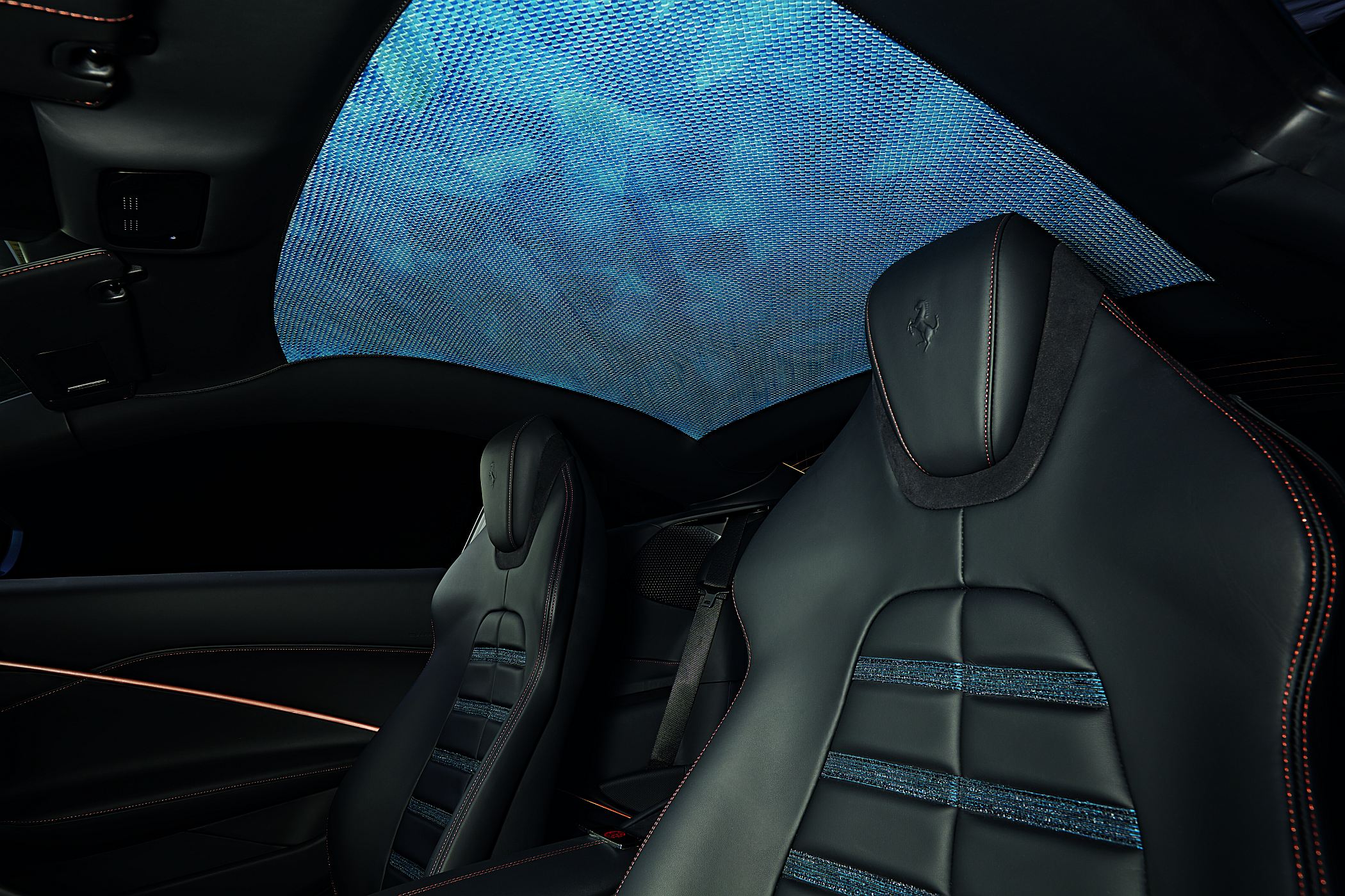 O tema índigo foi transferido para o teto da habitáculo. Composto por duas peles tingidas de índigo de Asai Roketsu, de Kyoto, um tem uma cor plana única projetada para combinar com a composição de cores do carro e o outro pintado à mão usando o método roketsu, que remonta ao século VIII. É um método de coloração de cera que forma padrões intrincados repetidos com uma única cor e foi usado para decorar a seda ou o algodão de quimonos e obis. As peles foram então enviadas para a Itália, onde artesãos italianos as cortaram em fitas e as teceram à mão em um processo chamado intreccio para formar uma peça de arte elegante e única.