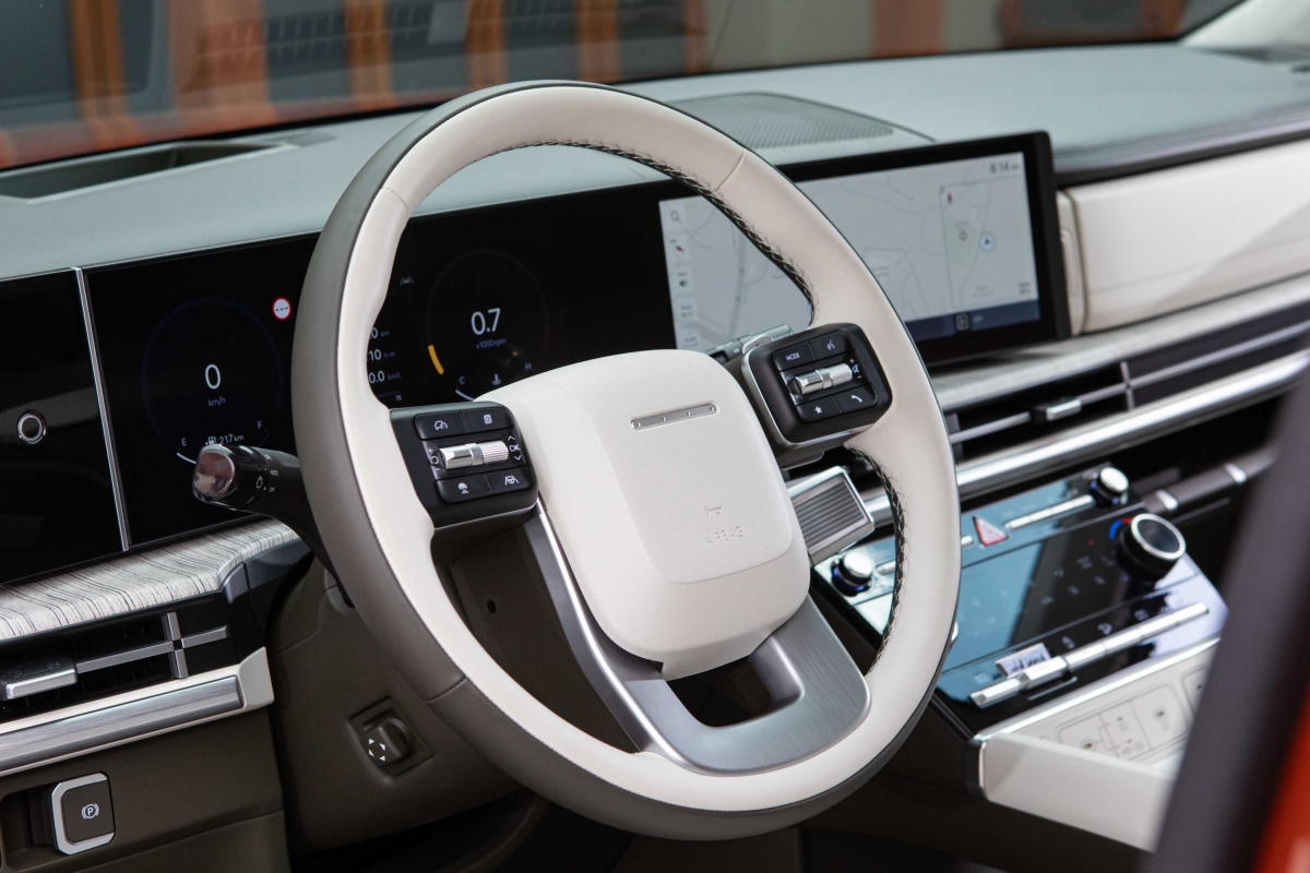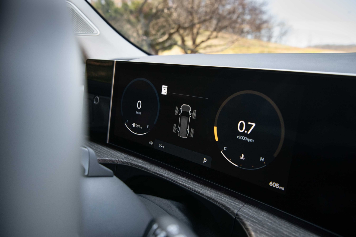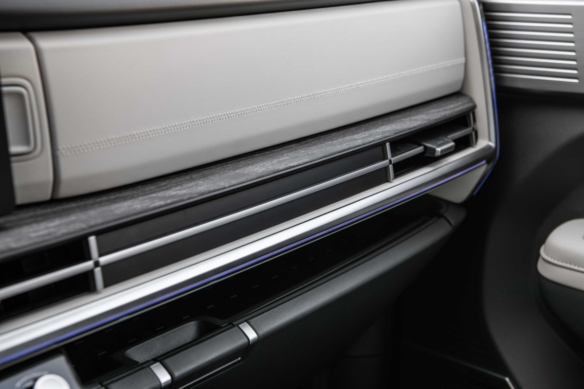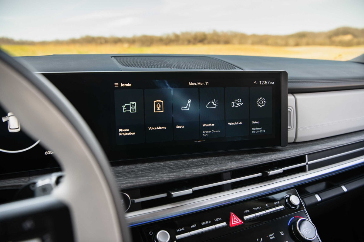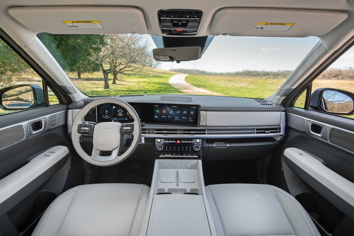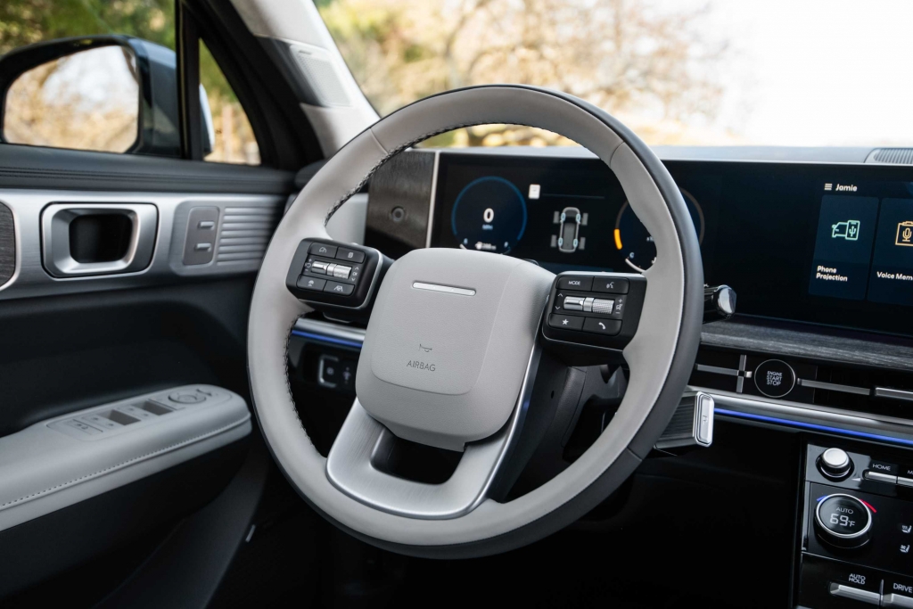 O novo tabliê do Hyundai Santa Fe segue a linha do Tucson – como tivemos já oportunidade de salientar na apresentação do SUV do segmento C –, com um design horizontal, mas a consola central apresenta uma diferença. Embora o uso de plásticos duros seja notável, não compromete o ambiente de luxo a bordo. Um destaque é o ecrã curvo panorâmico, considerado o primeiro da sua classe, que integra o painel de instrumentos digital de 12,3 polegadas e o sistema de infoentretenimento, conferindo um toque sofisticado ao interior do modelo. Com a crescente tendência minimalista nos novos modelos de carros, talvez o Santa Fe pudesse ter optado por esconder alguns botões, oferecendo uma aparência ainda mais limpa e moderna.